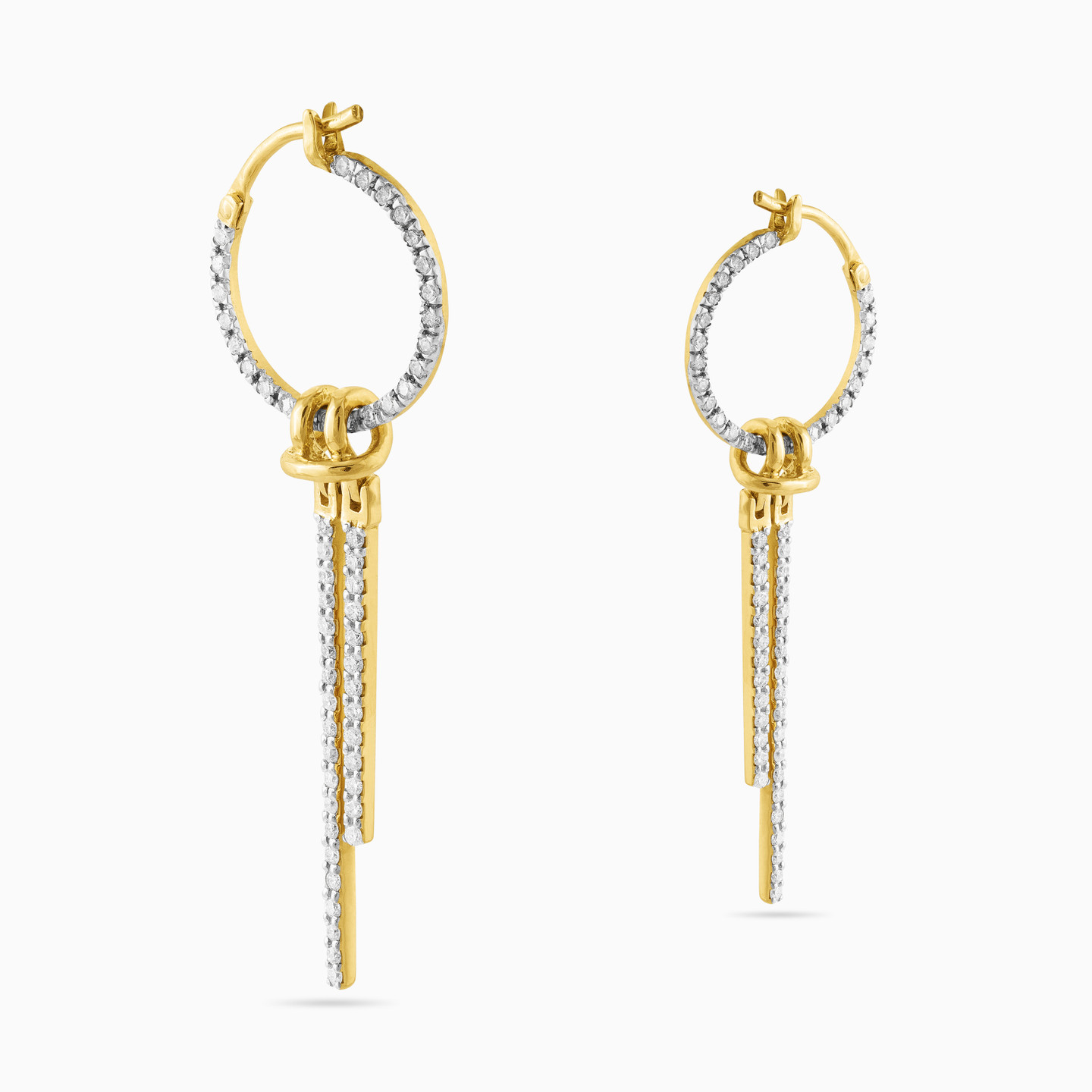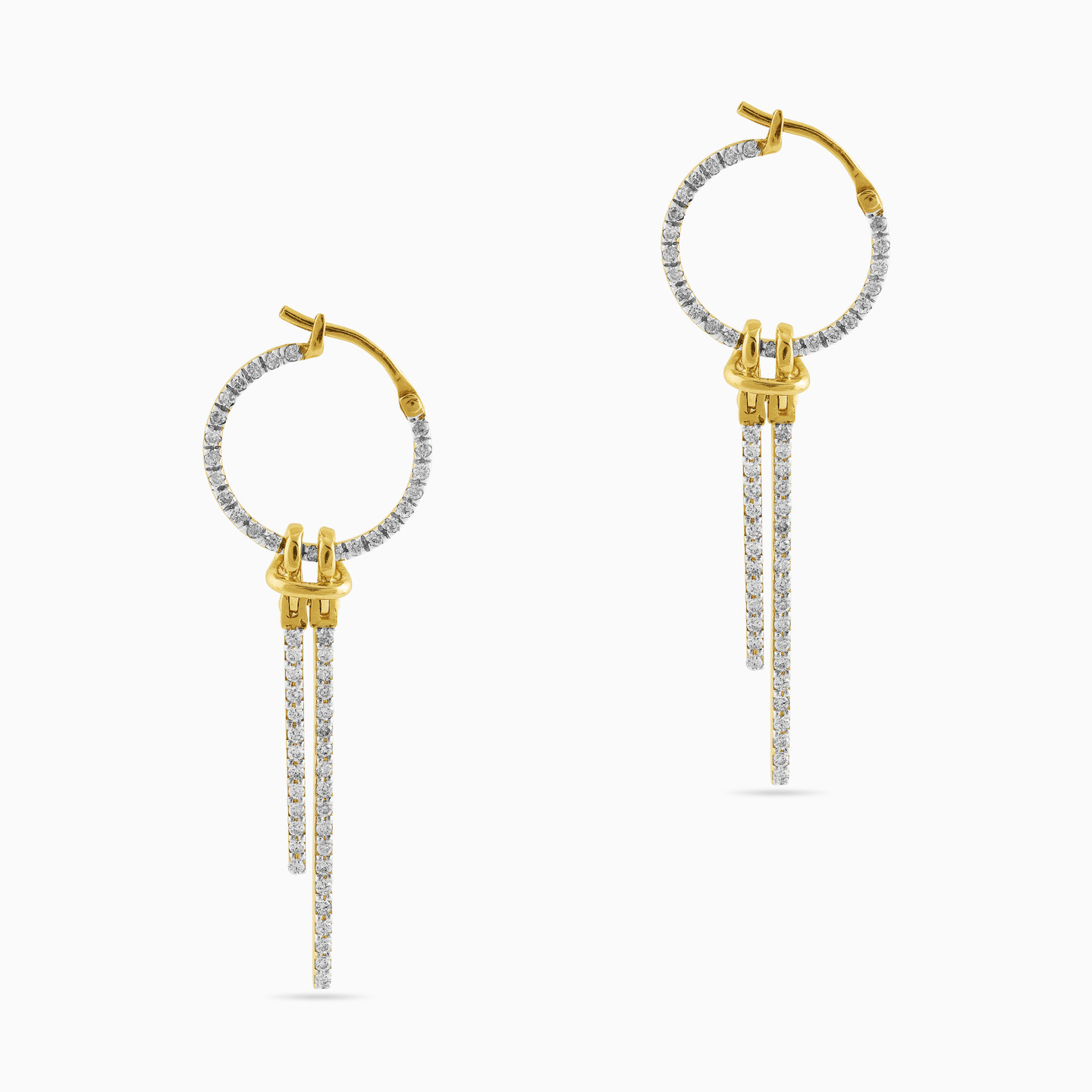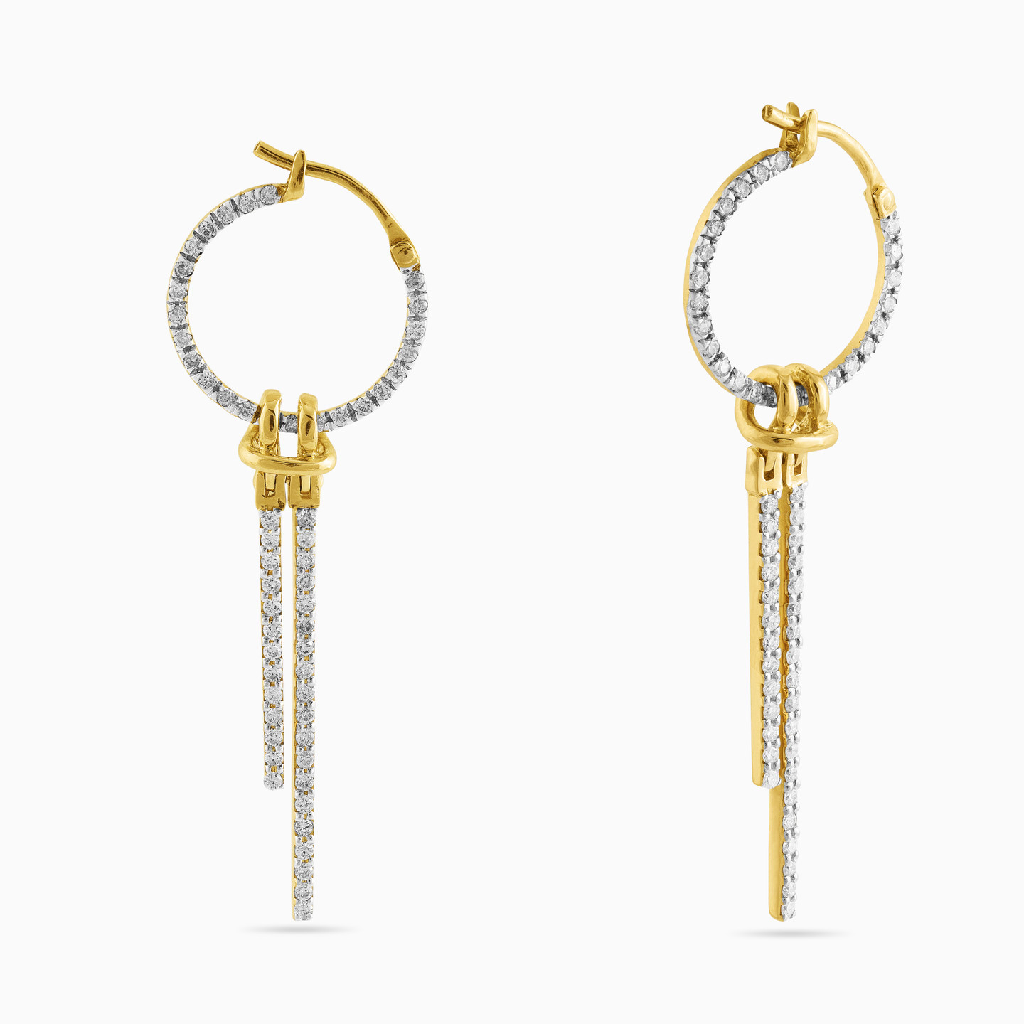 Indulge in irresistible luxury with these mesmerizing drop earrings from L'azurde Diamonds. Beautifully cast in 18-karat yellow gold, these gorgeous drop earrings feature large diamond-studded circles holding two diamond rods that drop from a shimmering yellow gold knot. These magnificent earrings boast 0.88-carats of brilliant-cut diamonds in a masterpiece of a design. You'll make every occasion momentous by wearing these eye-catching beauties.