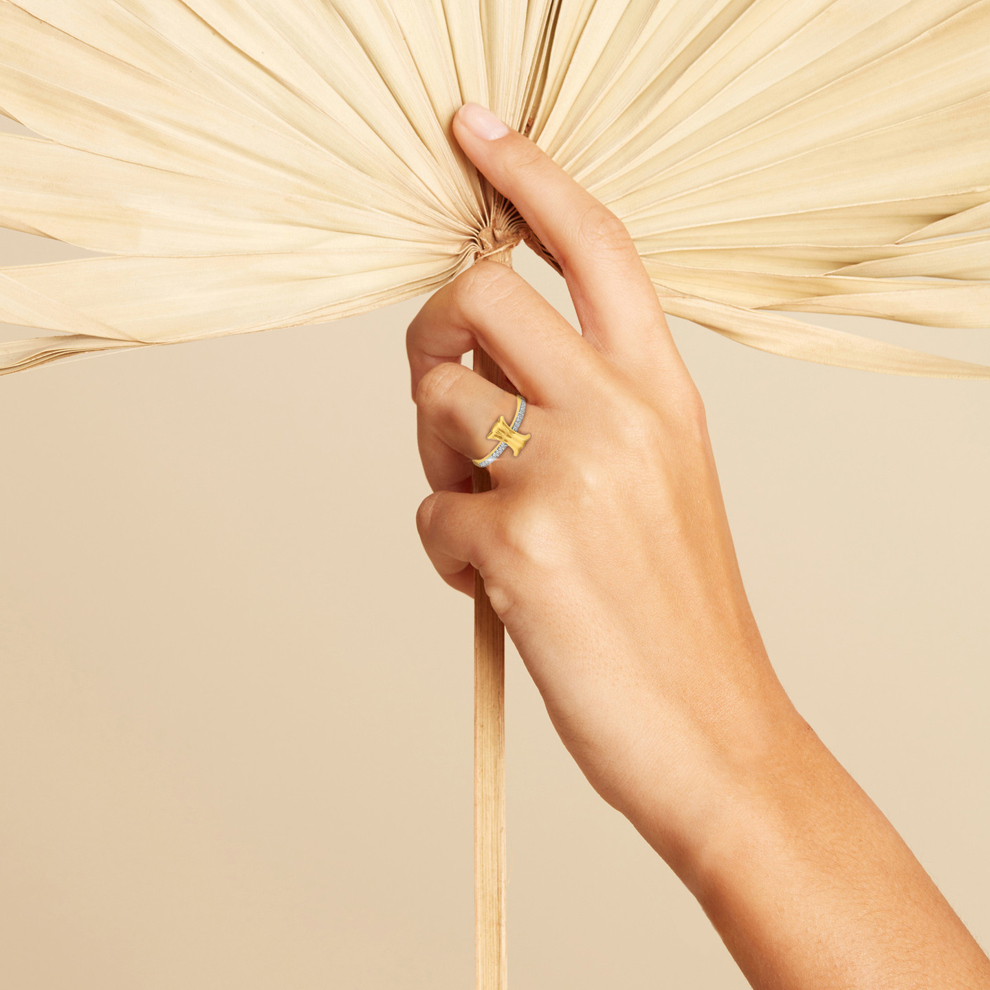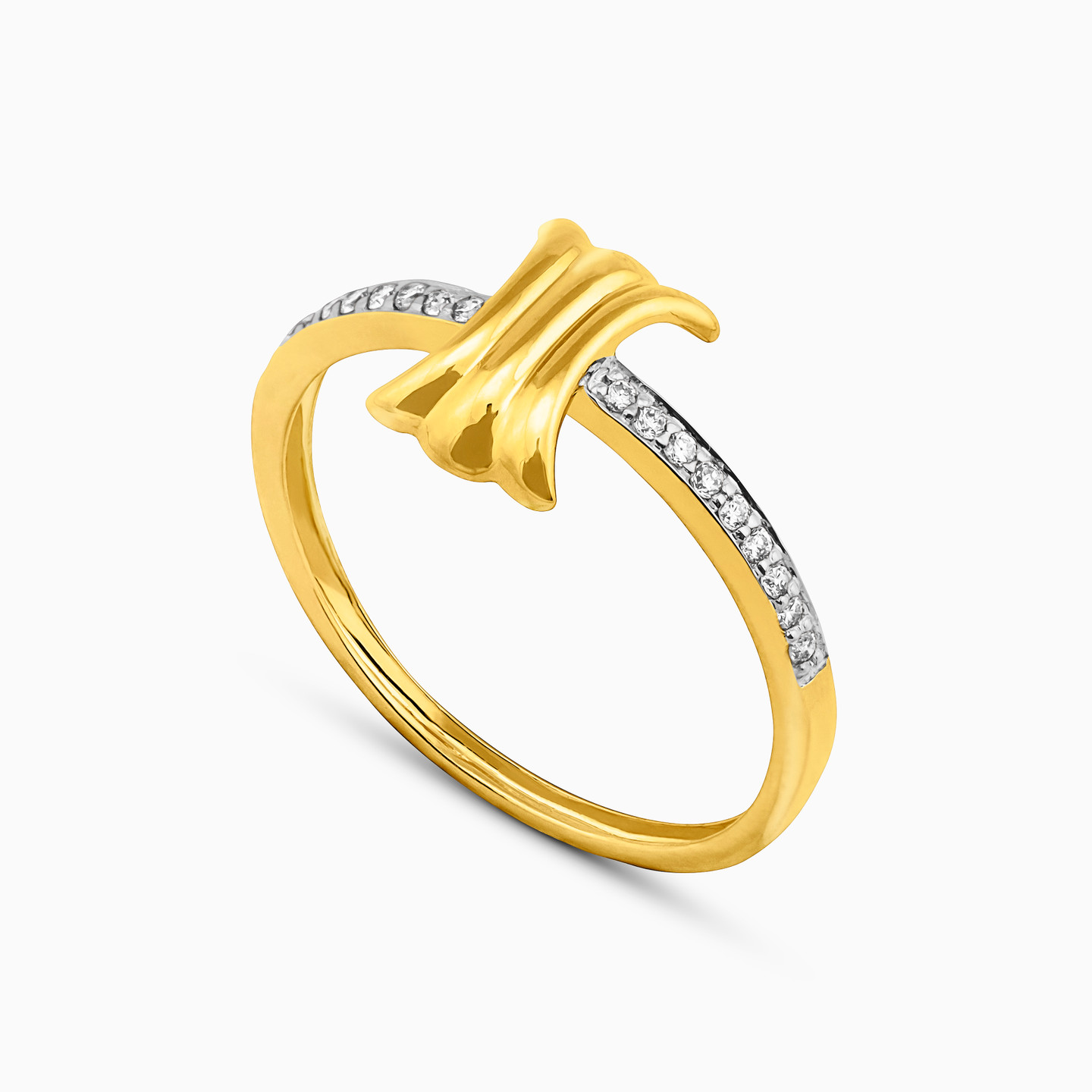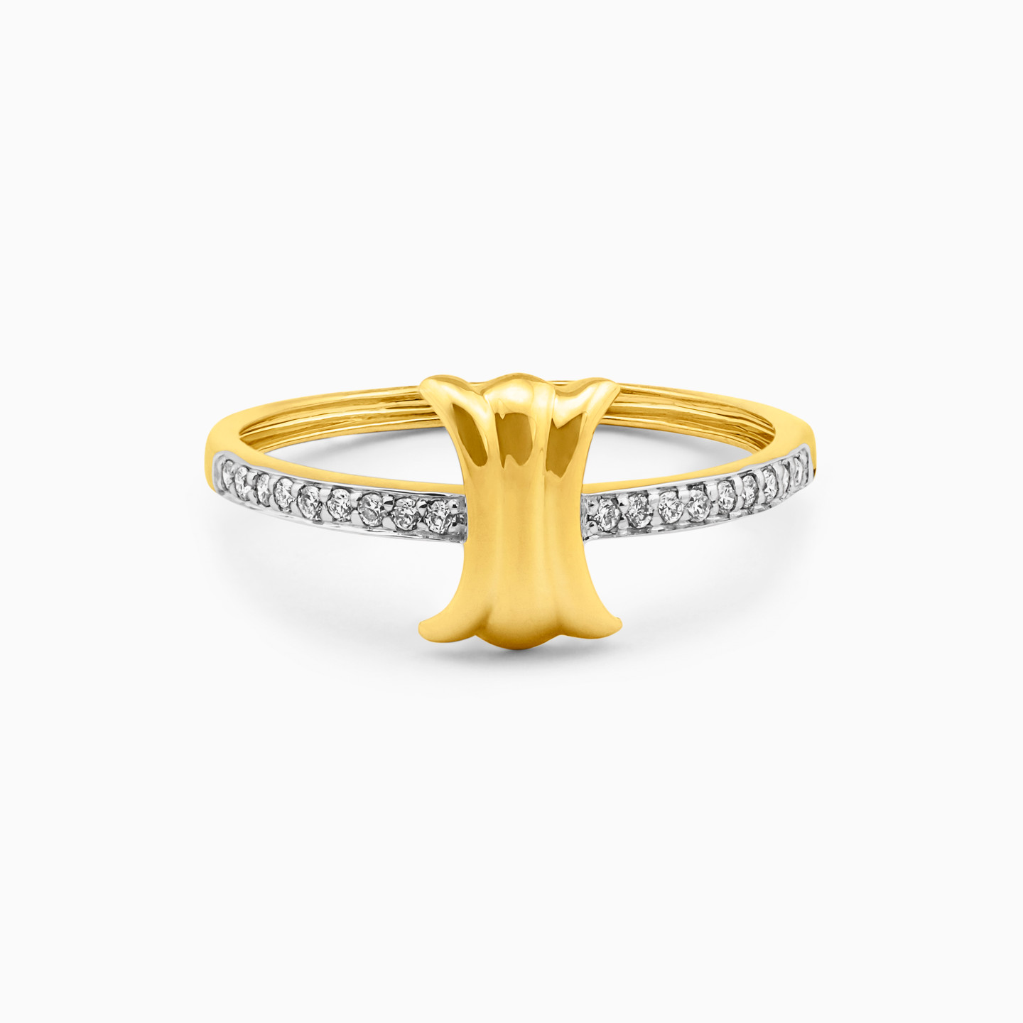 Meet this 18-karat yellow gold sparkler from L'azurde Diamonds – just what you need for your finger! This chic and minimalistic ring features a sleek band dazzling with brilliant-cut pave diamonds, and a funky abstract-shaped motif with ribbed lines, showcasing a unique style. The minimal design makes this ring perfect for everyday wear.