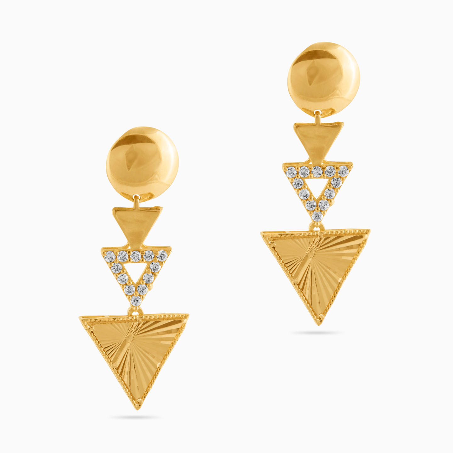 A killer pair of drop earrings from L'azurde Gold when you want to dress to kill. Designed with a solid round base with a lovely dangle of intricately crafted cascading triangle motifs studded with cubic zirconia, these 18-karat yellow gold earrings add the right amount of fun and style to any party outfit.