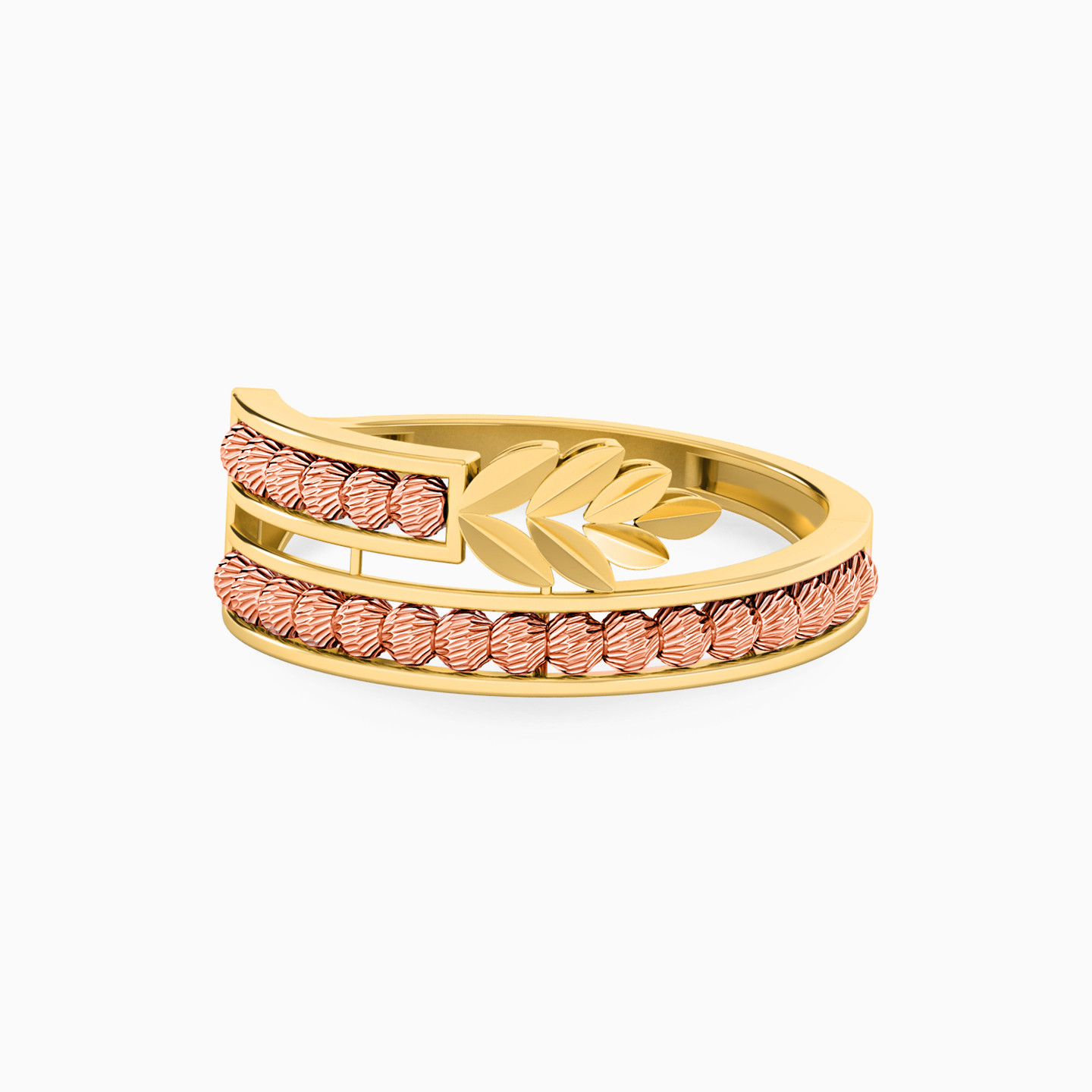 We've fallen in love with this number from L'azurde Gold for its subtle blend of femininity and grace. The rose gold textured beads adorn the slim 21-karat yellow gold band as it goes around in a swirl and ends with a leaf motif. This ring will look wonderful worn at a stylish daytime soiree or with a luxurious evening gown.
