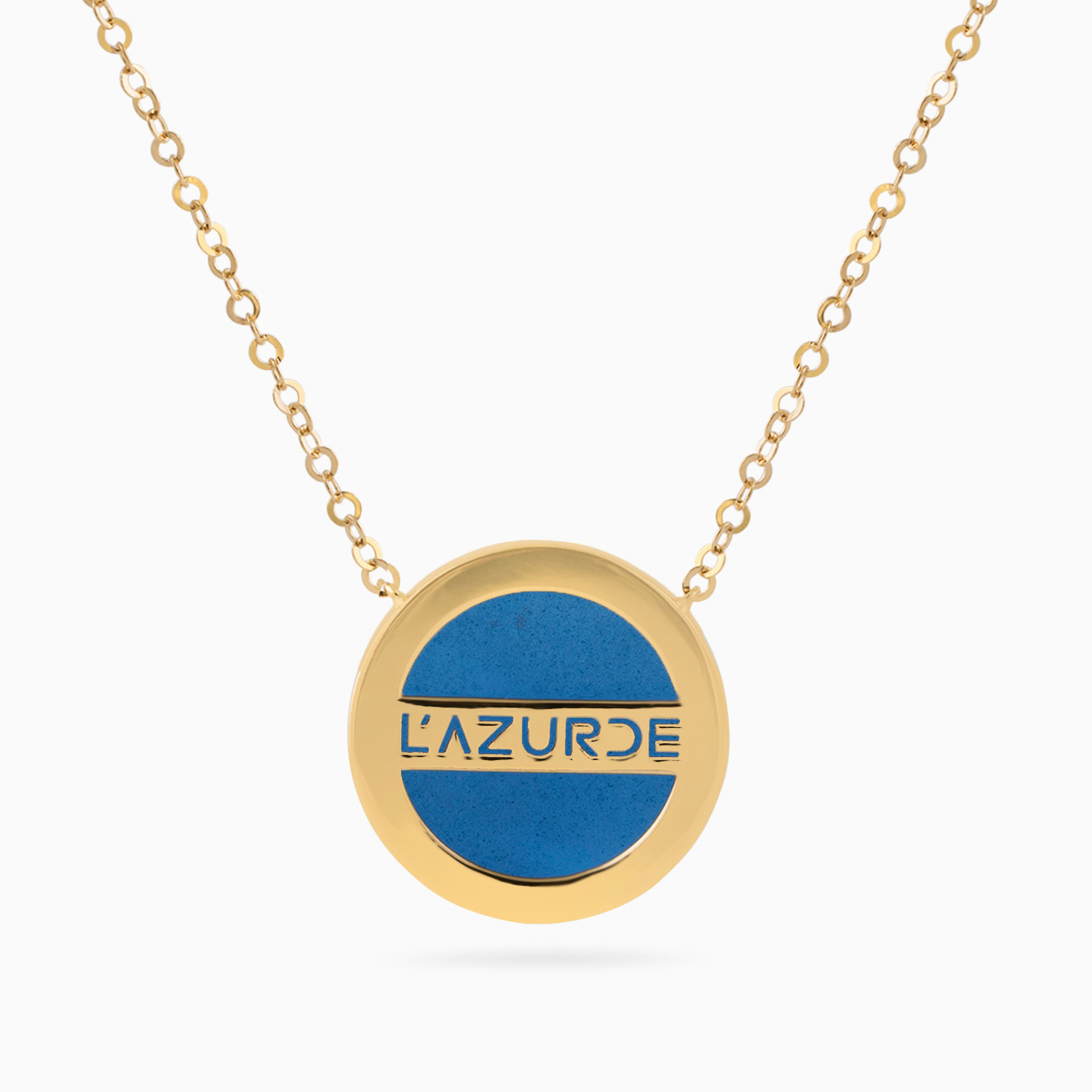 Spell out chic style with this iconic necklace from L'azurde Gold. The 18-karat yellow gold pendant is embossed with the brand name and decked with a blue accent. Suspended from a dainty chain, this number can be worn solo or layered to suit your outfit.
