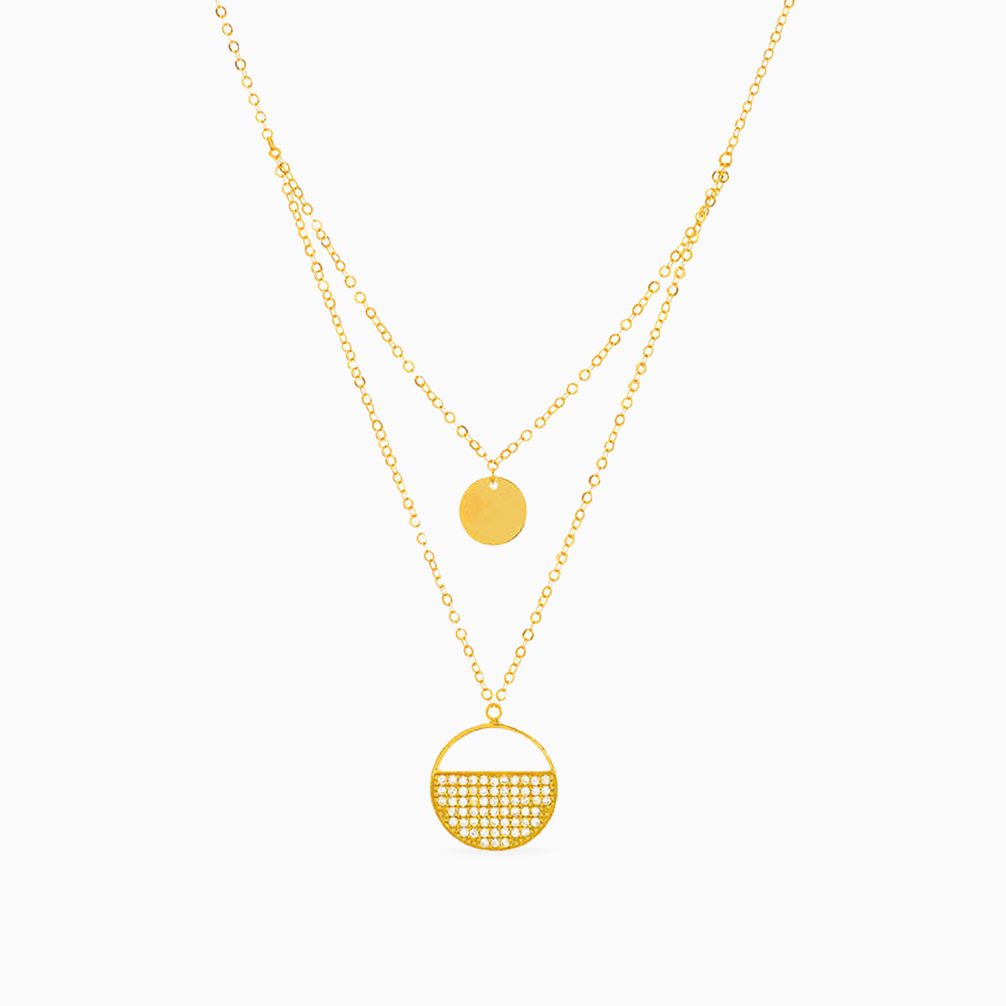 Give your look a traditional meets modern feel with this layered necklace from L'azurde Gold. Cast in 18-karat yellow gold, it features a solid circle accent and a stone studded pendant in a clean and minimal design. This piece can be effortlessly styled with AM to PM outfits and paired with petite ear studs for a complete look.