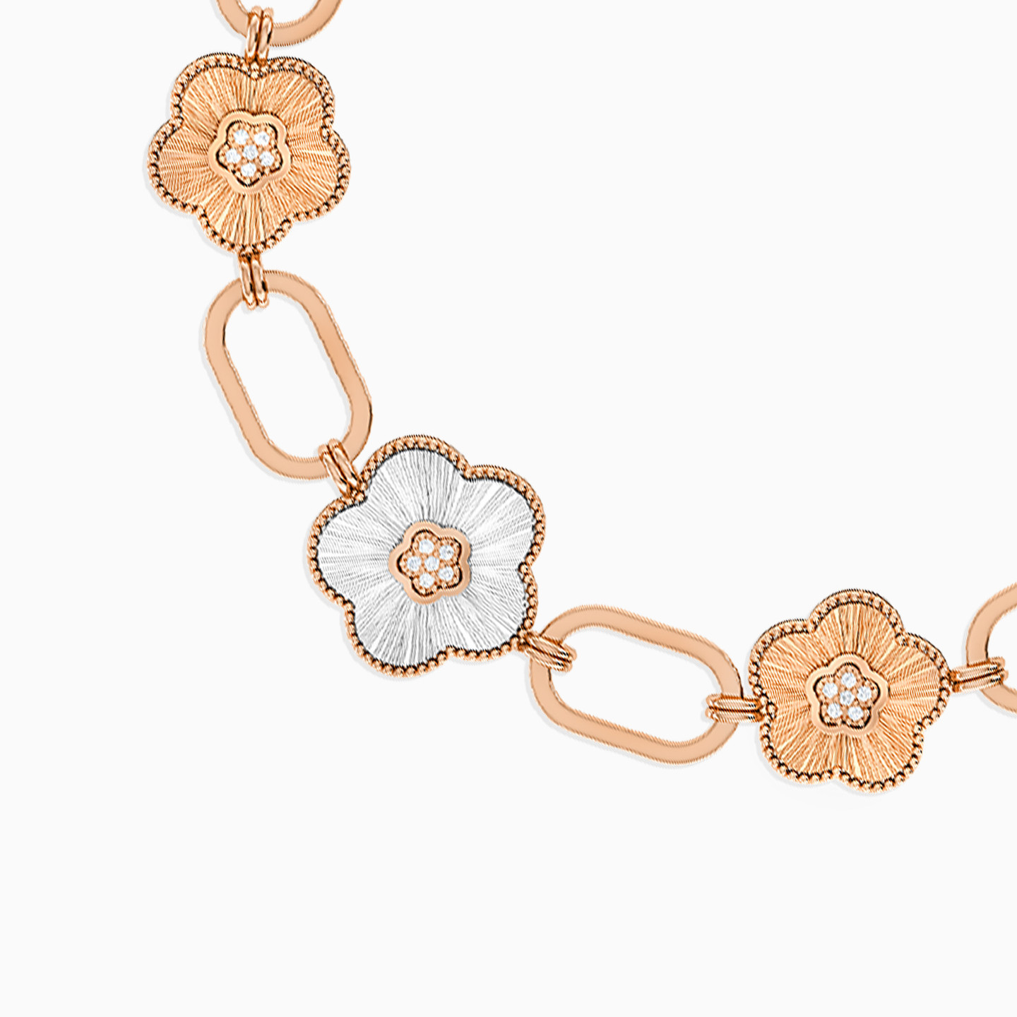 Giving your feminine charm a generous uplift, this bracelet from L'azurde Gold is nothing if not captivating. Cast in 21-karat yellow gold, it features two-tone flower motifs lightly accented with white stones, that sit alternatively between link accents. Finished with the signature spring clasp, this bracelet will shine on its own or complemented with a matching ring.
