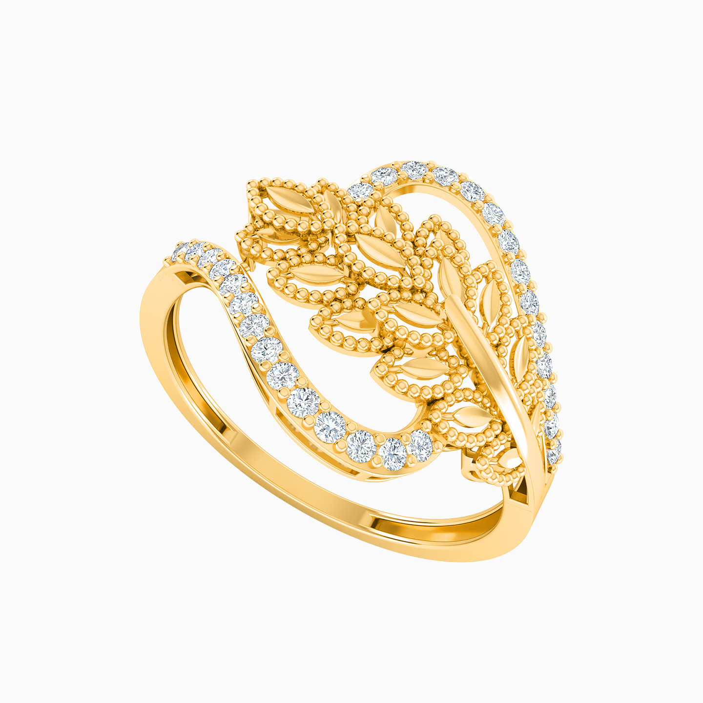 Fit to complement an equally stunning dress, this grand ring from L'azurde Gold spills exuberance like none other. We love it for the textured leaf motifs to the center and the oversized construct. Petite stones that line the curves of this ring will add a touch of sparkle to your look.