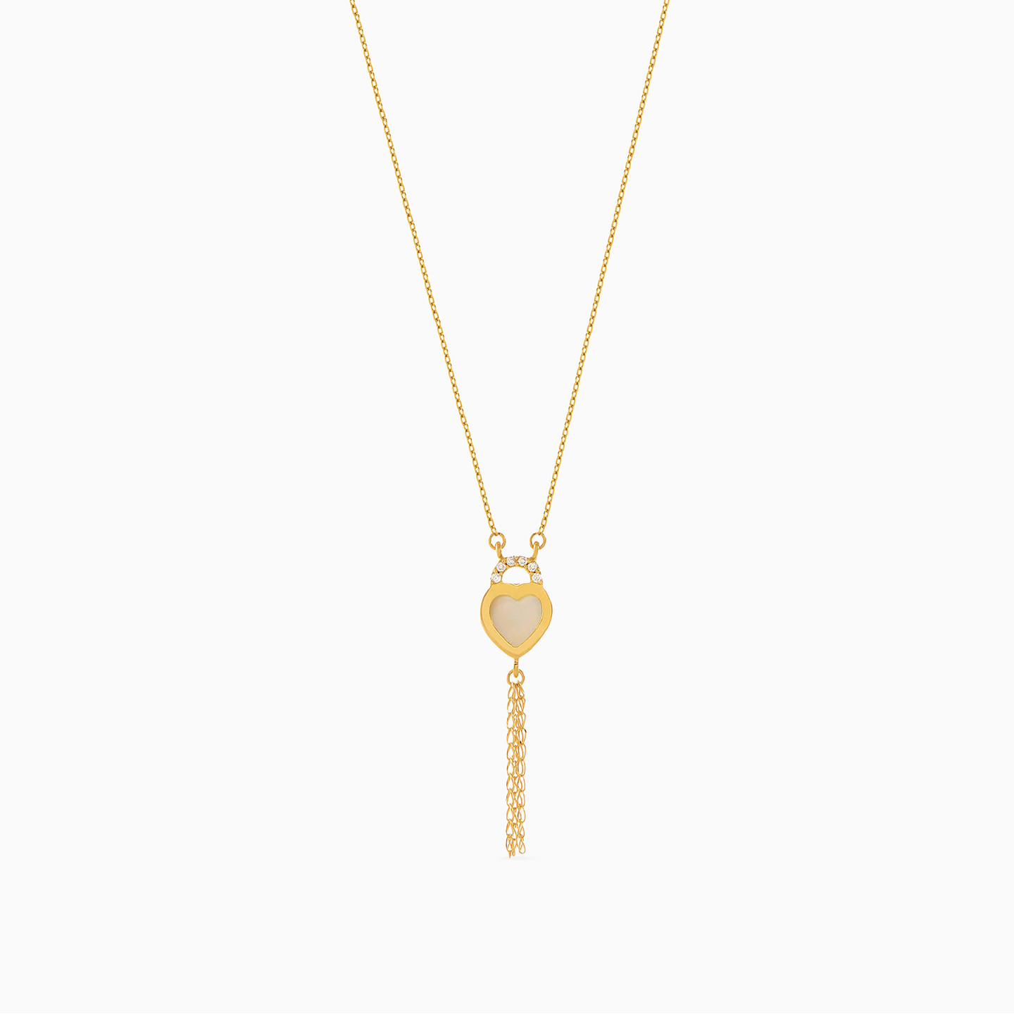 Elegance takes the front seat in this minimal necklace from L'azurde Gold. It is cast in 18-karat yellow gold and features a heart motif decked with stones to the top, a white stone center and tassels to the bottom. Pair this with a cream hued outfit or contrast it with a dark color.