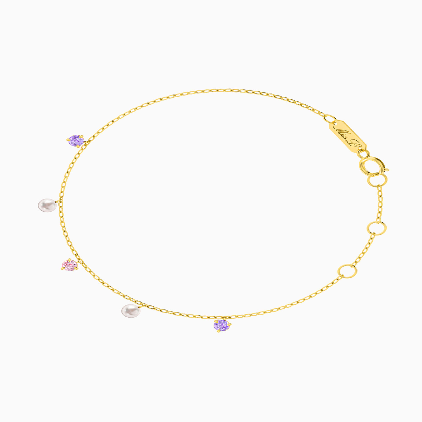 Soft sparkle, graceful rhythm. This Miss L’ bracelet features delicate pearls and pastel stones gently dancing along a fine golden chain. With every movement, it catches the light and tells a story of elegance and joy. Whether worn alone or layered, it’s the perfect gift—or keepsake—for someone who loves the little details that shine.