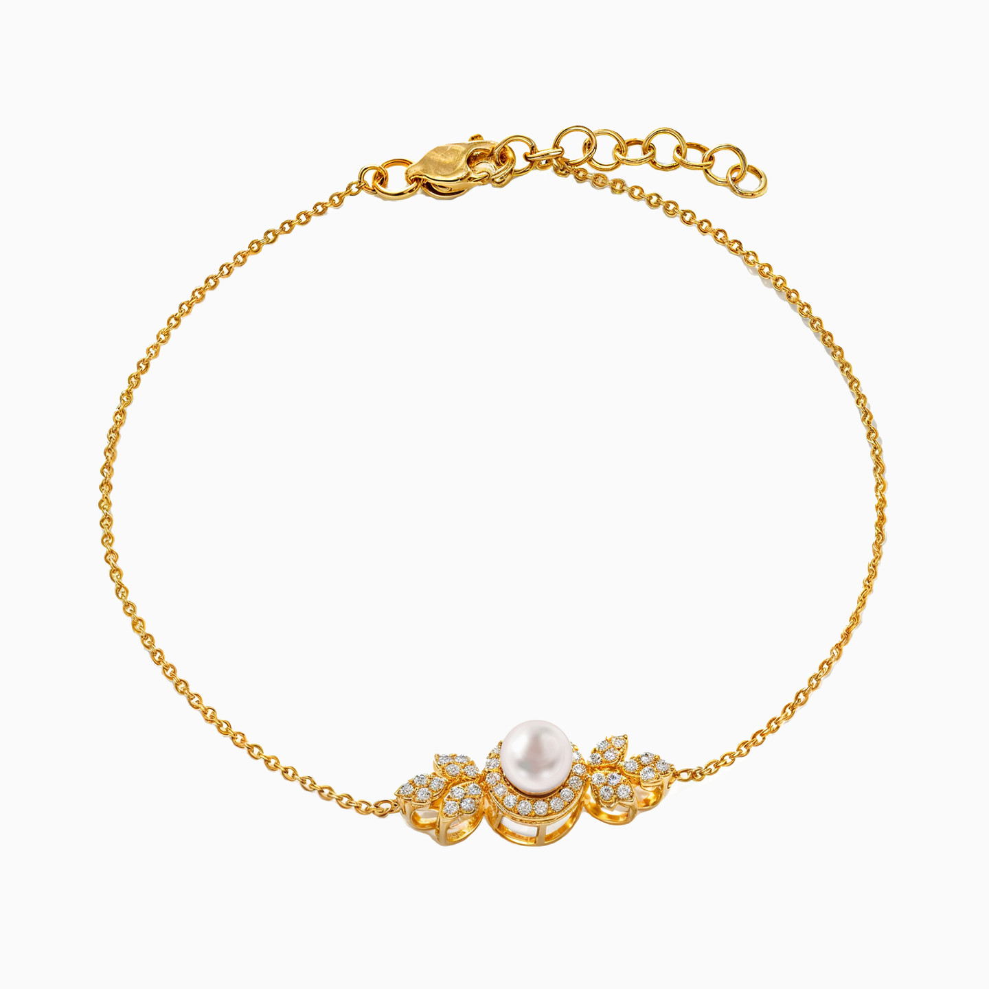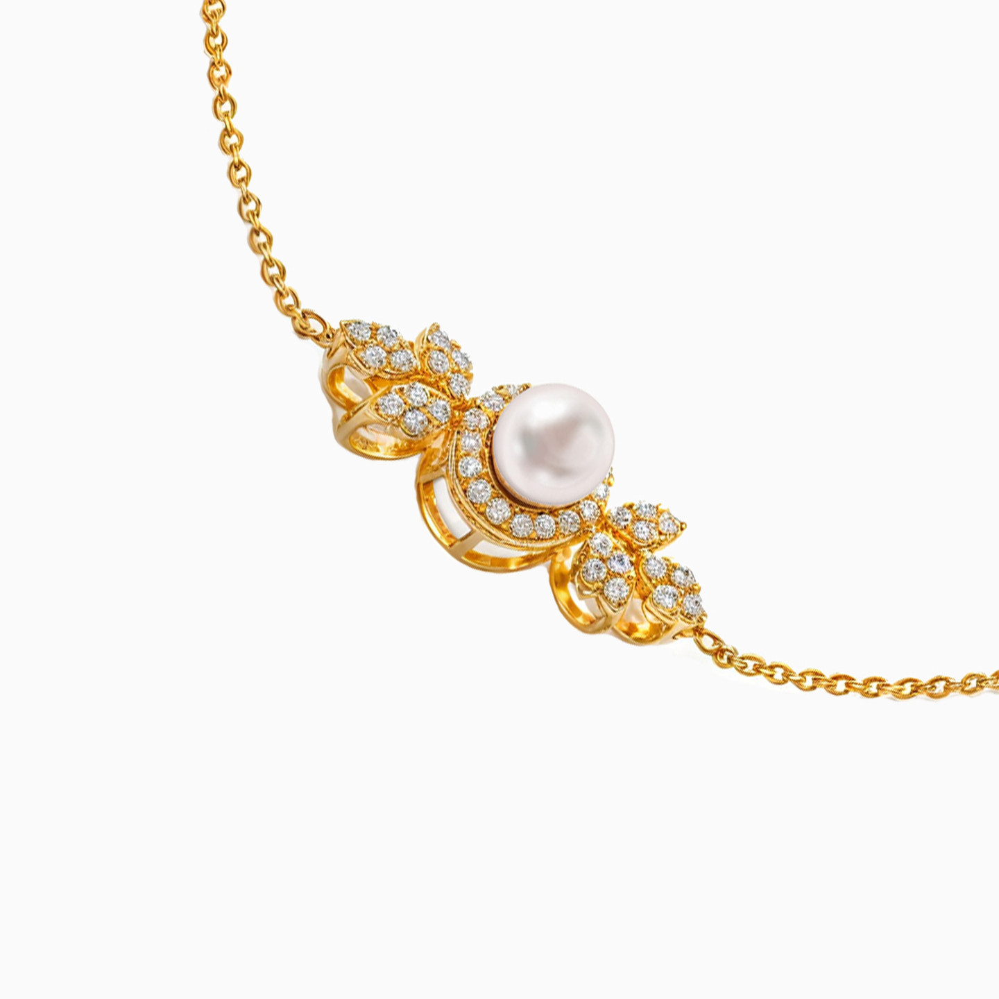 Pearls make everything look so much more elegant. This bracelet from L'azurde Gold is one such example. Featuring a gorgeous pearl that sits atop stone accented motifs on the center of your wrist, this bracelet is cast with a delicate 18-karat yellow gold chain. We recommend teaming this up with matching pearl accessories to complete the look.