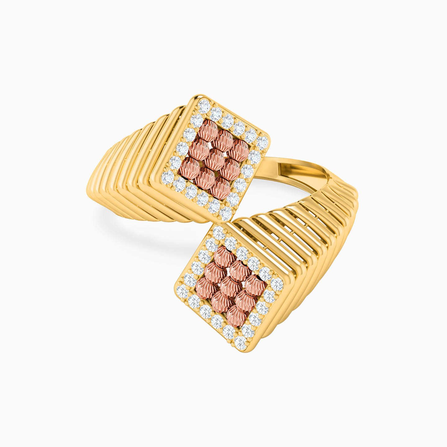 The squarish lines in this ring from L'azurde Gold give it a modern vibe. Constructed in 21-karat yellow gold, it features a textured swirl design band decked with rose gold beads and zirconia stones. A statement maker in every way, it will add an instant style uplift to your look.