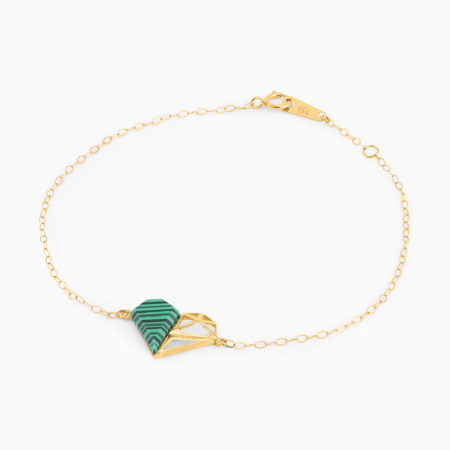 Add glamour to your wardrobe with this stunning bracelet from L’azurde Instyle. Beautifully crafted in 18-karat yellow gold, this gorgeous heart bracelet is a mix of openwork gold details on one side and an abstract-shaped striped green stone on the other. Feminine and sophisticated, this mesmerizing bracelet will add instant elegance to your everyday looks   .