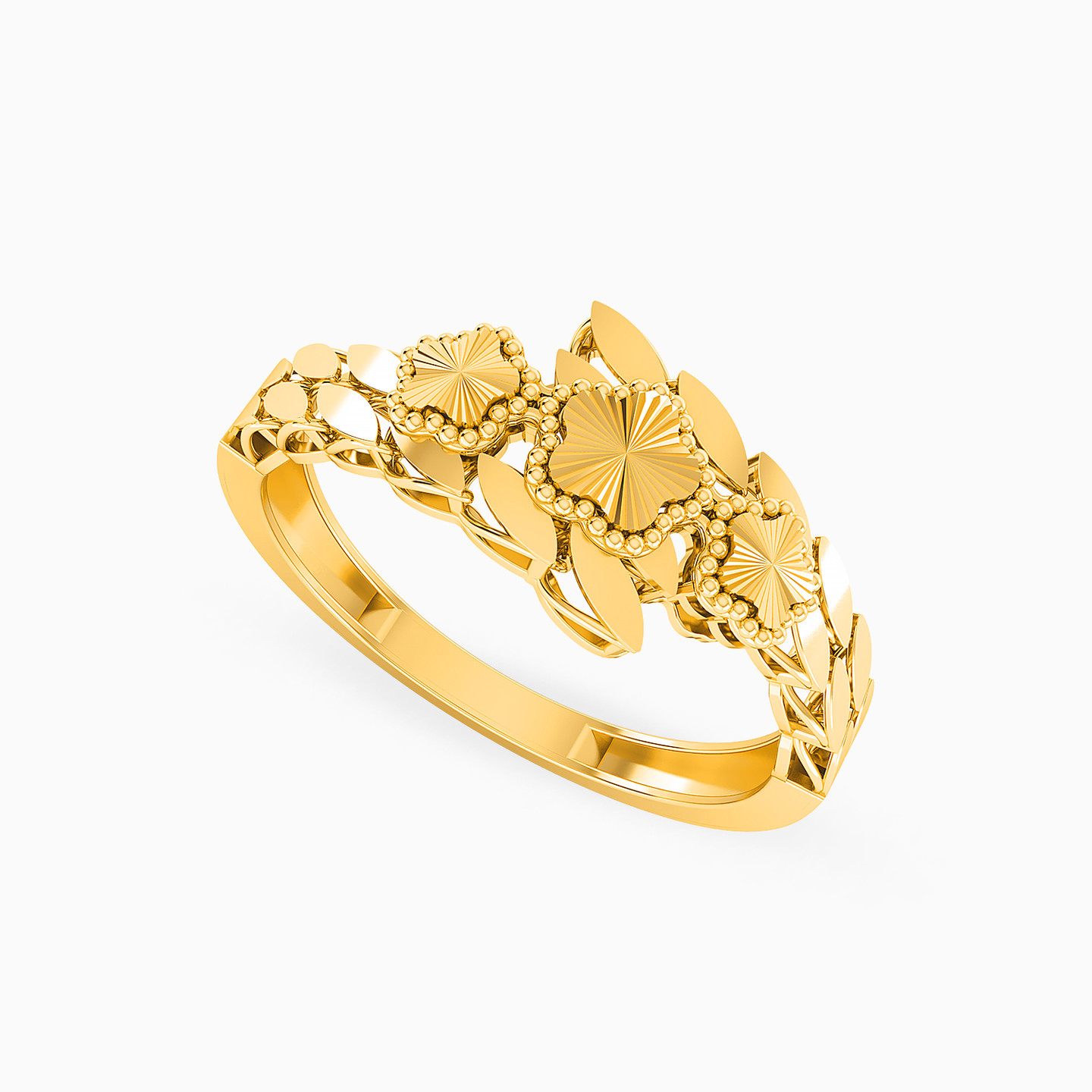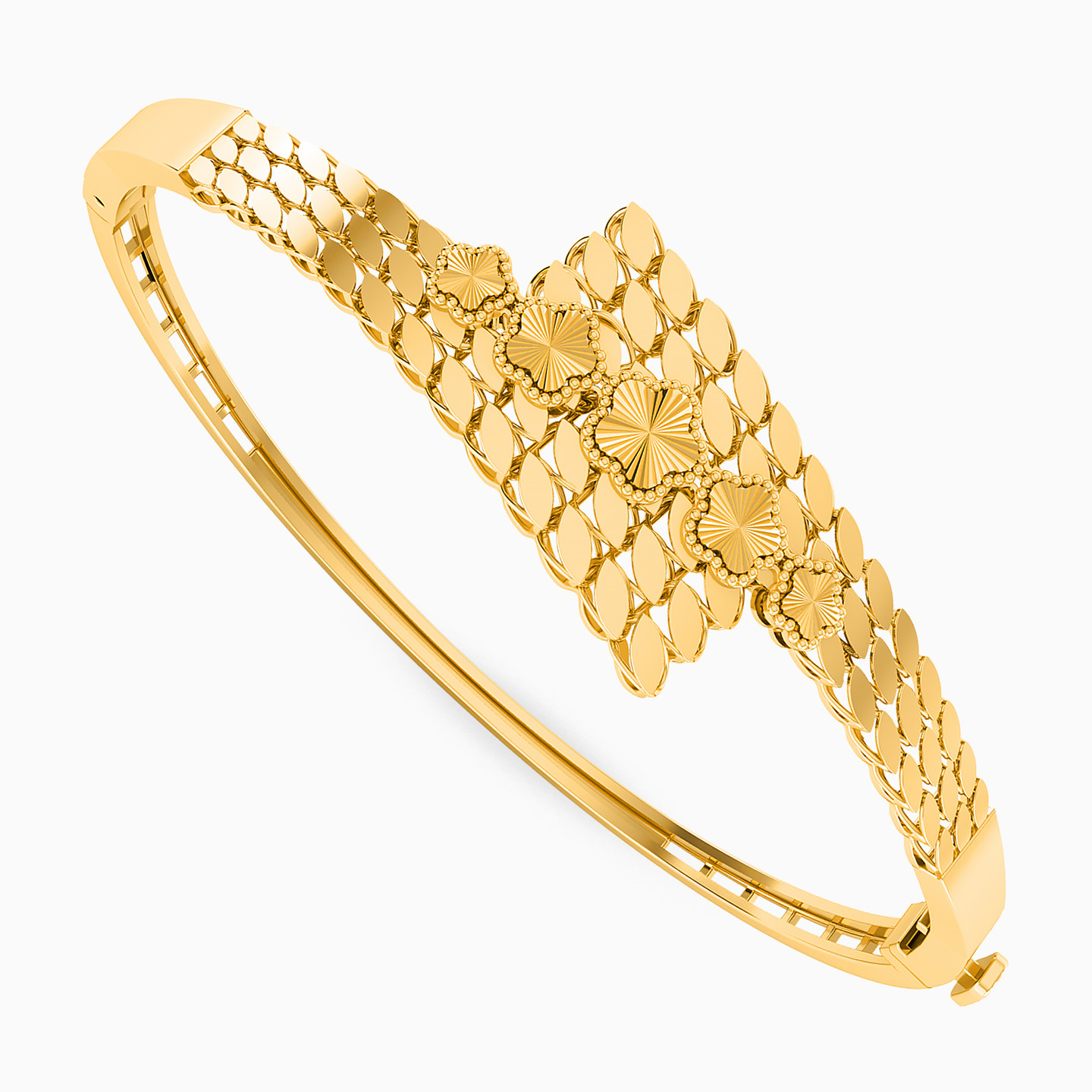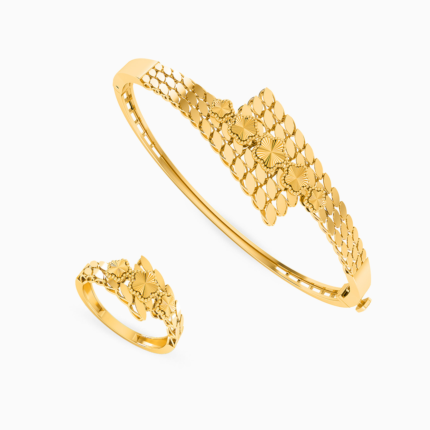 Here's something that will bring a stream of elegance to your wrist. This bangle and ring set from L'azurde Gold is designed with a broad band to the top, decked with a cluster of petite leaves and shiny flowers. Cast in 21-karat yellow gold, it's versatility will allow you to flaunt this at any work to casual occasion.