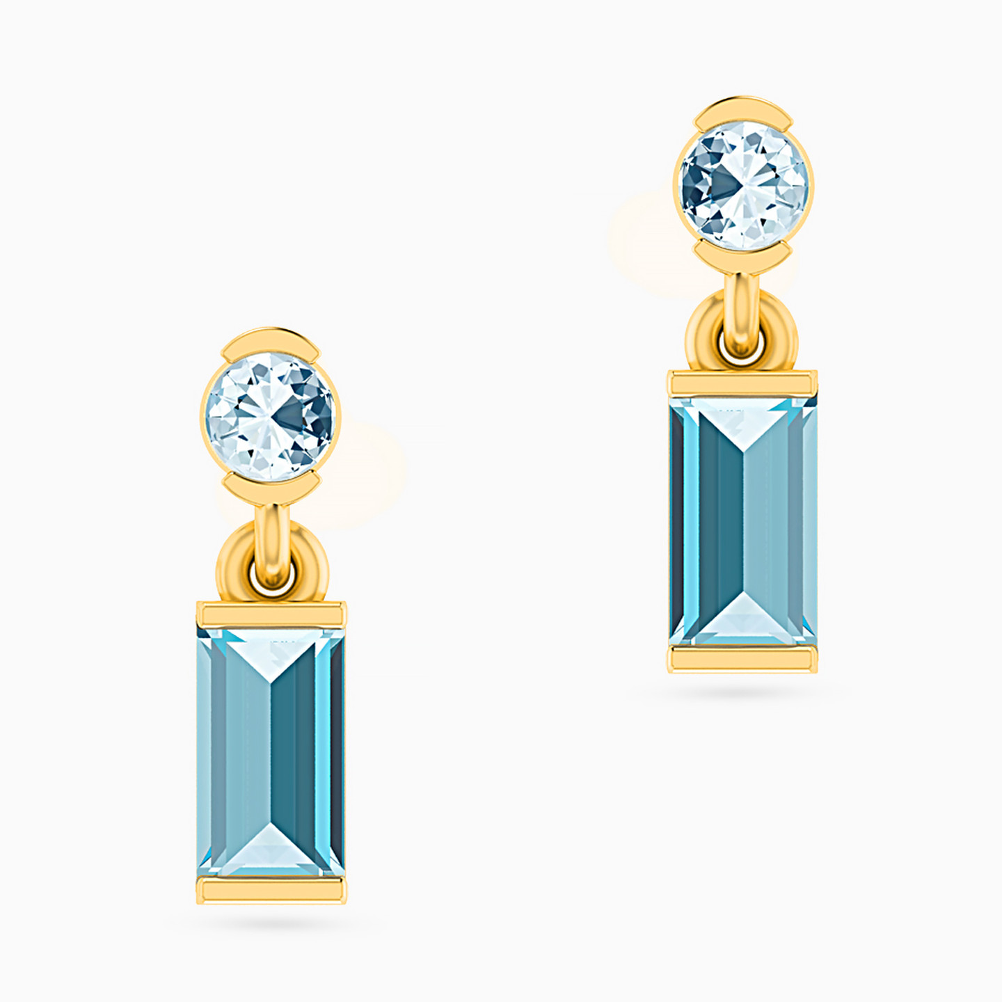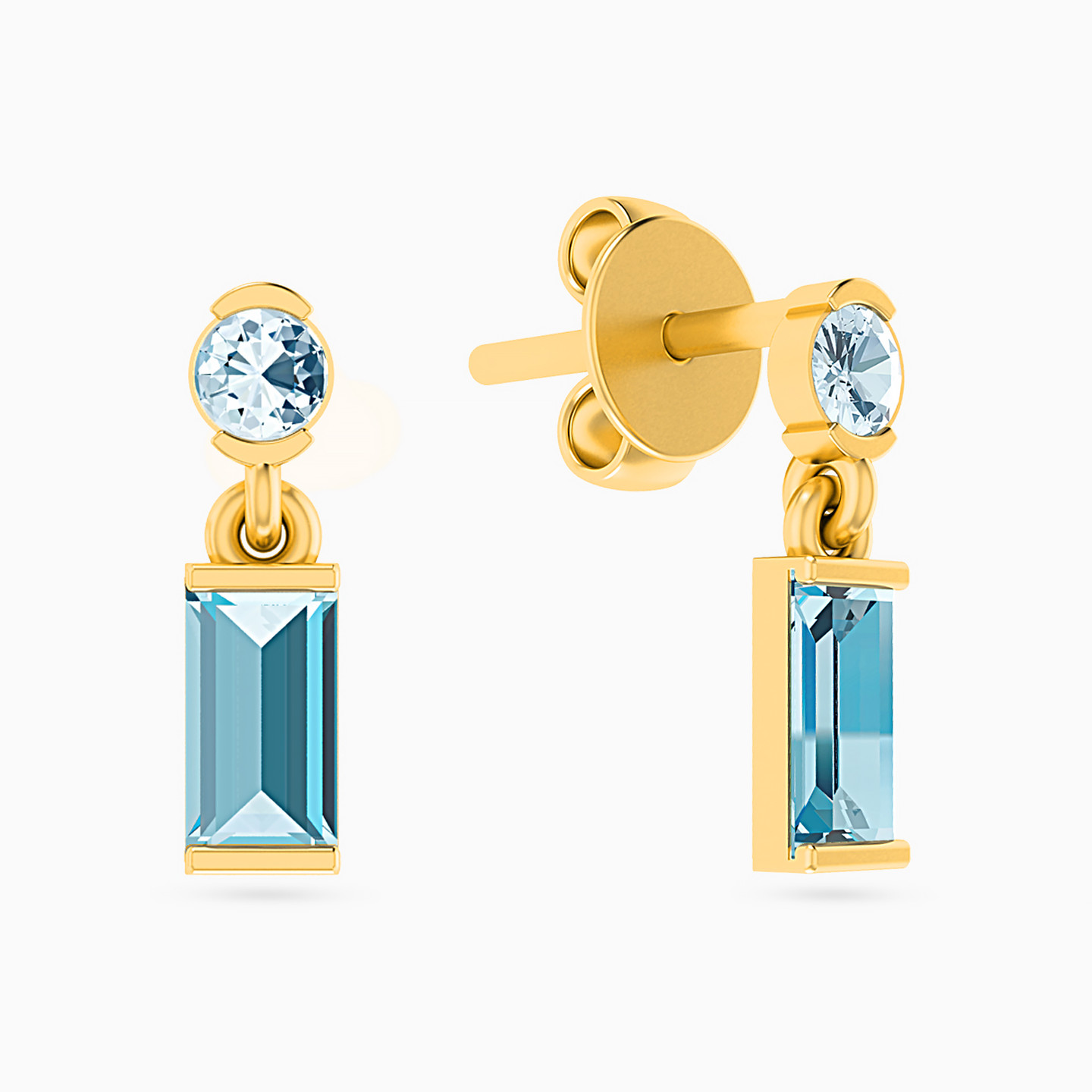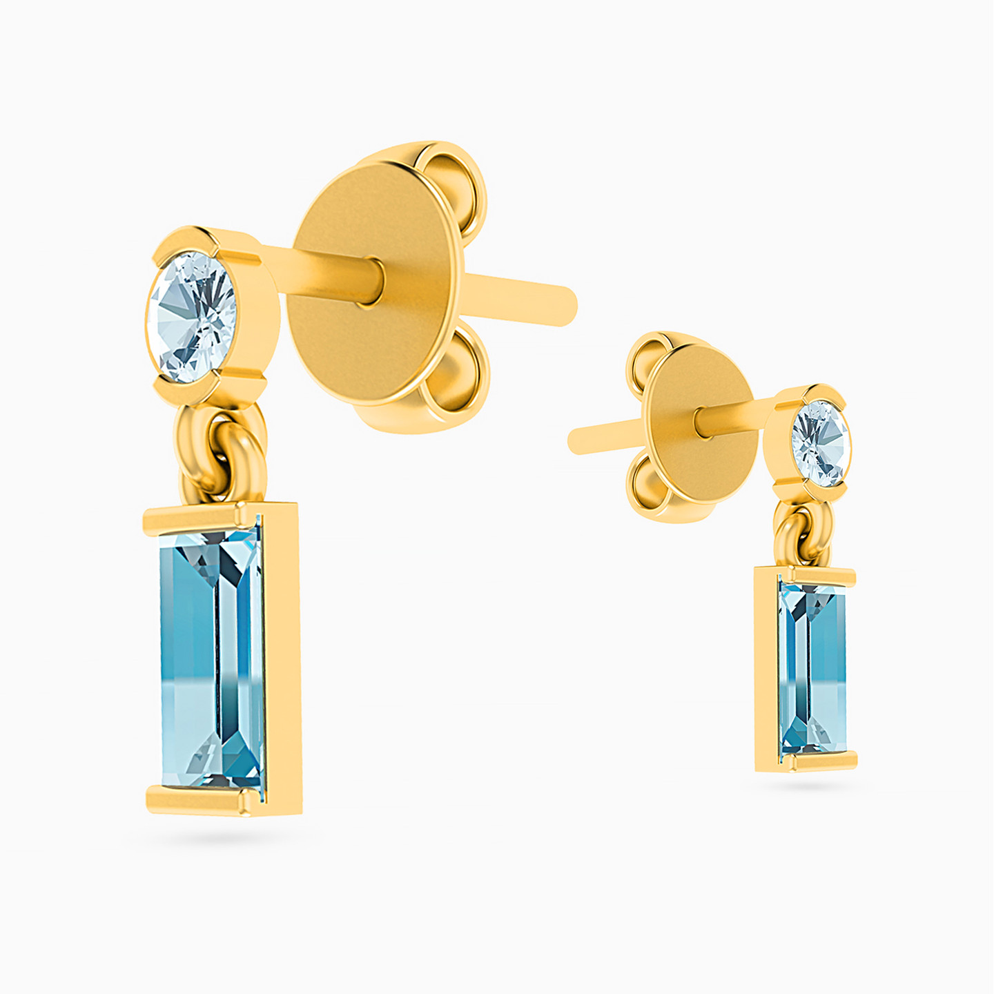 Increase your sophistication quotient with these polished earrings from Miss L’. Designed on point with blue topaz and aquamarine stones, this pair is cast in 18-karat yellow gold and finished with a push back post. We recommend pairing these with a matching necklace from our collection.