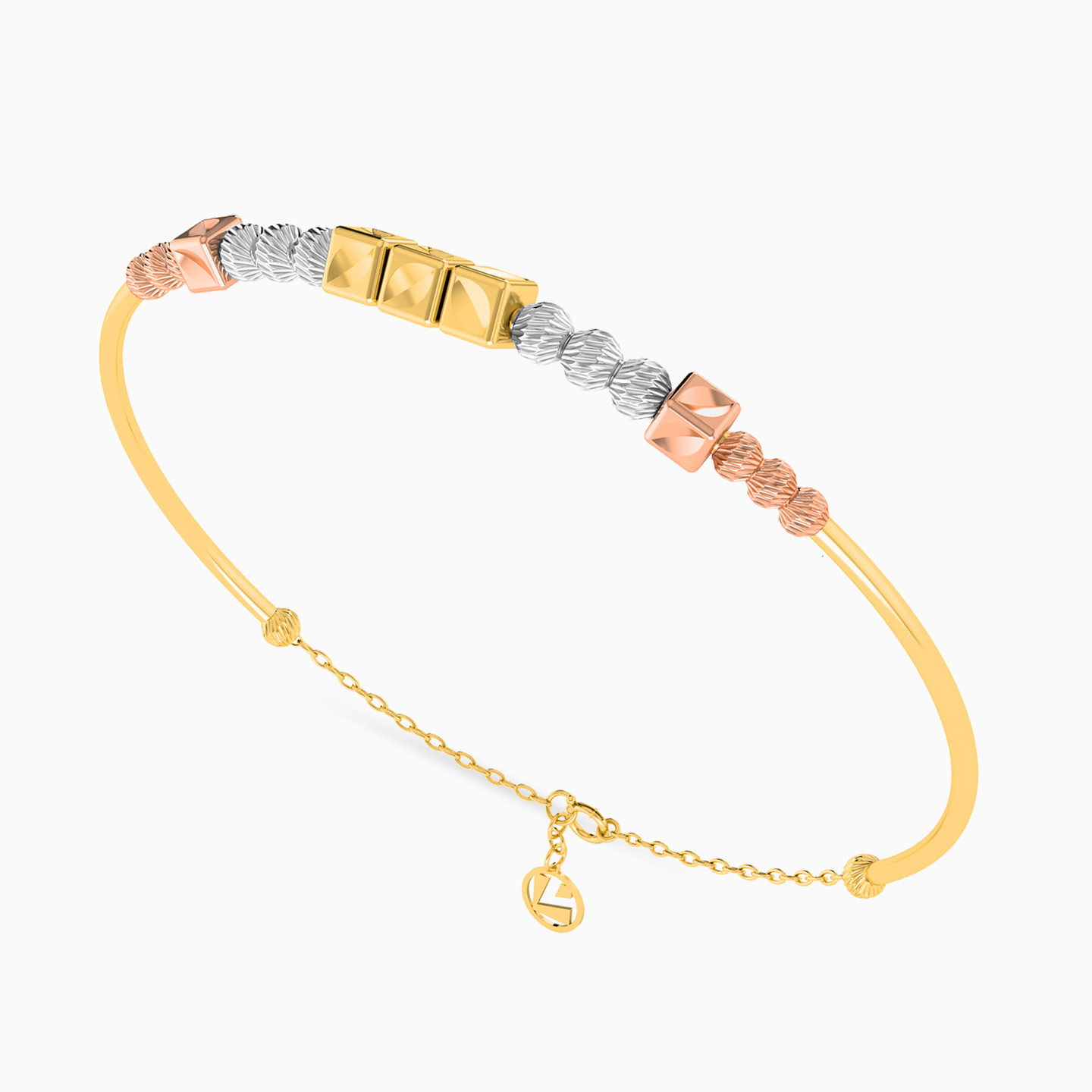 We love the minimal design of this bracelet from L'azurde Gold that gets a contemporary upgrade with the colored accents. Constructed with an 18-karat yellow gold band, this piece features tri-tone metal motifs to the center that give it a fresh weightless look. This slim piece will sit gracefully on your wrist whether you wear it solo or pair it with a similar bracelet from our collection.