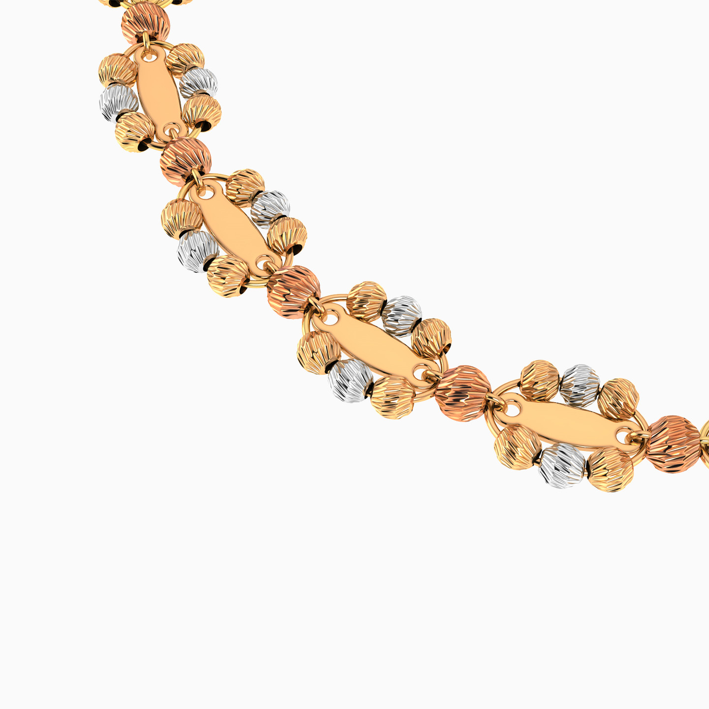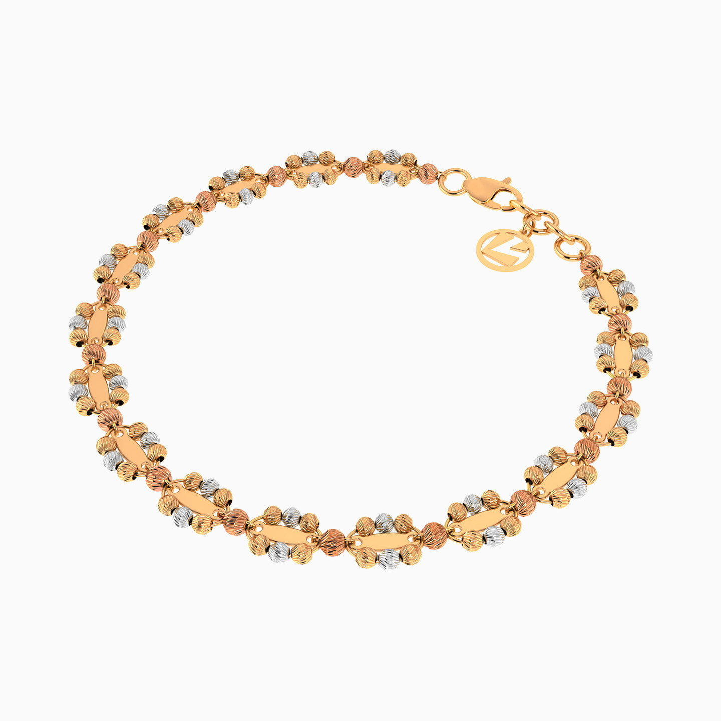 Introducing a golden symphony chain bracelet from L'azurde Gold to wrap your wrist with timeless elegance. It features alternating sleek 21-karat yellow gold bars with the delicate allure of textured rose gold beads. The captivating fusion of textured white and rose gold beads encircling each gold bar adds a touch of grace and sophistication, creating a jewelry piece that's both classic and contemporary. A perfect pick for making a statement on any occasion.
