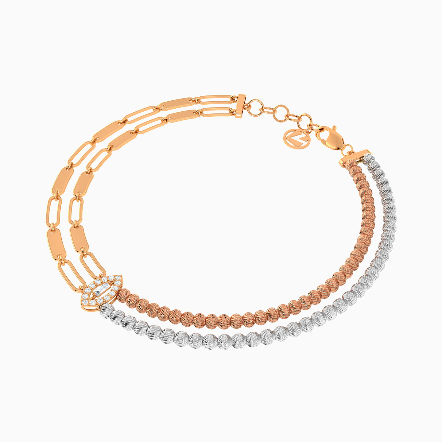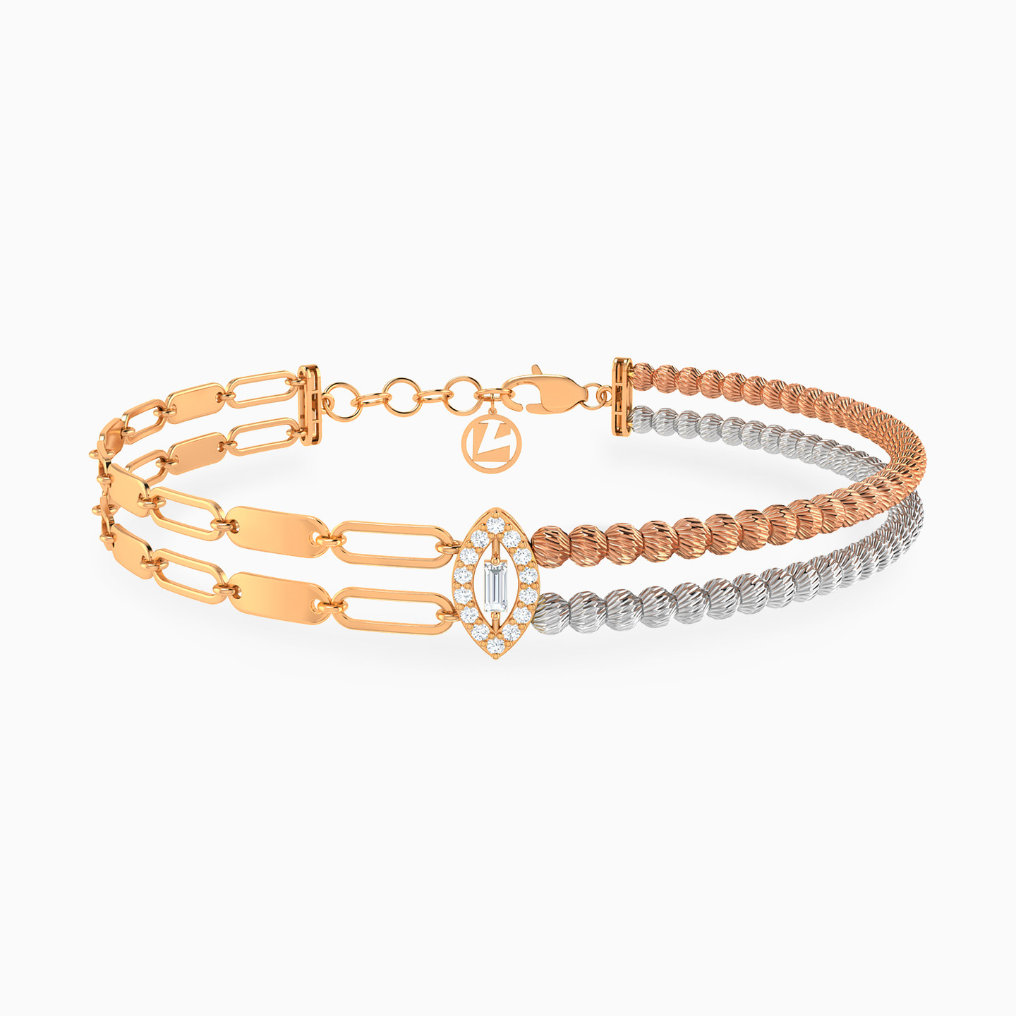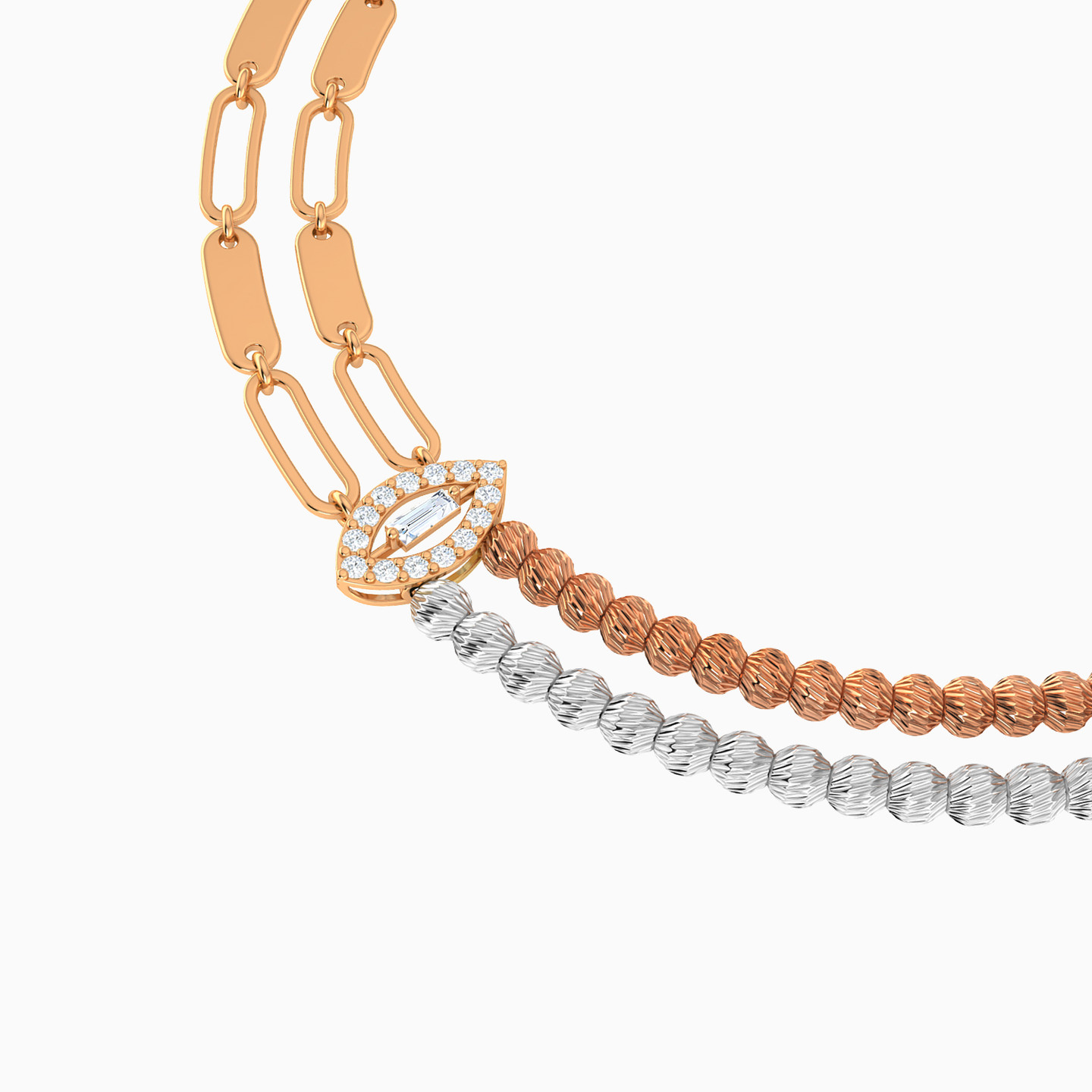 Introducing a stunning dual-layered 21-karat yellow gold chain bracelet by L'azurde Gold, a fusion of opulence and contemporary style. One side boasts a harmonious blend of textured rose gold beads and radiant white gold beads, while the other side features the modern charm of dual layers of paper clip links. A mesmerizing marquise-shaped centerpiece framed by round cubic zirconia takes center stage with a captivating baguette-shaped cubic zirconia nestled in the center. This bracelet is sure to elevate any outfit and make a charming statement.