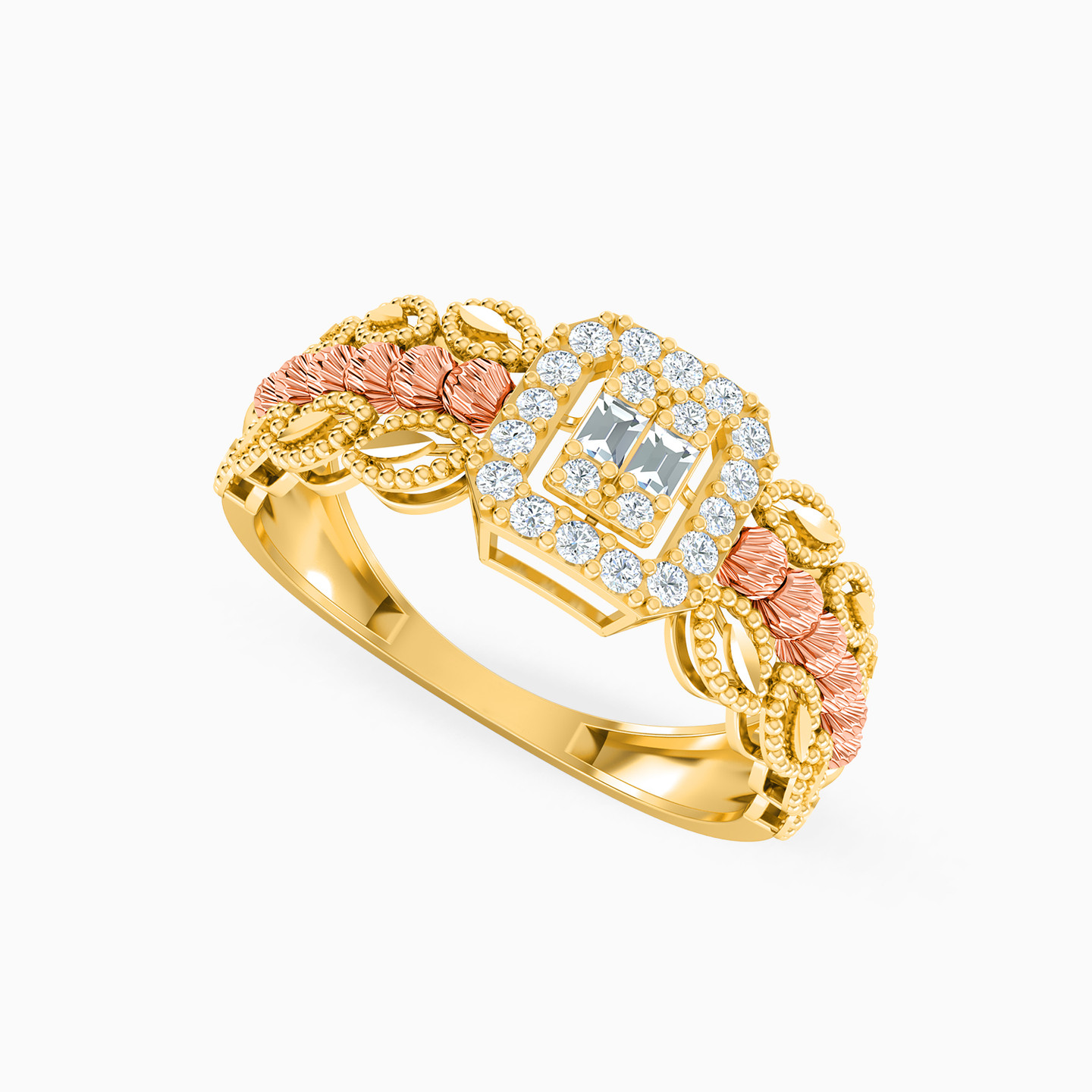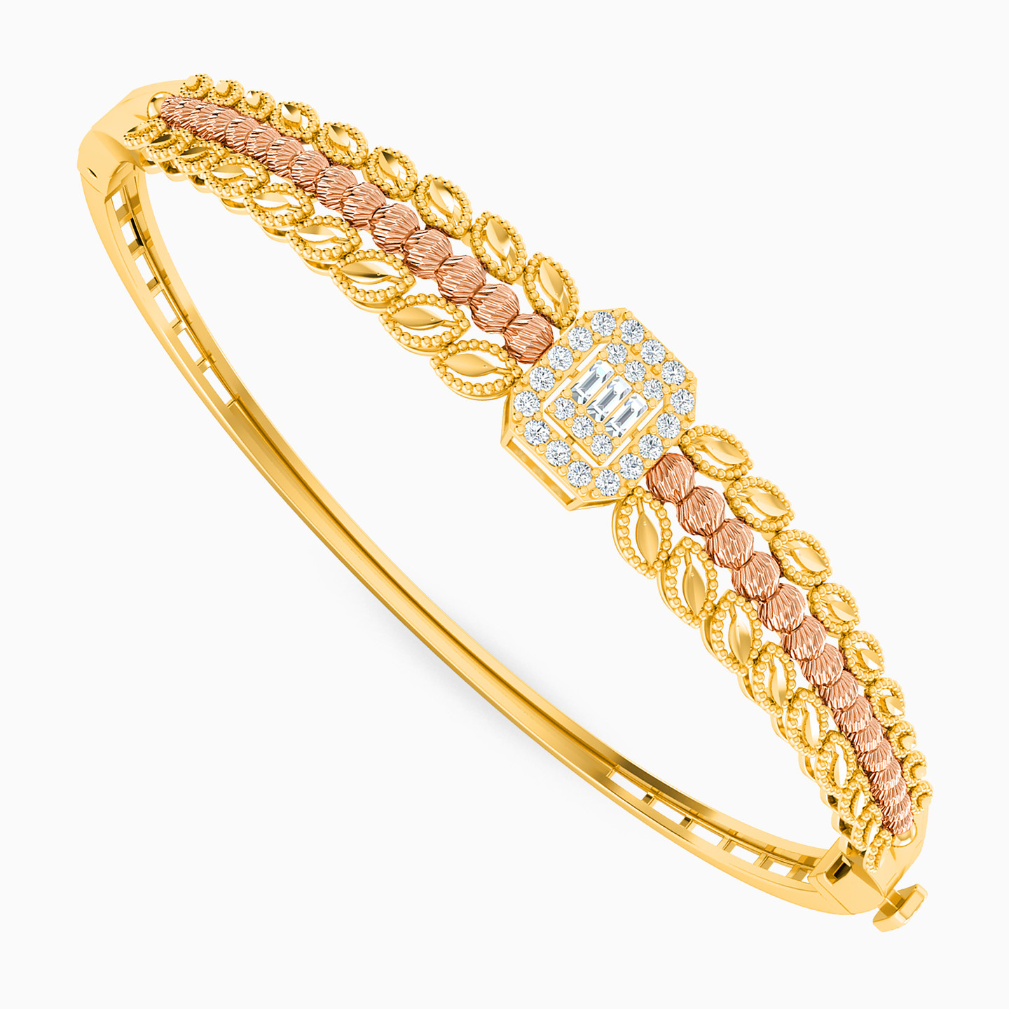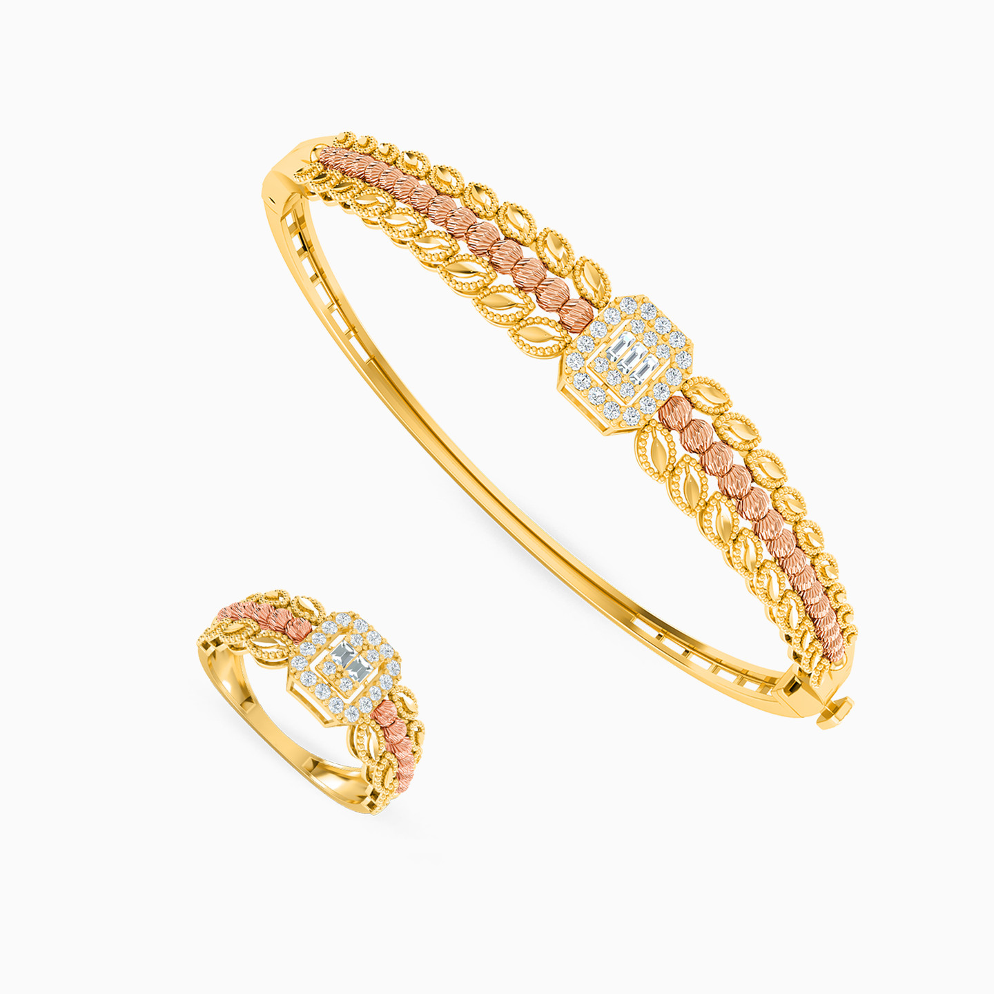 Capturing both color and shine in one go, this set of bangle and ring from L'azurde Gold will make a charming addition to your jewelry box. Cast in 21-karat yellow gold, it features textured leaf work and rose gold beads to the band, and stunning white stones to the center. This premium set will make a fine complement to occasion wear.