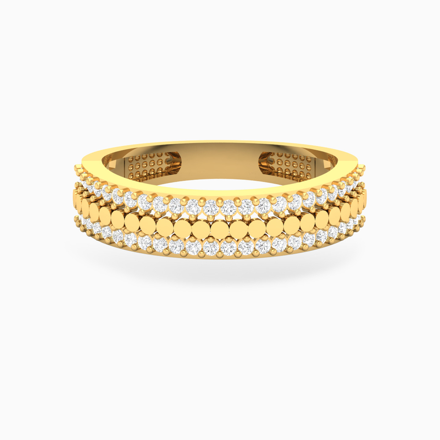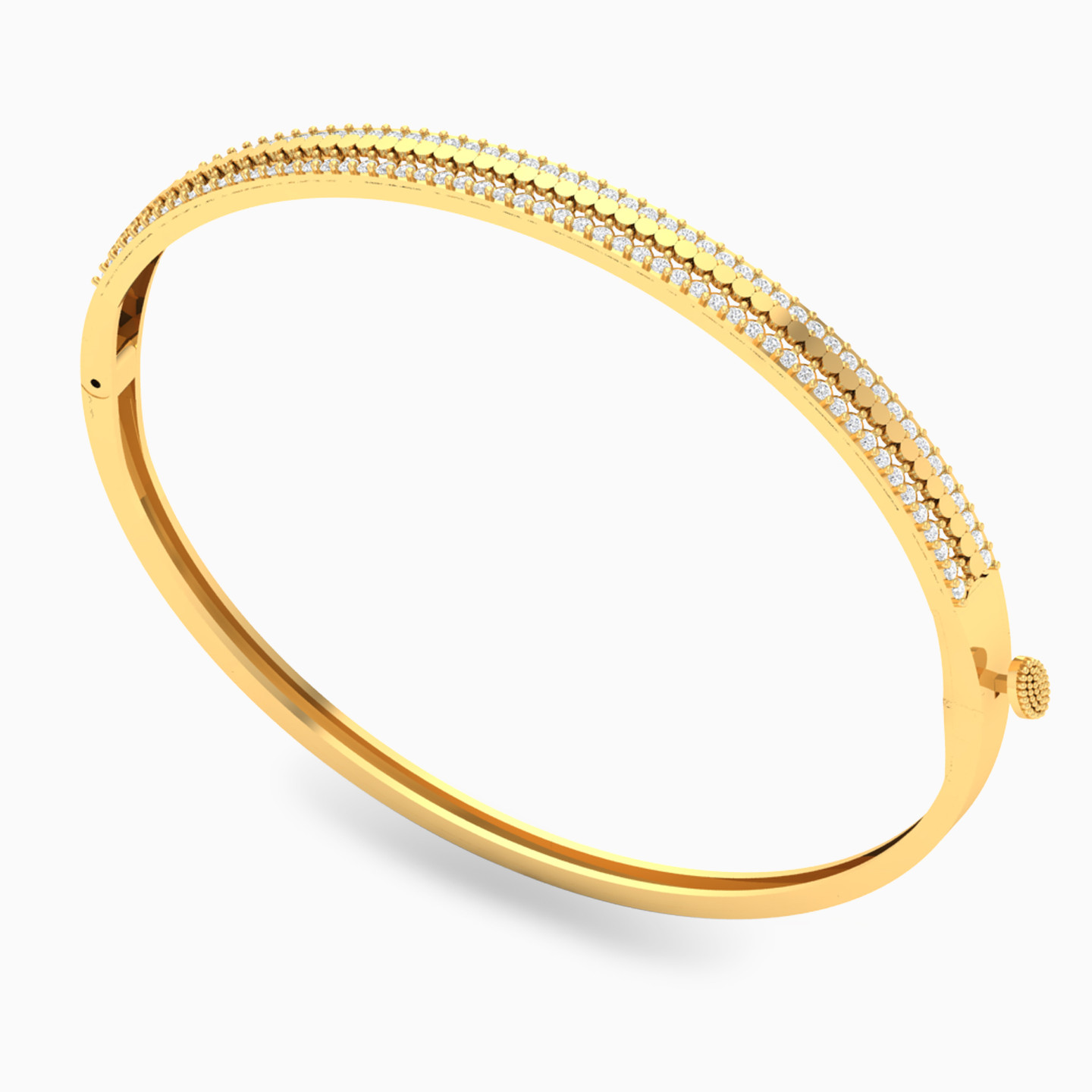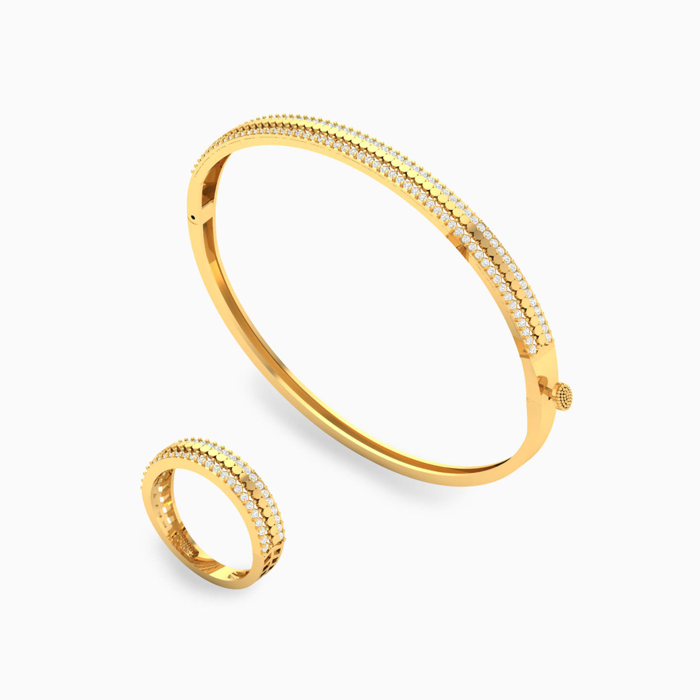 Simplicity never fails to impress especially when it is this gorgeous! This bangle and ring set by L’azurde Gold feature a sleek row of yellow gold circles flanked by a row of sparkling round cubic zirconia stones on either side. Crafted from 18-karat yellow gold, this set might look simple but is all you need to elevate any outfit.