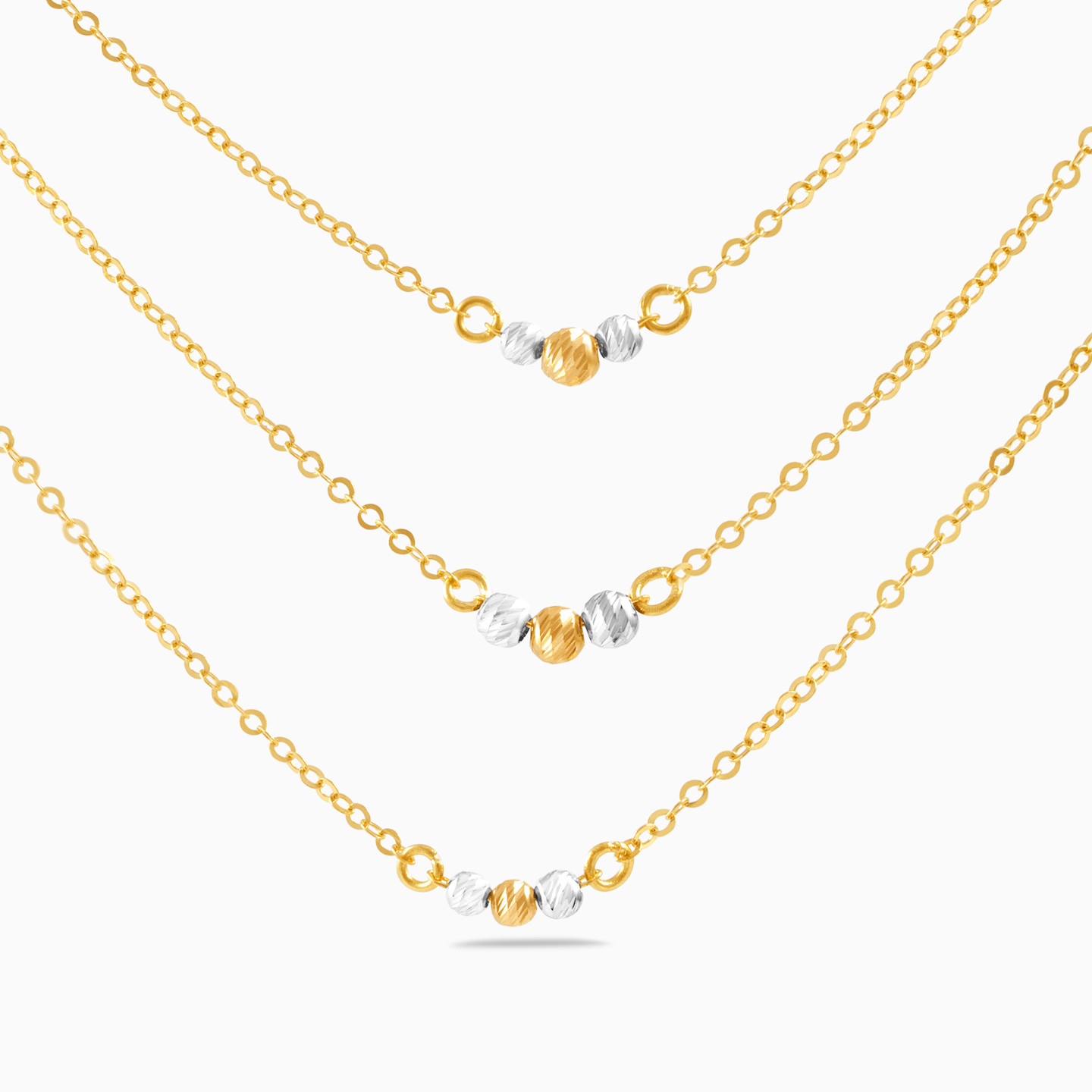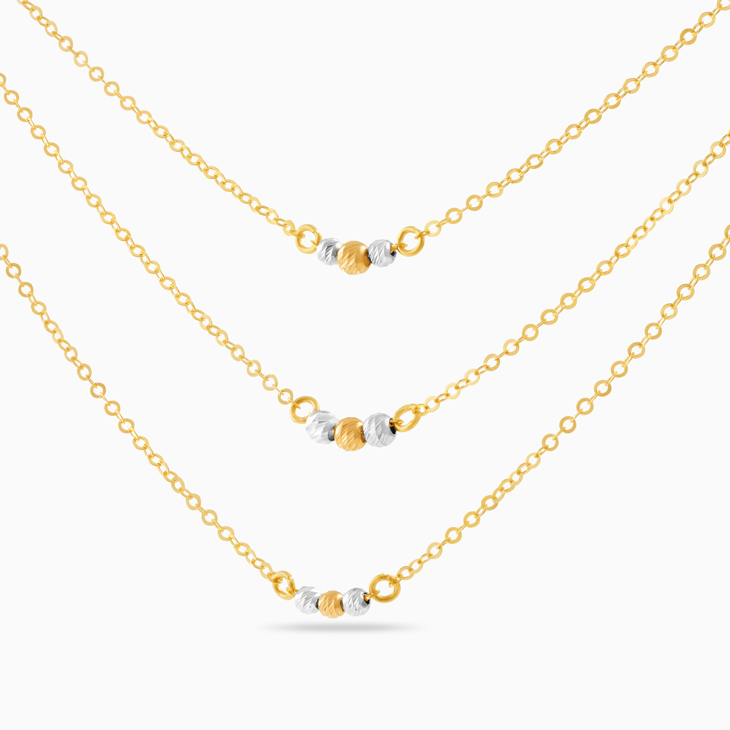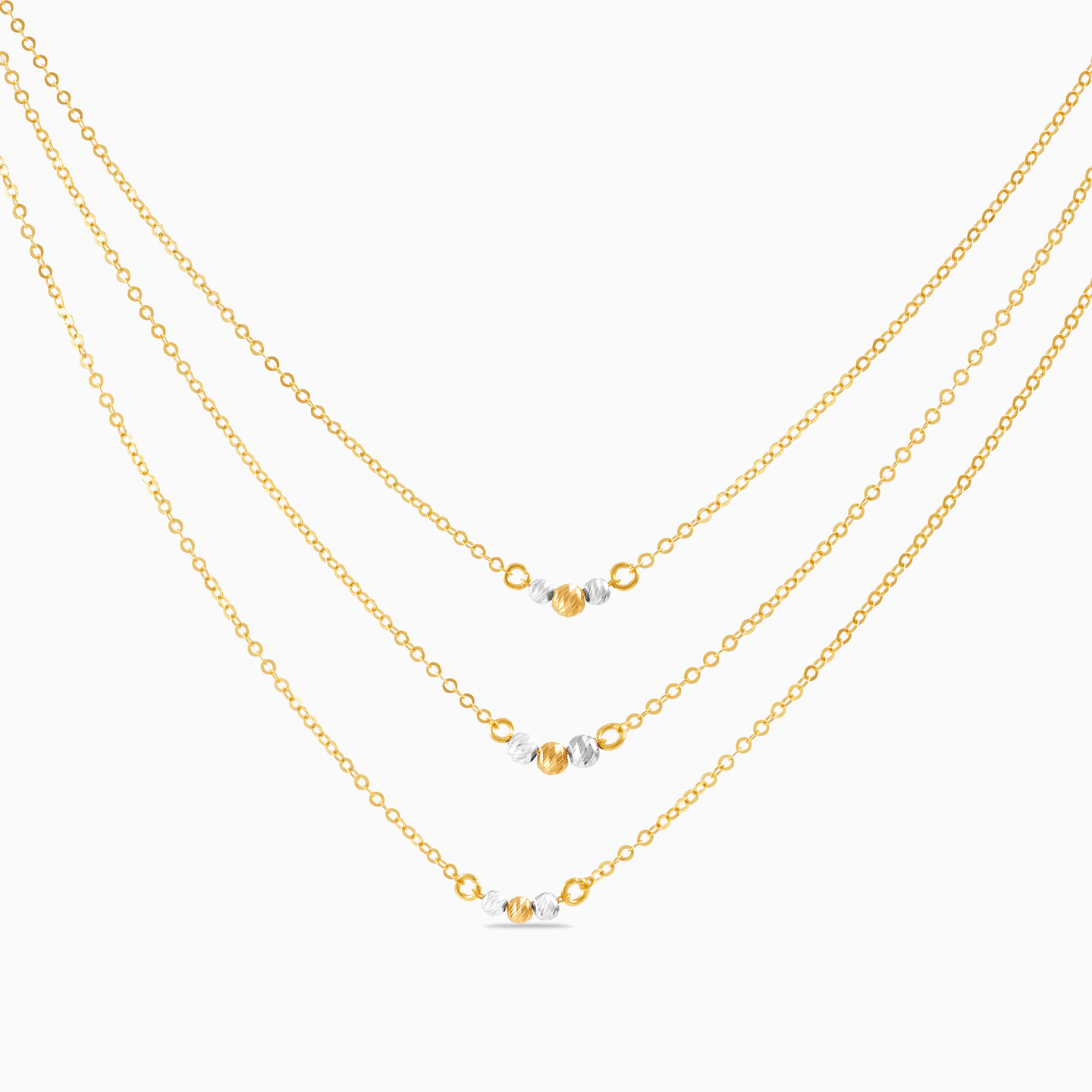 Modern and elegant, this feminine layered chain necklace from L'azurde Gold has eye-catching beauty. Crafted of 18-karat white and yellow gold, this pretty necklace features round gold beads on a dainty trio of chains. So chic and lovely, this sophisticated layered necklace is perfect for everyday wear.