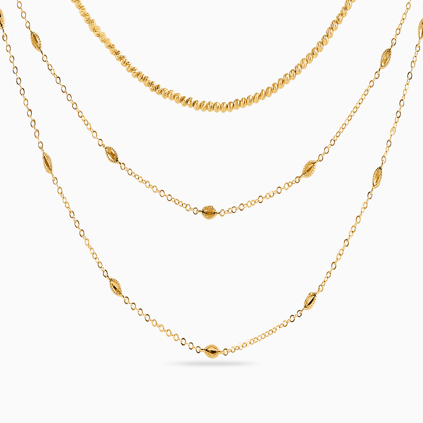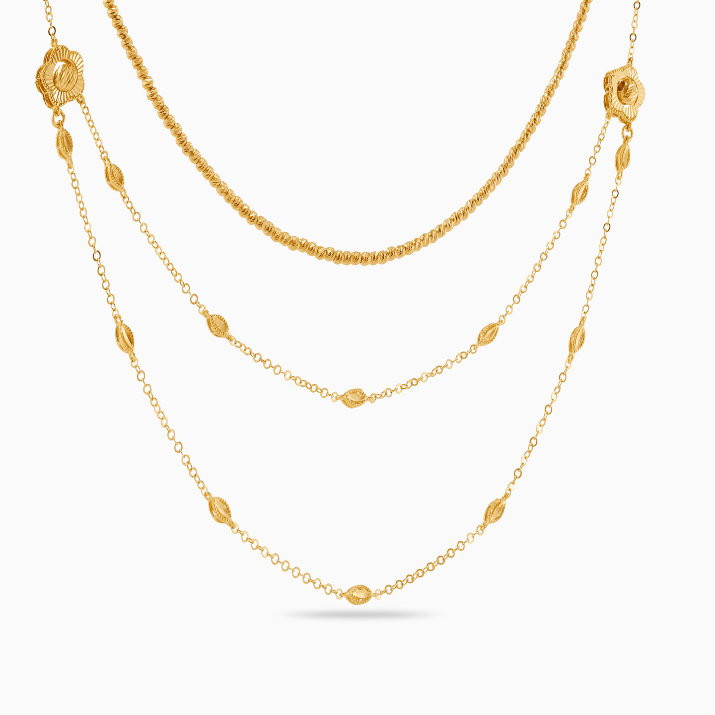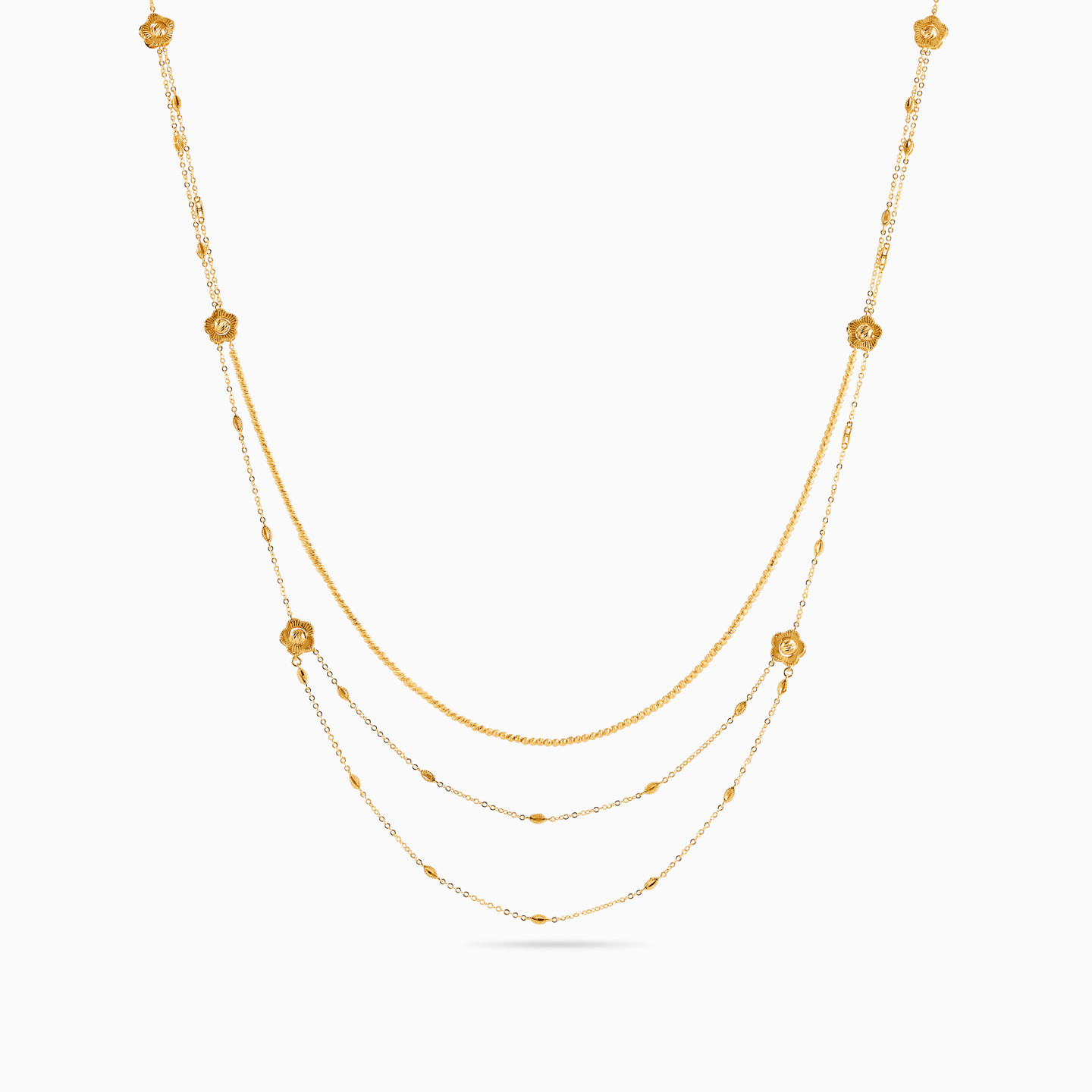 Layers can instantly up the glam quotient of any outfit and this necklace from L'azurde Gold is here to do just that! Three delicate layers made of a lovely gold bead chain and two dainty chain links connected to each other with pretty flower motifs and all of this in lustrous 18-karat yellow gold. This beauty deserves an equally beautiful and delicate dress!