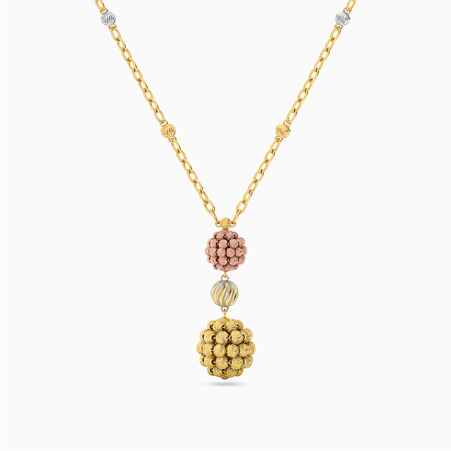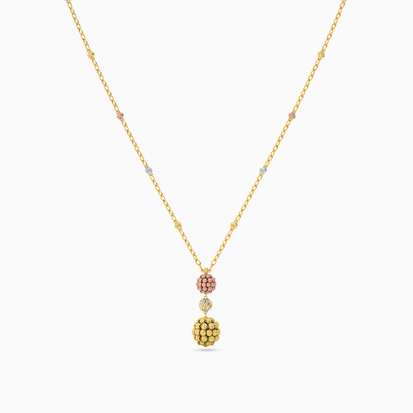 Simplicity like this never fails to impress. This necklace from L'azurde Gold is one such piece. Lightly dotted with two-tone accents on the chain, this number drops into a gracefully crafted pair of spheres in yellow and rose gold that feature textured beads all over, and are connected by a petite ball charm. Wear yours to accentuate a low neckline and pair it with matching ear drops to complete the look.