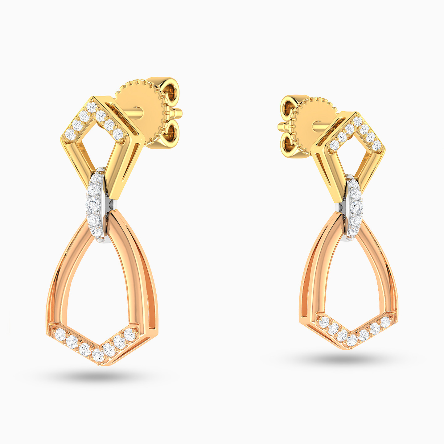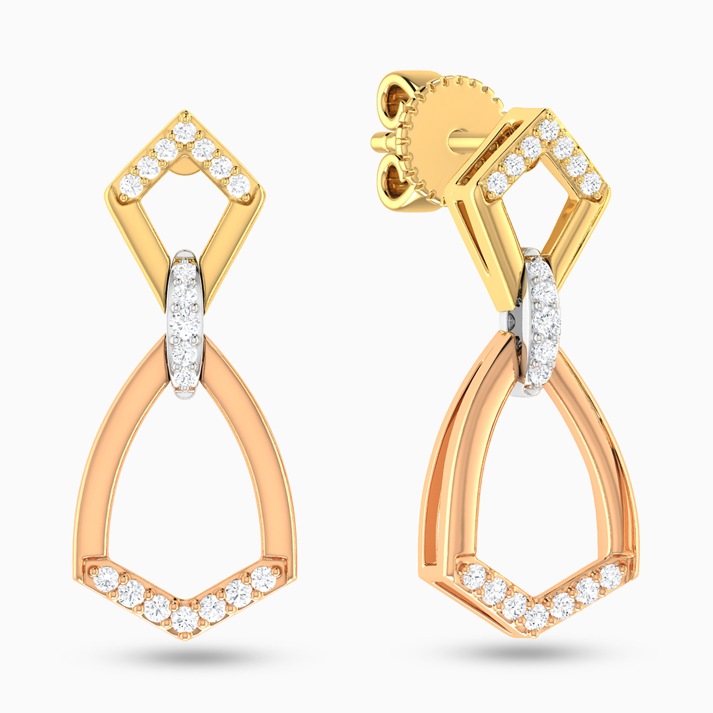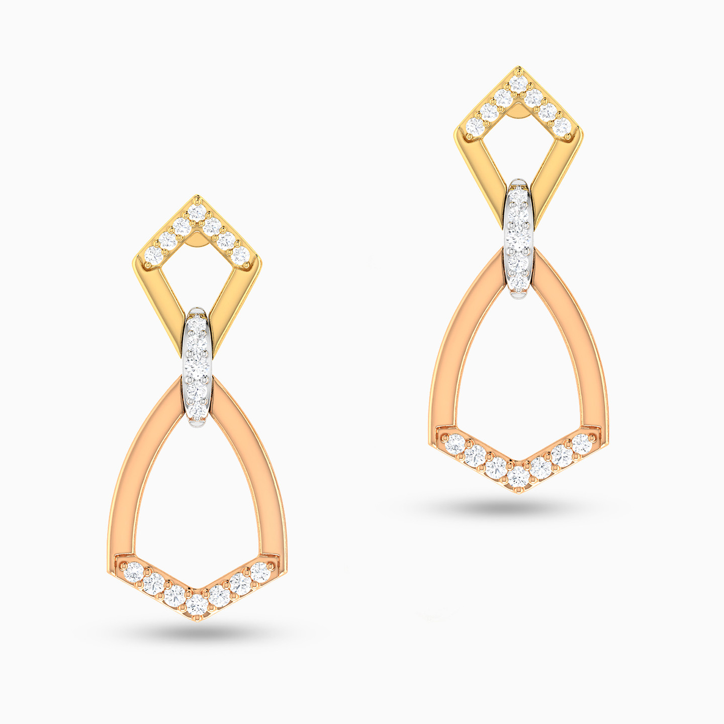 Prepare for heads to turn when you enter the room wearing these gorgeous diamond drop earrings from L'azurde Diamonds. Sleek abstract shapes and three tones of gold give these glamorous earrings their mesmerizing beauty. Dazzling with brilliant cut diamonds set in 18-karat yellow, white and rose gold, these earrings are certain to become your go-to favorites.