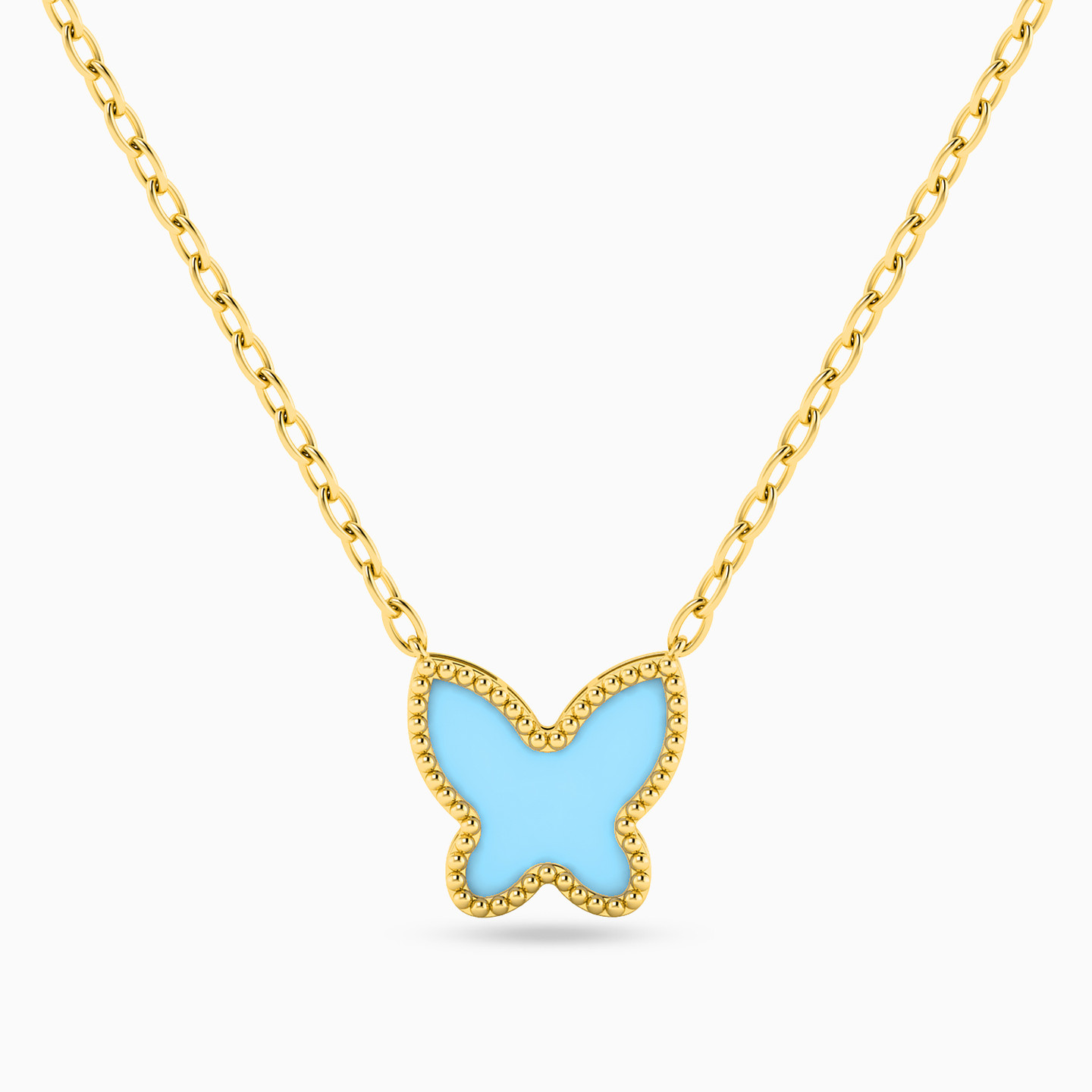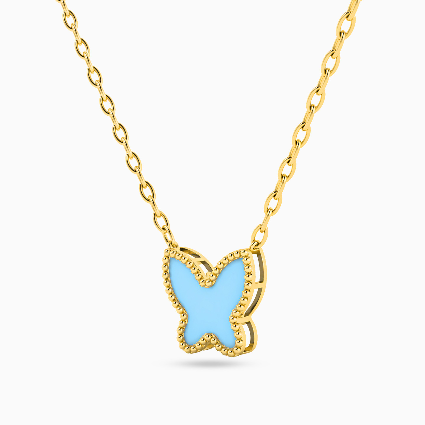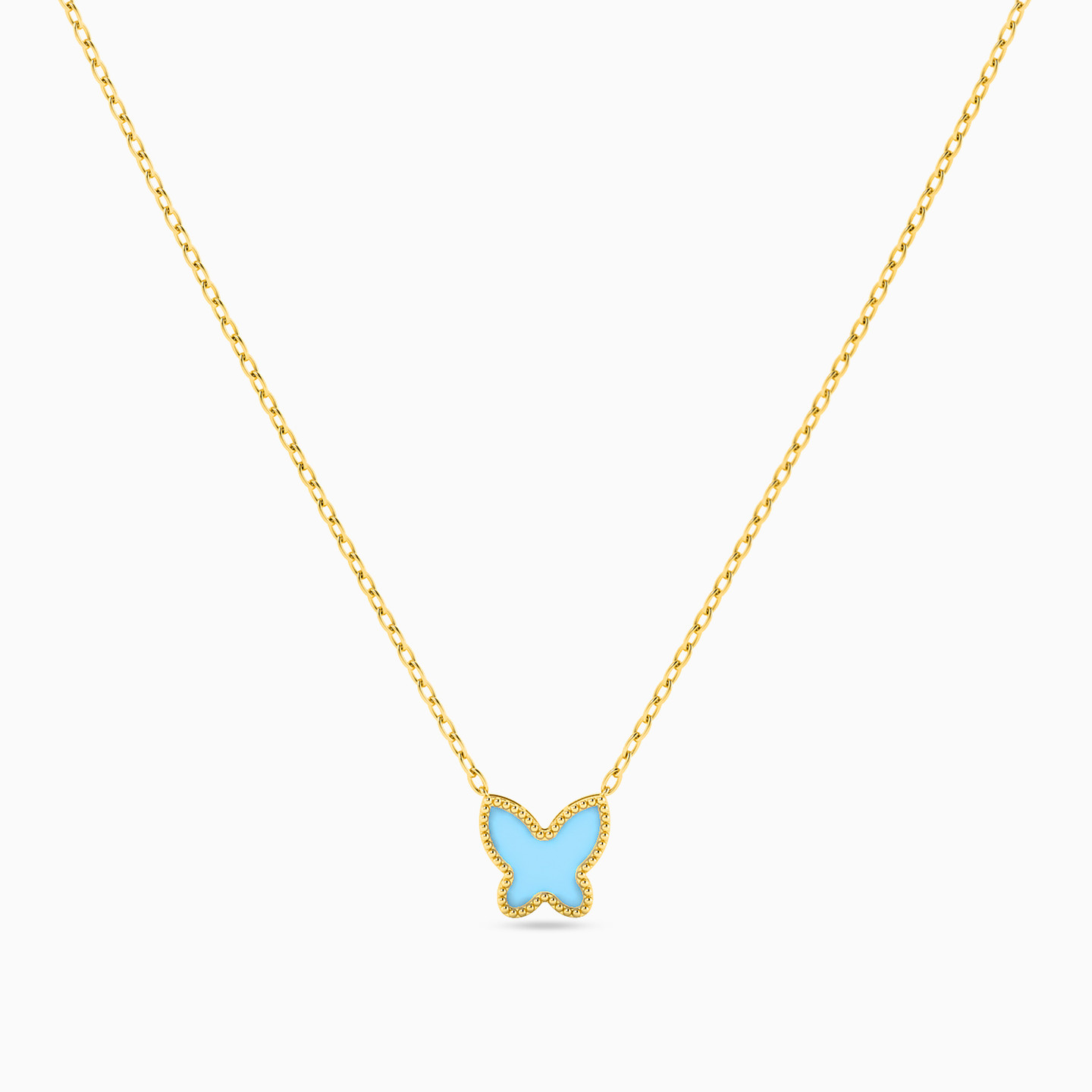 We all need a little color in our lives and this piece from Miss L’ lends the right amount of uniqueness to keep you looking trendy. The blue butterfly pairs up beautifully with the yellow gold silhouette as it drops from a dainty chain. We recommend layering it with different chains from our collection.