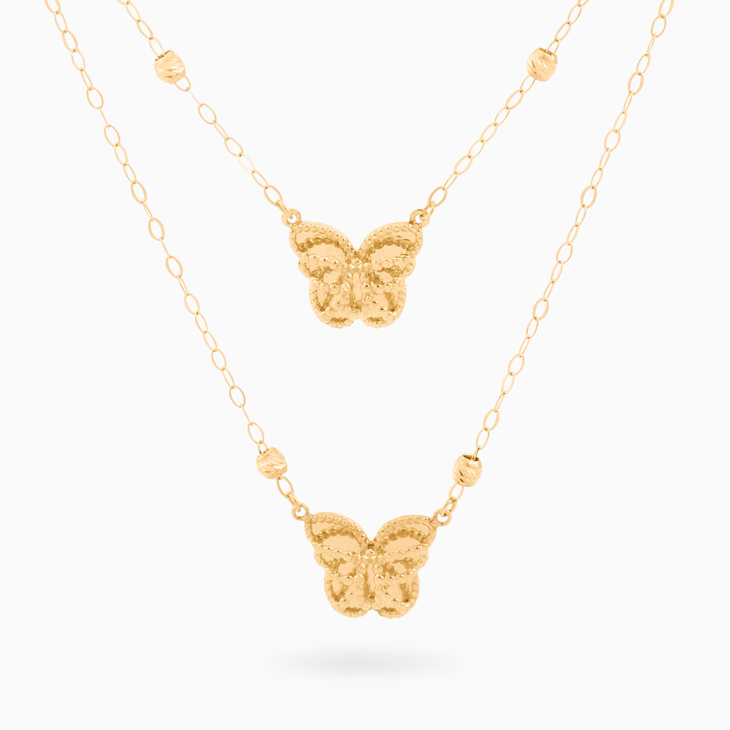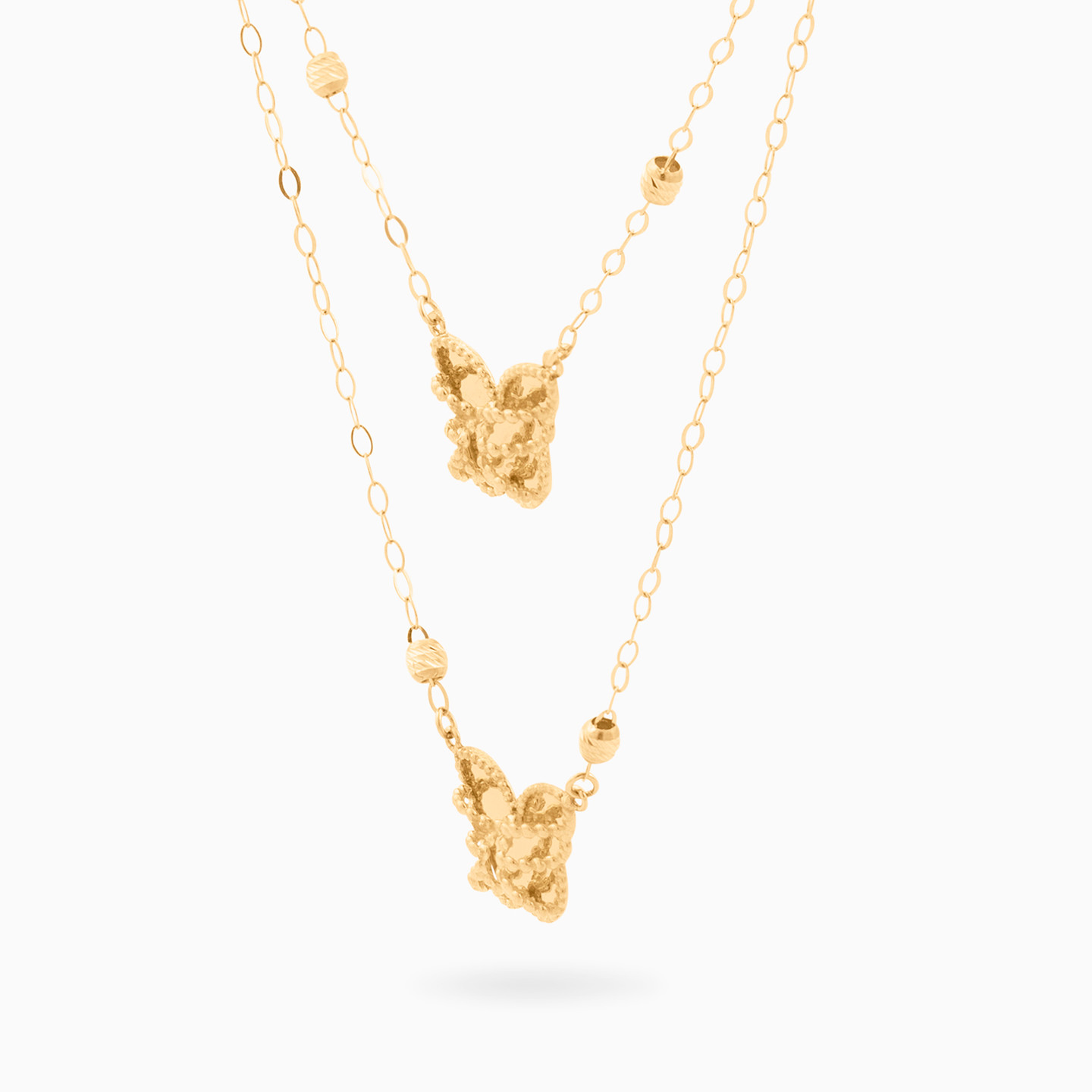 You’ll look as graceful as a butterfly when you enter the room wearing this feminine layered necklace from Miss L’. Two solid gold butterflies and their beaded outlines take flight on this stunning 18-karat yellow gold layered necklace. It’s twice the beauty for any outfit when you accessorize office attire or weekend casual wear with this eye-catching piece.