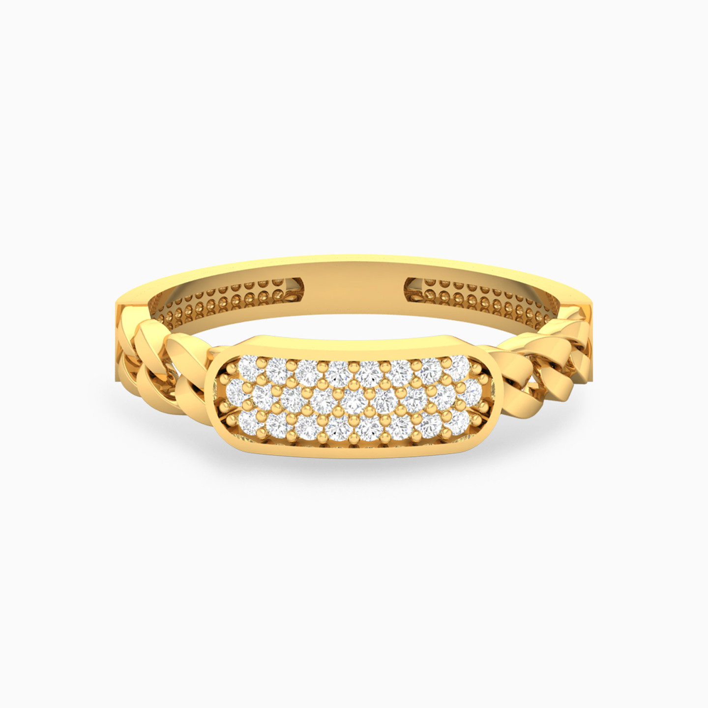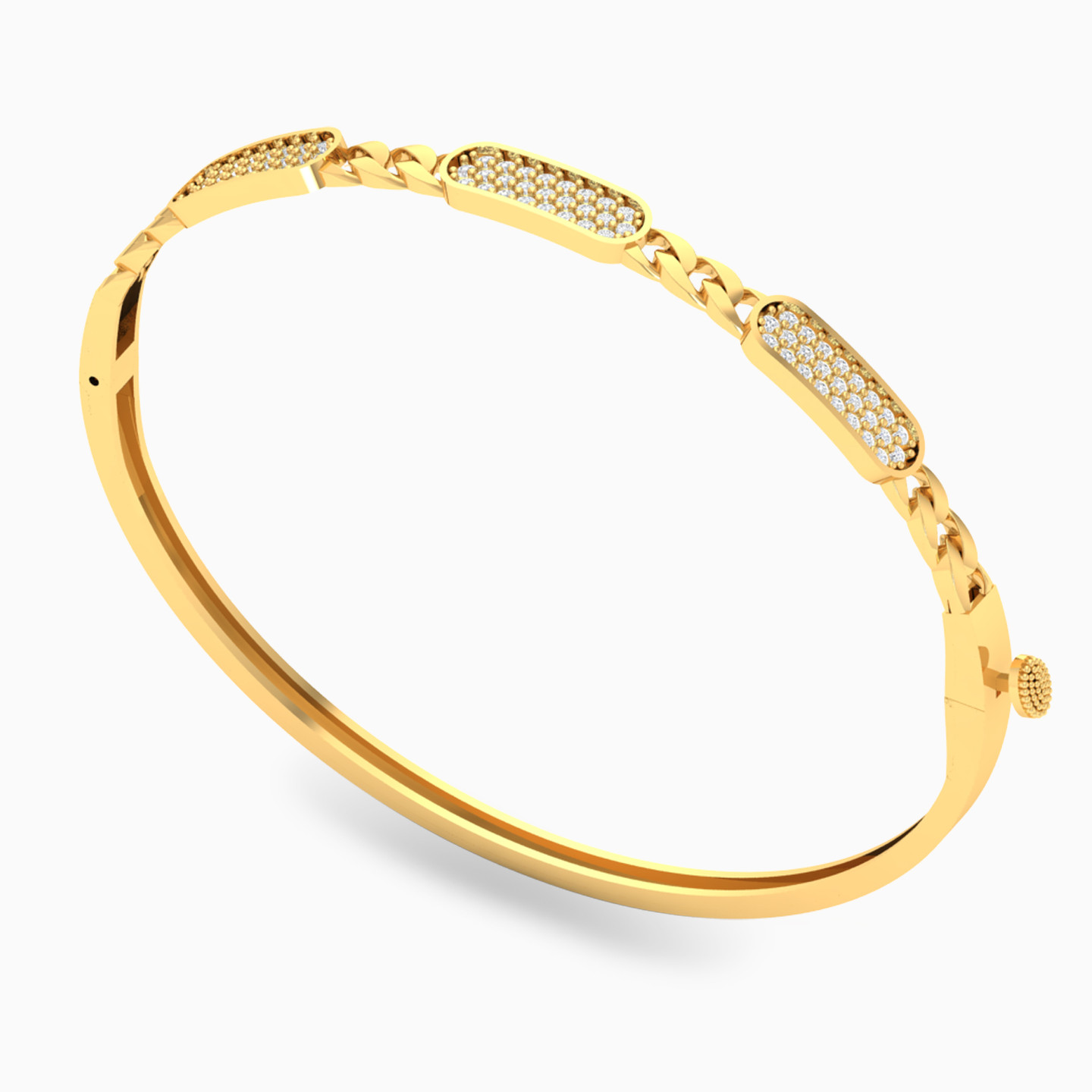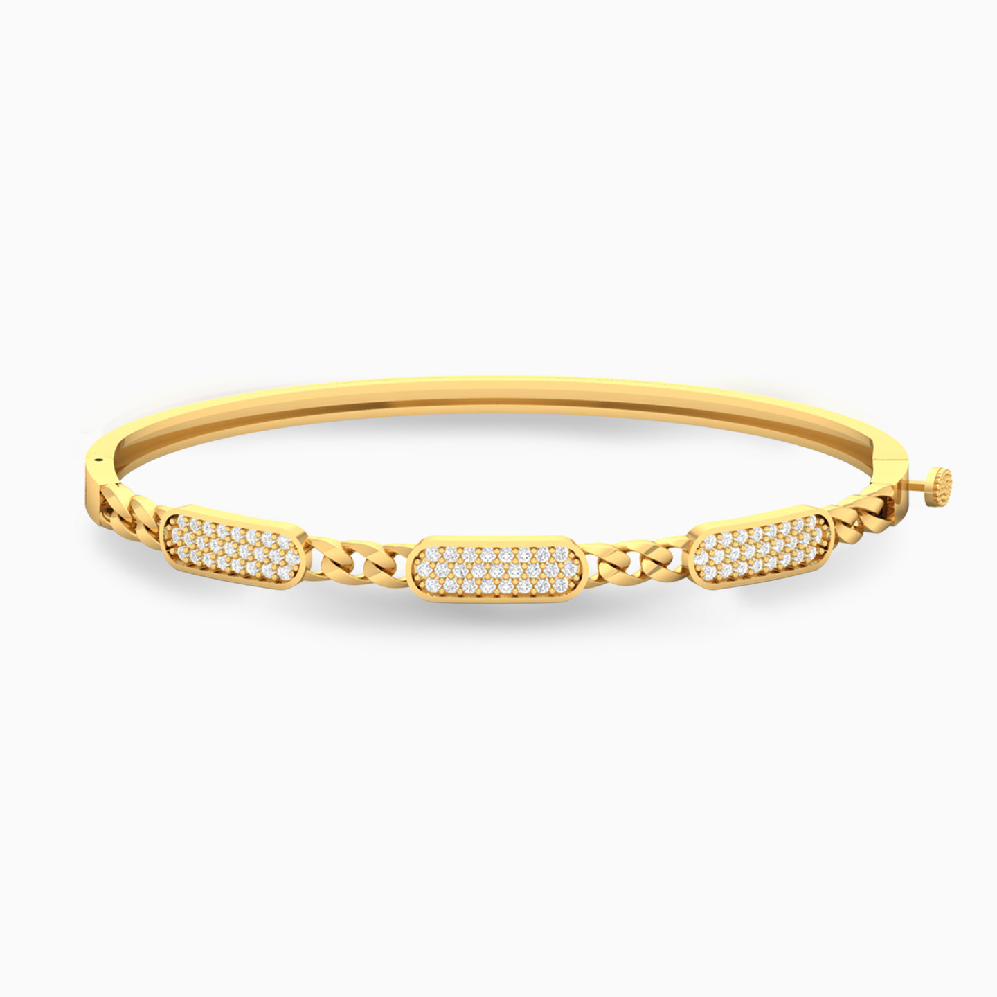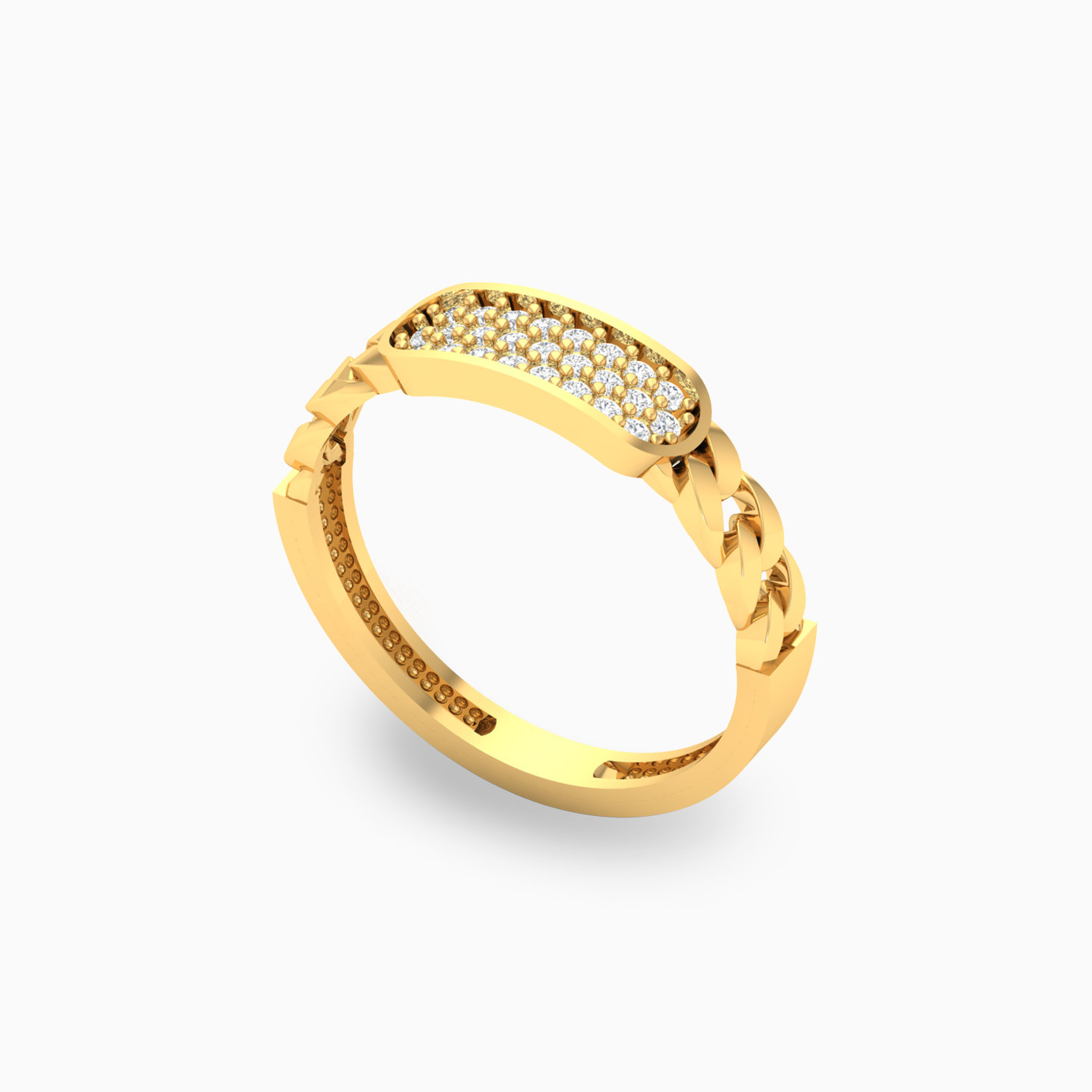 Clusters of round cubic zirconia come together in rounded rectangular frames connected by chain links in this gorgeous bangle and ring set by L’azurde Gold. The sleek design and sparkle of the stones are beautifully complimented by the 18-karat yellow gold body. Make a dazzling entrance at that next party with this gorgeous bangle and ring set.