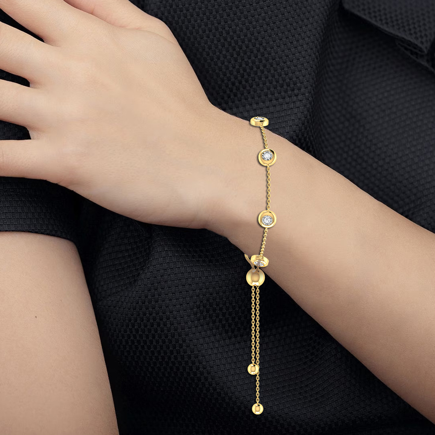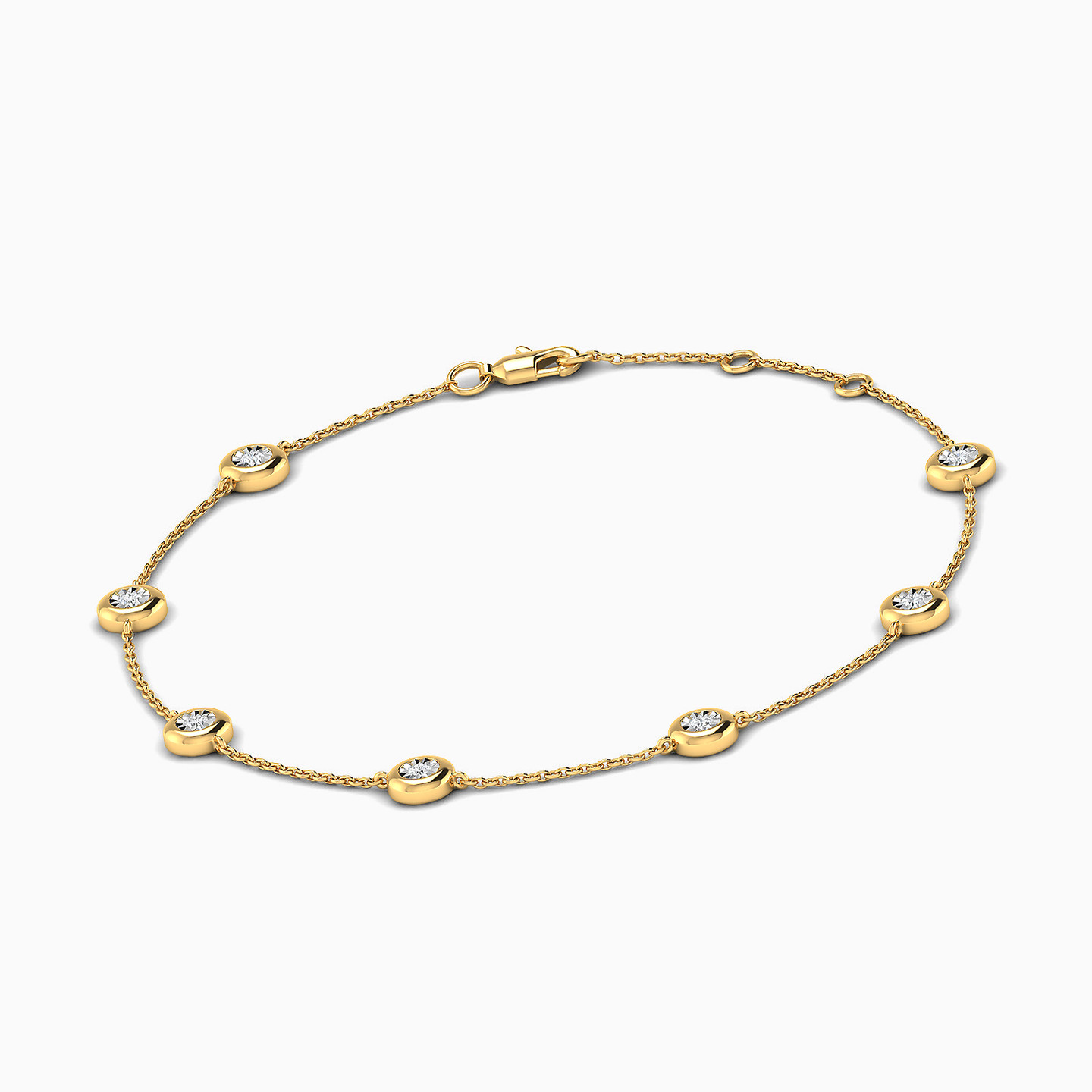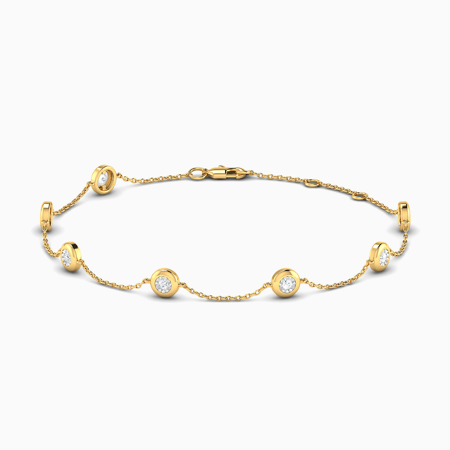 Take your everyday style game up a notch with this exquisite 18-karat yellow gold chain bracelet from L'azurde Diamonds. It features a dainty chain with circular frames studded with a single resplendent 0.20-carat brilliant cut diamond dancing along the length, exuding timeless elegance and sophistication. This chain bracelet can be styled with a pair of diamond studs for an effortlessly elegant look.