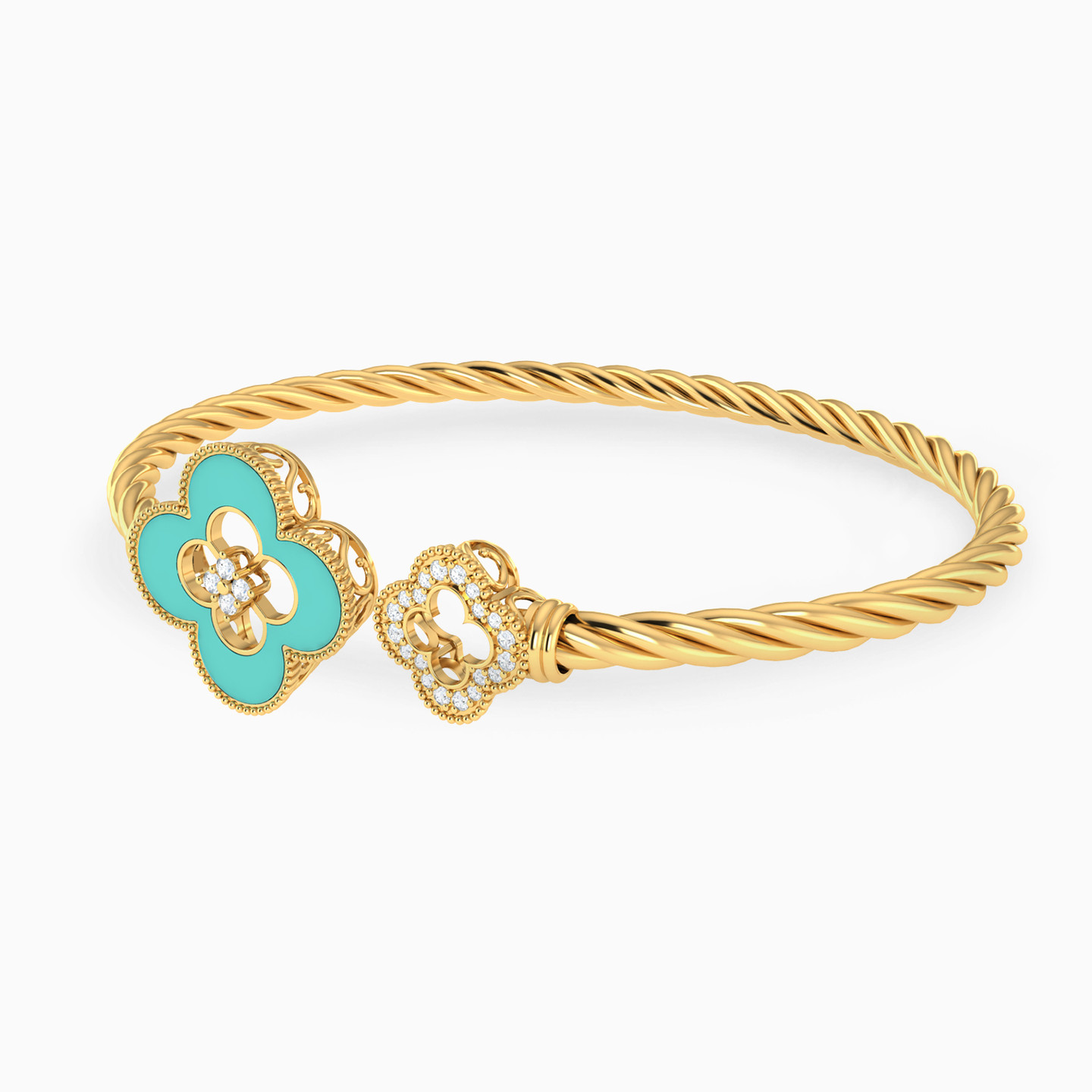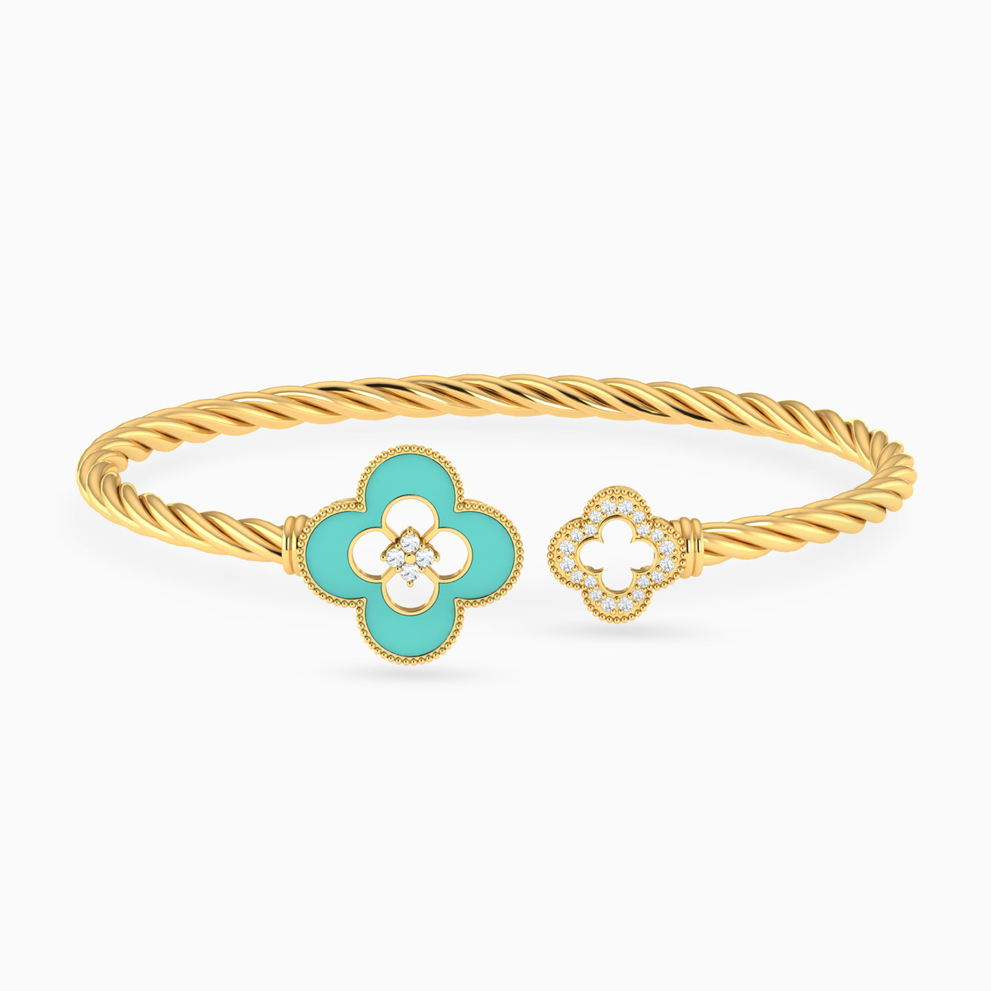 Get ready to charm your way through any occasion with this 18-karat yellow gold cuff bracelet from L'azurde Gold. It features a beautifully twisted bangle with a stunning four-petal clover on one head with four glistening cubic zirconia at its core encapsulated by stunning blue enamel coating and a scalloped frame, radiating style and luck. On the other head, a slightly smaller four-petal clover frame, adorned with cubic zirconia, adds a dash of sparkle and balance to this fun and elegant accessory. A perfect pick to turn heads and bring you good fortune!