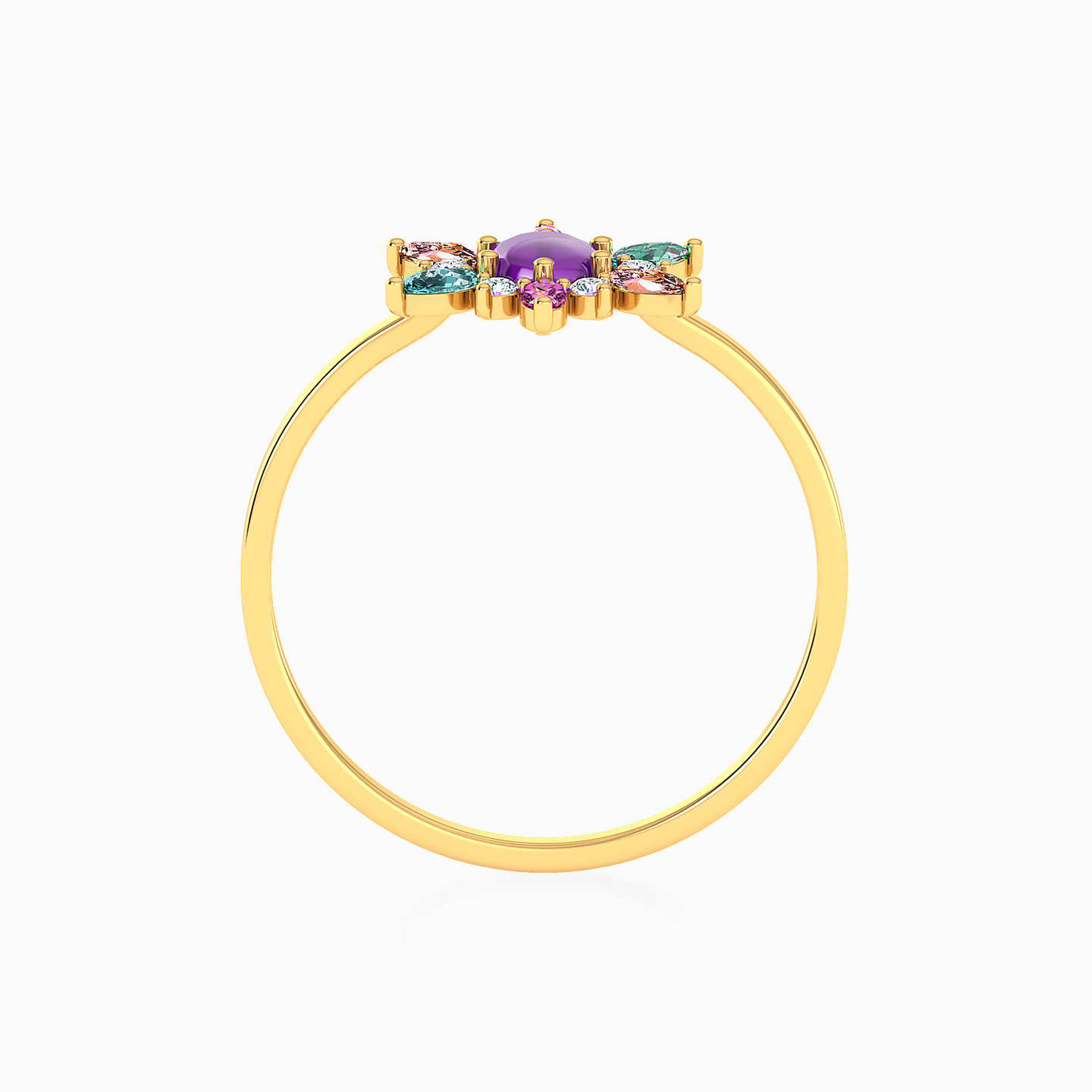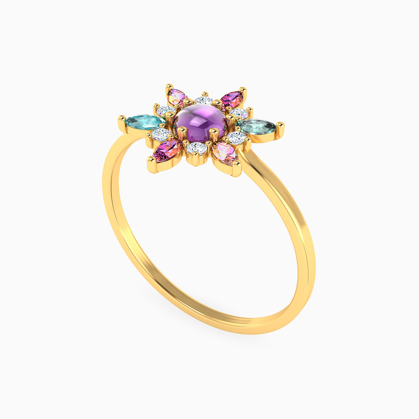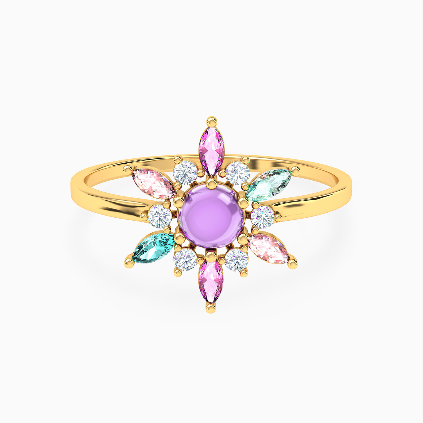 Get ready to steal the spotlight with this exquisite 18-karat yellow gold statement ring from Instyle, a dazzling bloom of pastel-colored stones that's pure show-stopping glamour! At its heart, a luminous round colored stone reigns supreme, securely held by prongs, captivating all eyes. Encircling it, an enchanting floral design emerges with alternating prong-set round and marquise-shaped colored stones, crafting a sensational and unforgettable flower that will turn heads and make your style flourish with exuberance!