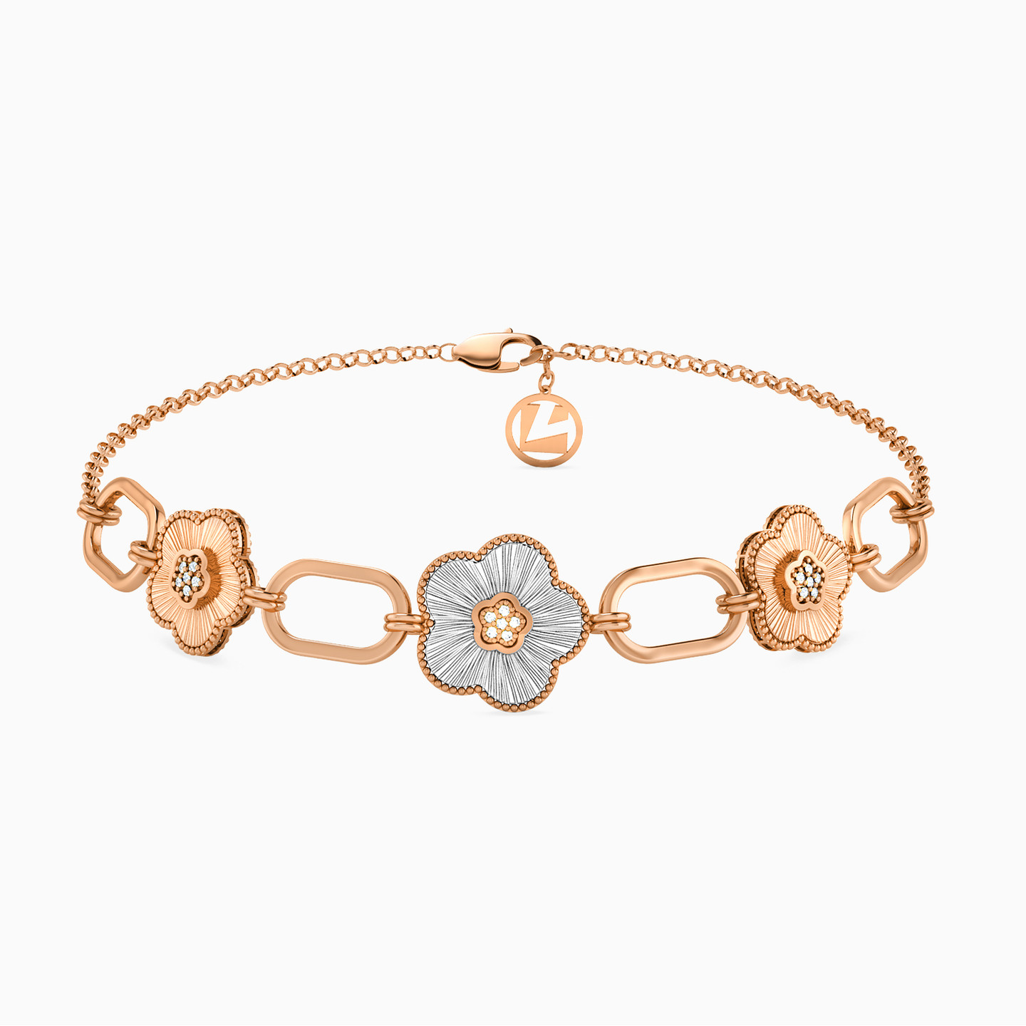 Giving your feminine charm a generous uplift, this bracelet from L'azurde Gold is nothing if not captivating. Cast in 21-karat yellow gold, it features two-tone flower motifs lightly accented with white stones, that sit alternatively between link accents. Finished with the signature spring clasp, this bracelet will shine on its own or complemented with a matching ring.