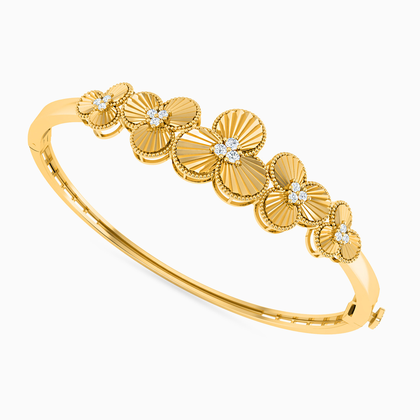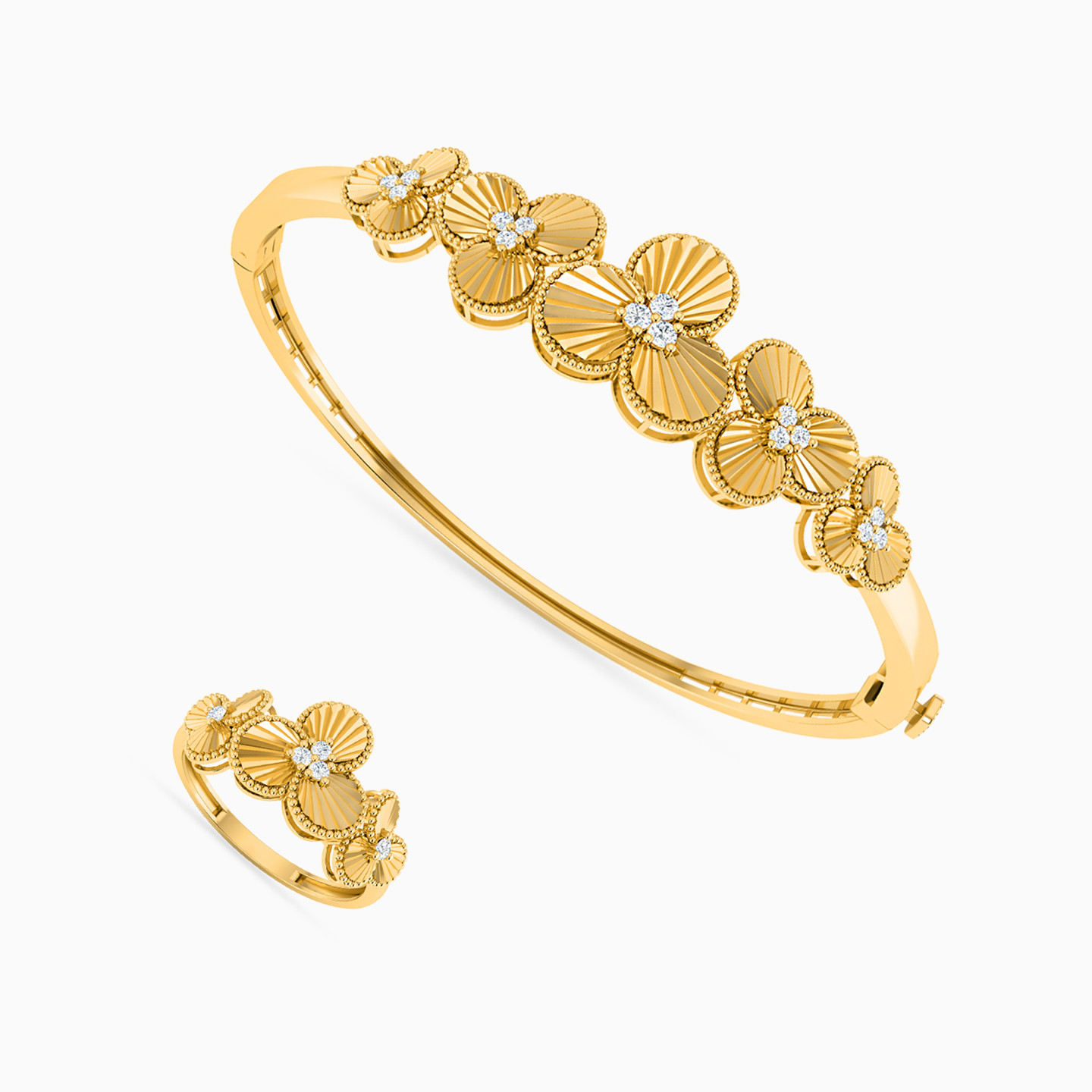 The cluster of three clover flowers add brilliance to this bangle and ring set from L'azurde Gold. It's exquisite design in 21-karat yellow gold and incredible shine that's enhanced with white stones, makes this set a fitting choice for day to evening occasions. Wear this over solid or printed hues, it will stand out nonetheless.