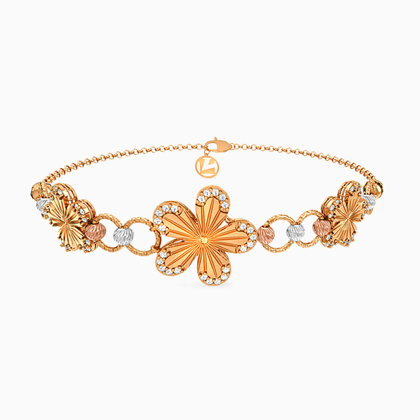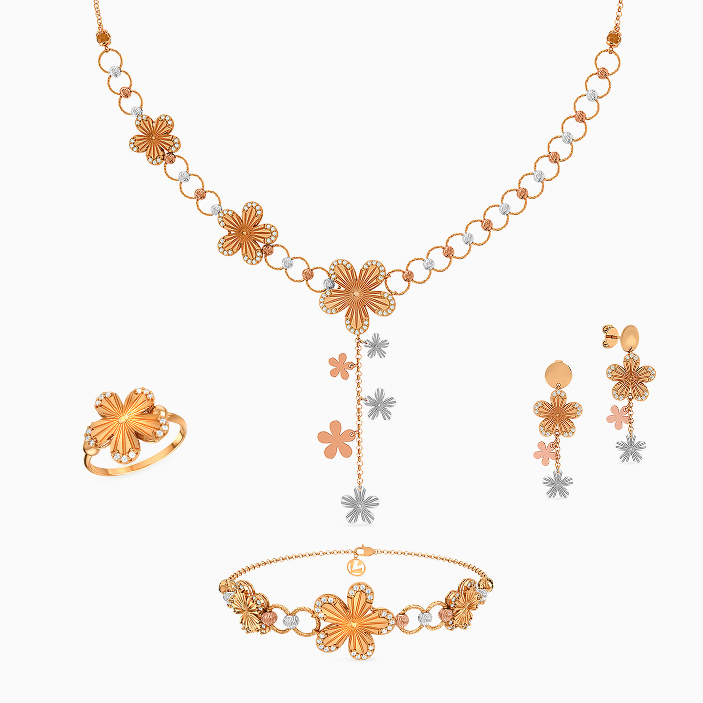 This stellar creation from L'azurde Gold will not go unnoticed. Crafted in 21-karat gold with tri-colored flowers and beads, this set is the epitome of creativity. The necklace is our favorite - featuring flowers to one side, circle links to the other and a petite drop to the center. In addition to the necklace, the set comprises of a bracelet, ring and pair of ear drops.