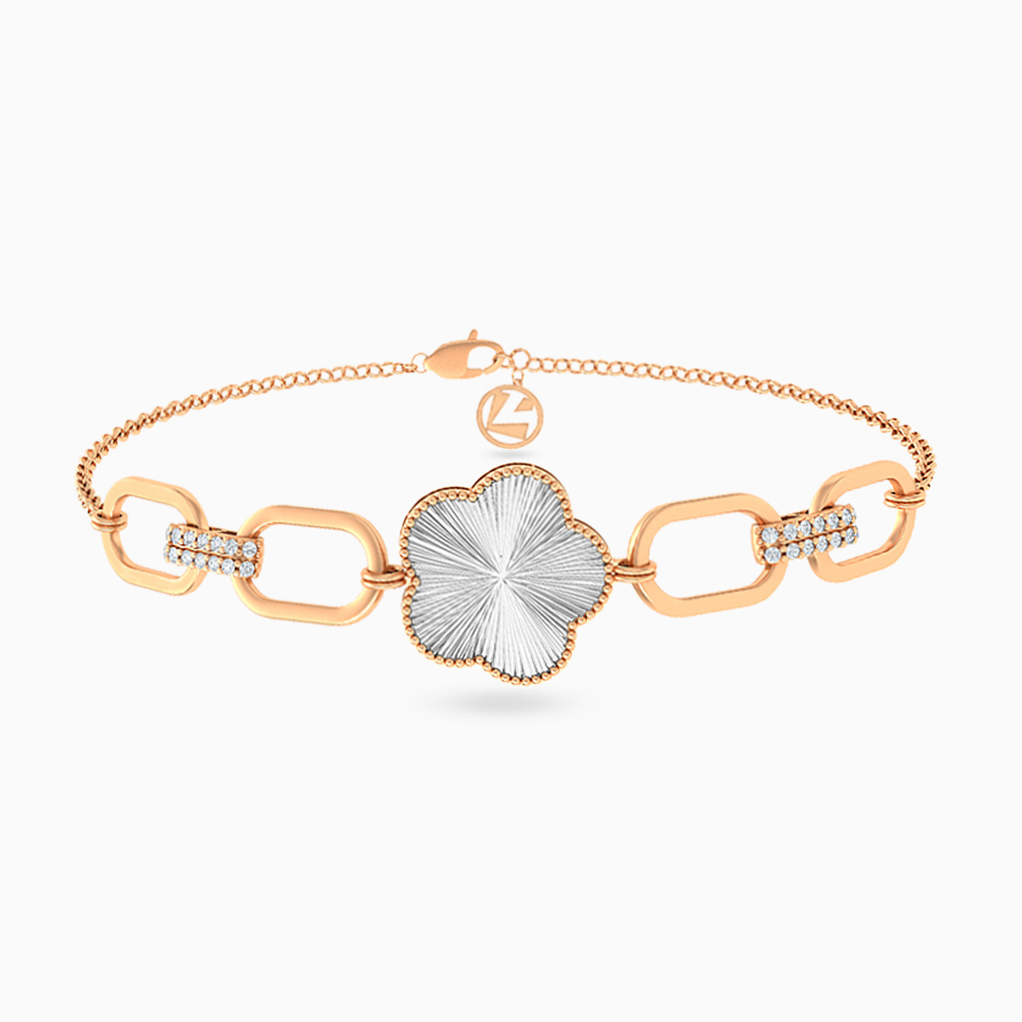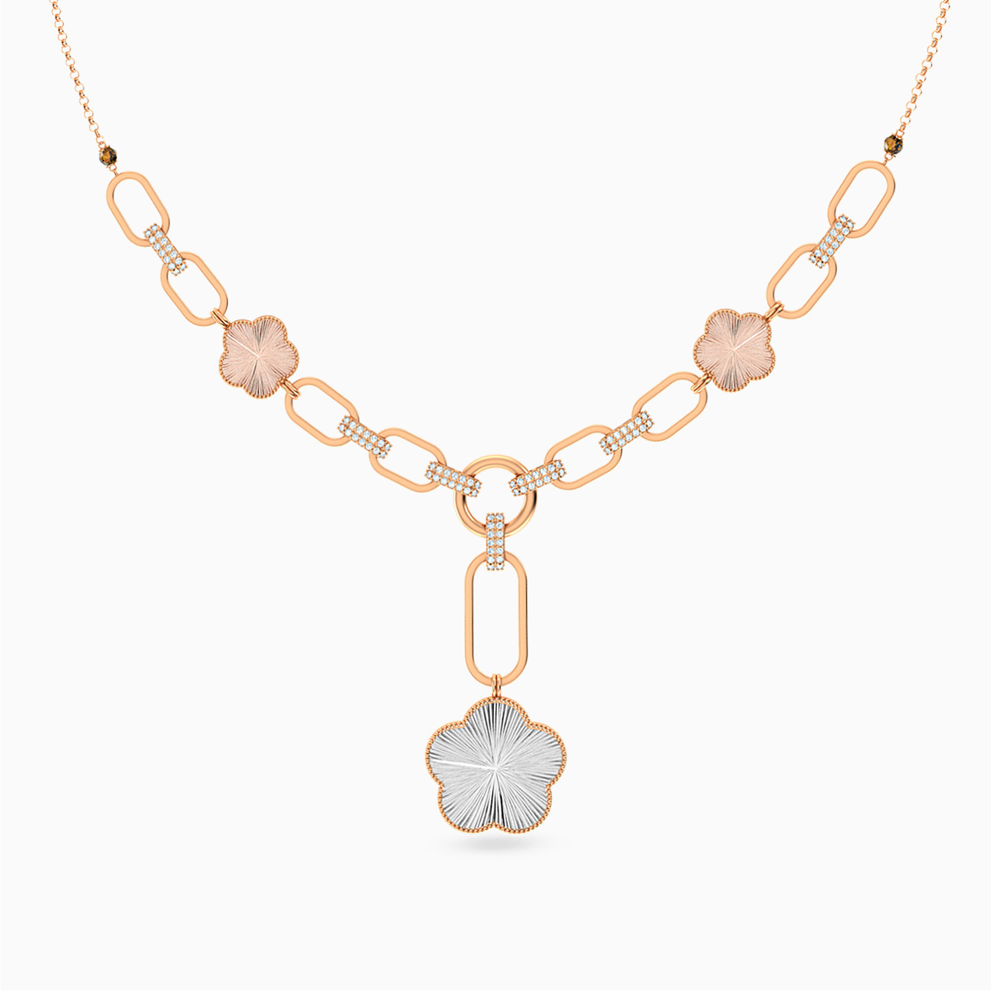 Modern design shines through in this 21-karat gold set from L'azurde Gold. The bold link accents and tricolored floral motifs give this set a contemporary look. Comprising of a necklace, ring, bracelet and pair of ear drops, this set will work beautifully over an evening outfit and will make a wonderful gift for a special woman.