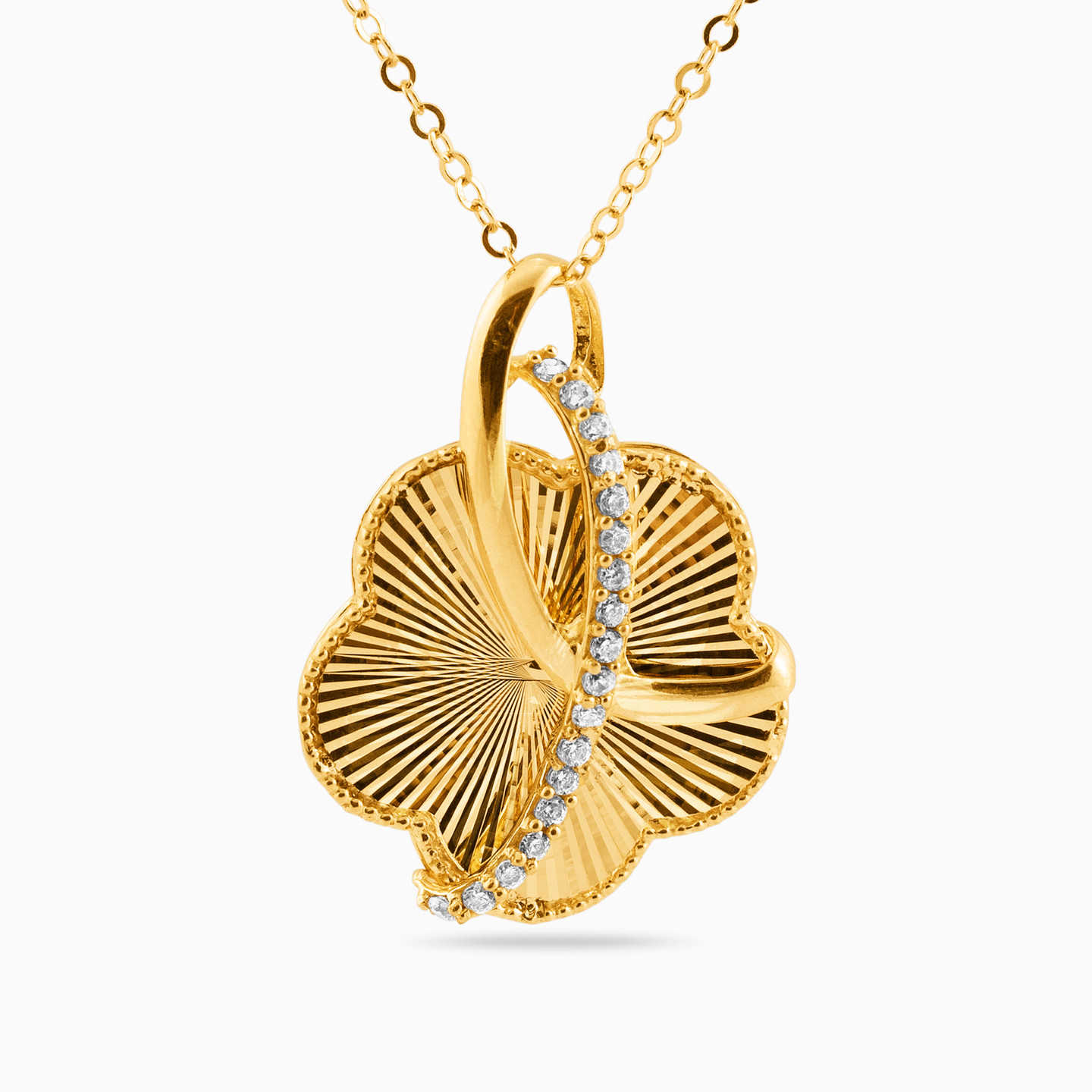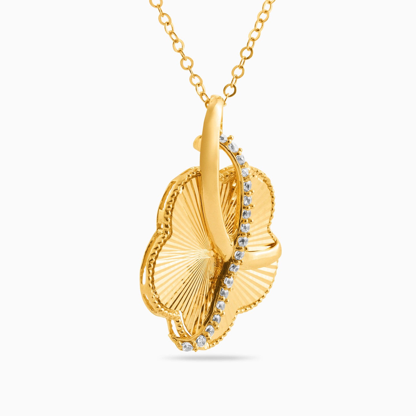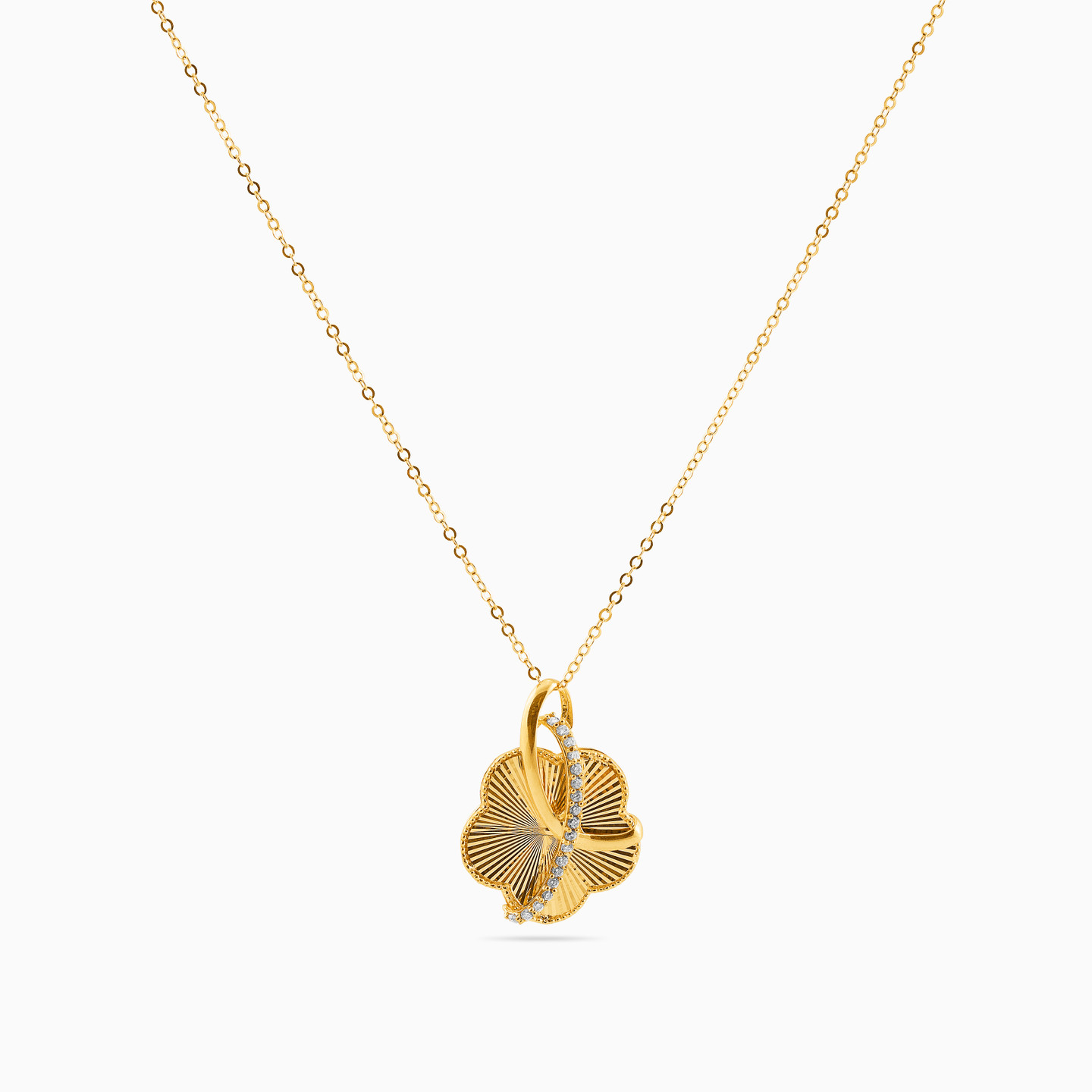 Inspired by flowers that bring joy and happiness to everyone around them comes this beauty from L'azurde Gold. It features a delicate 21-karat yellow gold chain and a textured flower pendant with two arcs around it, one yellow gold, and one cubic zirconia studded. Style it with a floral dress or top to complete the outfit.
