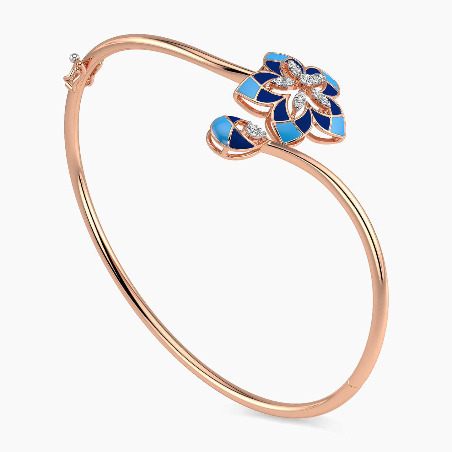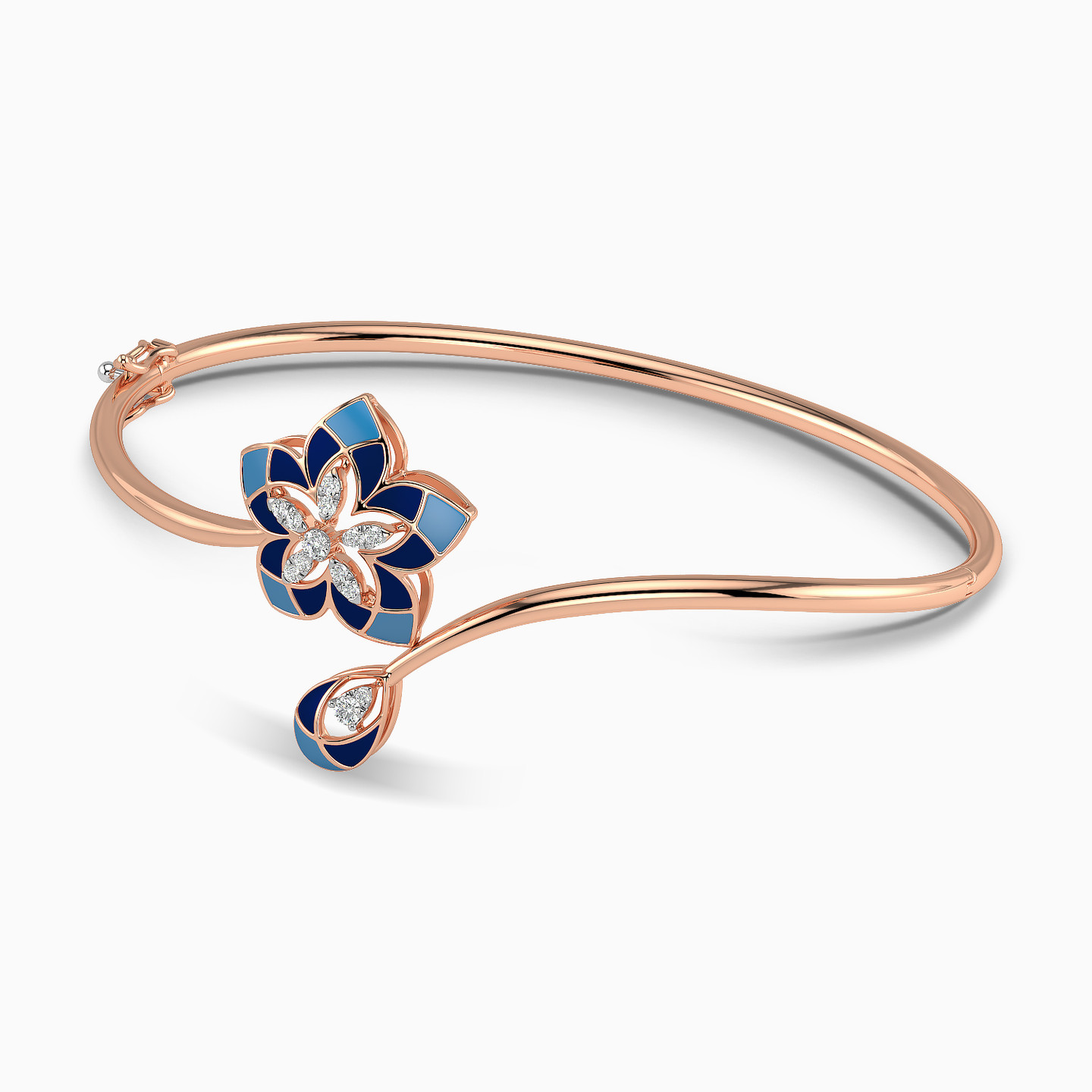 Shades of blue, sparkling diamonds, delicate floral patterns and a stunning 18-karat rose gold body. Different elements come together to create this exquisite and utterly gorgeous bangle bracelet by L’azurde Diamonds. The beautiful floral motif in the center features patterns made using enamel coating against a rose gold frame and studded with marquise-shaped diamonds. The delicate and intricate design of this bracelet is sure to leave every onlooker enchanted.