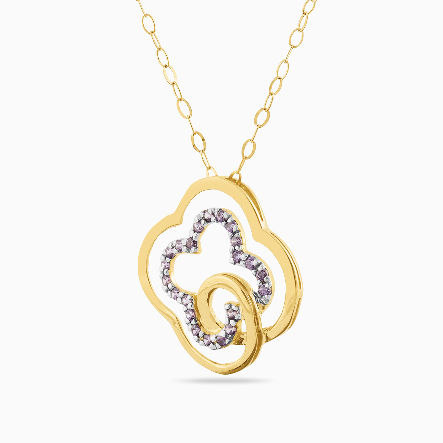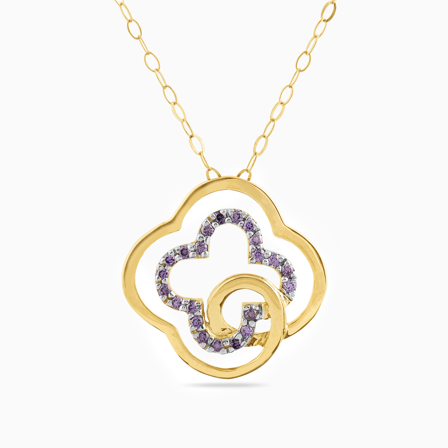 Add a stylish touch to your wardrobe with this unmistakably feminine pendant necklace from L'azurde Diamonds. Suspended from a delicate 18-karat yellow gold chain, this eye-catching pendant necklace features a double clover design dazzling with 0.01-carat brilliant-cut diamond accents and gorgeous purple colored stones. We suggest wearing this piece with a blouse or high neck garment for maximum effect.