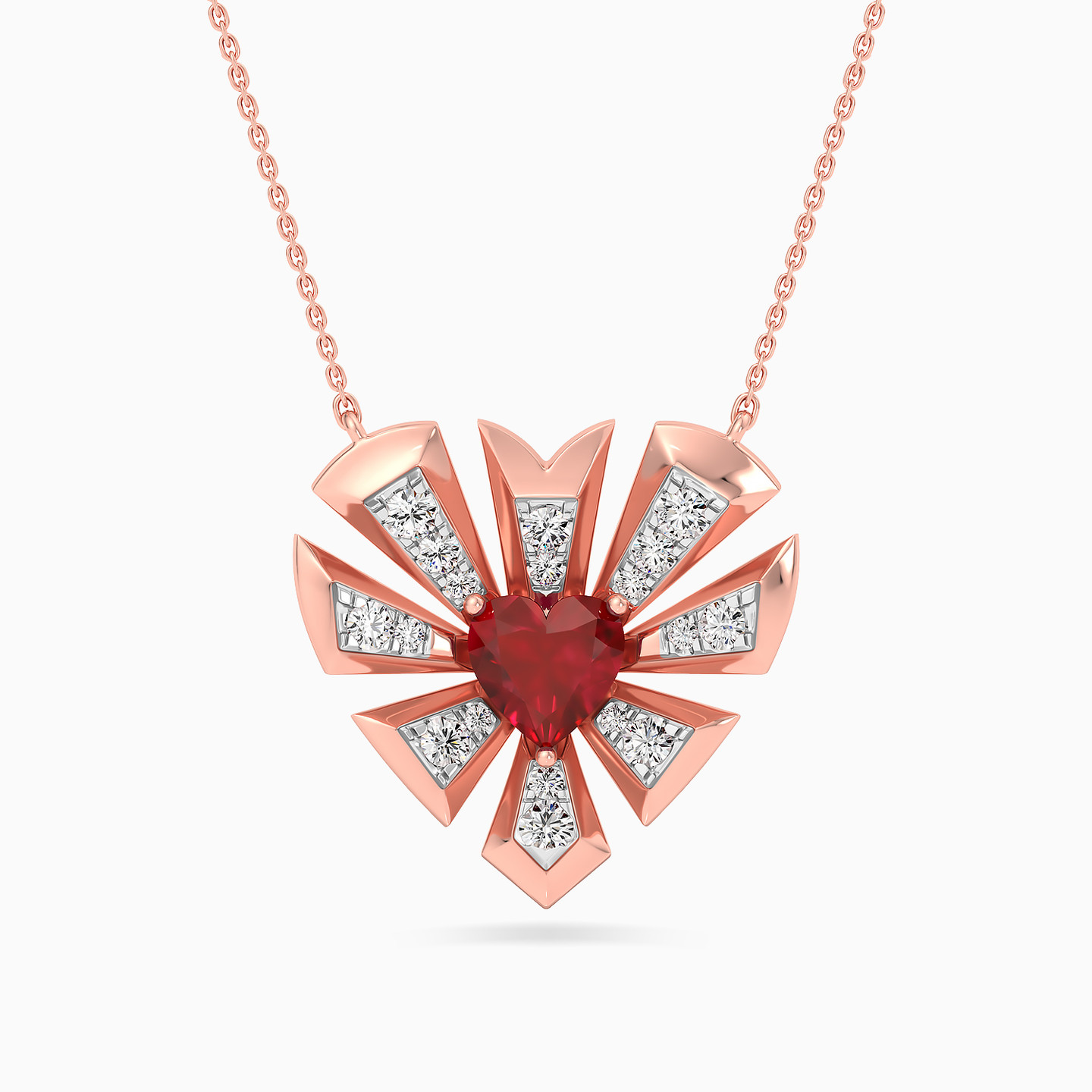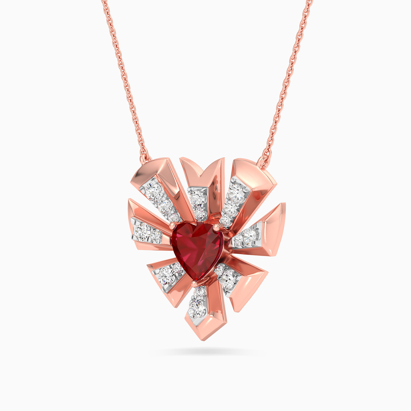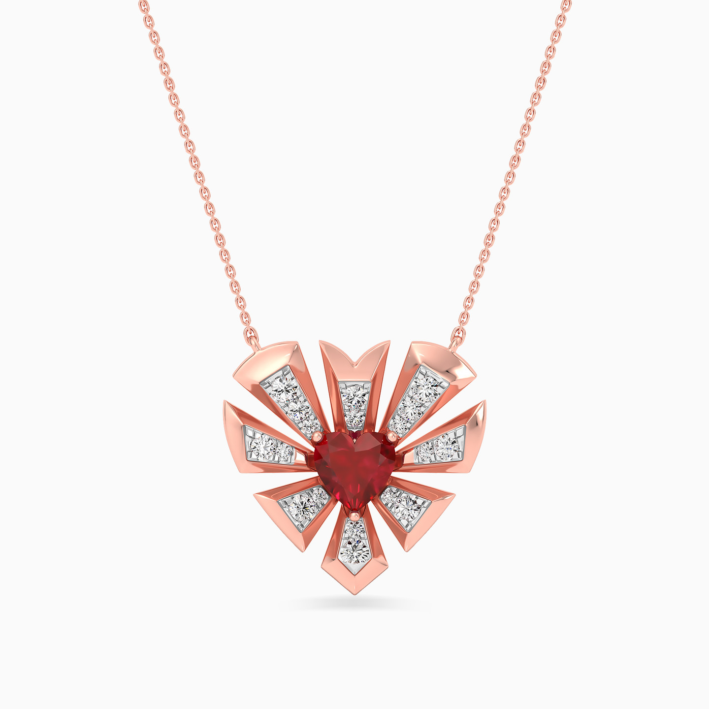 Ignite the flames of passion with this 18-karat rose gold pendant necklace from L'azurde Diamonds, a symphony of love and luxury. The classic chain gracefully showcases a breathtaking pendant, where a radiant heart-shaped ruby red colored stone takes center stage, embraced by an artful assembly of geometric shapes forming a captivating heart frame. Each geometric facet is adorned with the brilliance of brilliant cut diamonds, creating a kaleidoscope of sparkle that mirrors the depth and intensity of your enduring love.