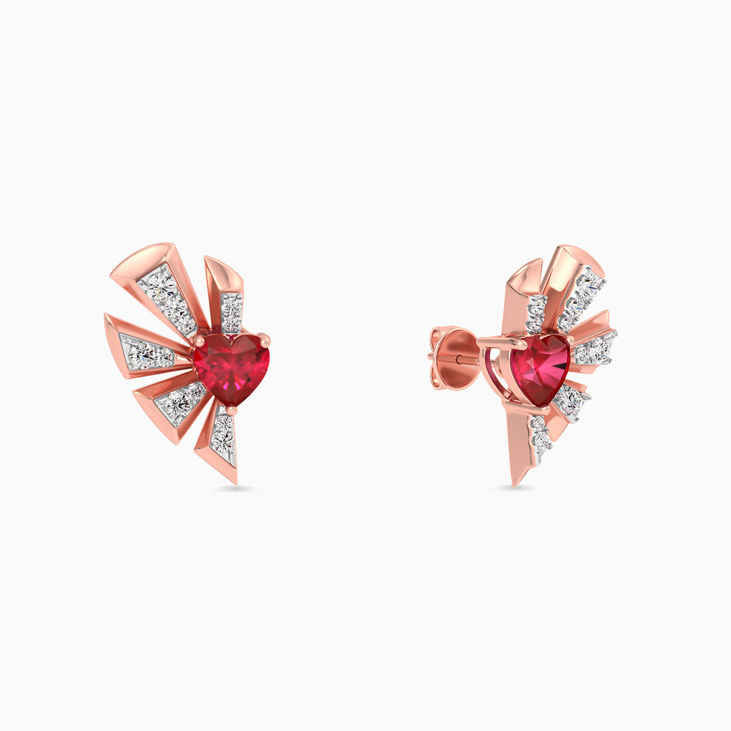 Heart Diamond & Red Stone Stud Earrings in 18K Gold