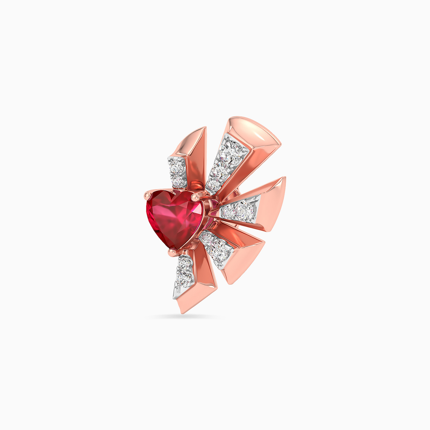 Steal the spotlight this Valentine's Day with these 18-karat rose gold stud earrings from L'azurde Diamonds - a love-infused spectacle! Each stud showcases a heart-shaped red colored stone, set on three prongs, and surrounded on one side by sassy geometric motifs bedazzled with brilliant cut diamonds. Combine the two studs, and voila! They join forces to form a sparkling heart, just like the union of two hearts in love! These earrings are not just jewelry, but a symbol of your romantic unity.