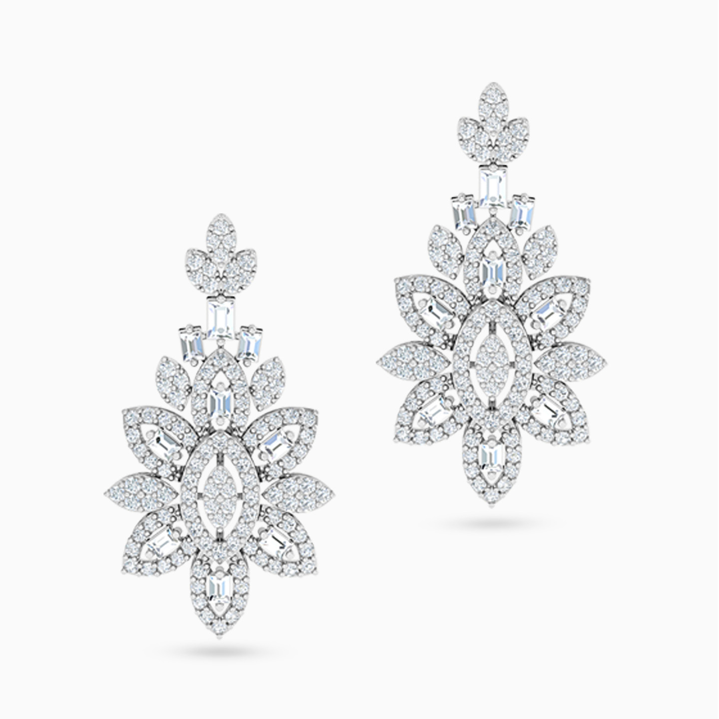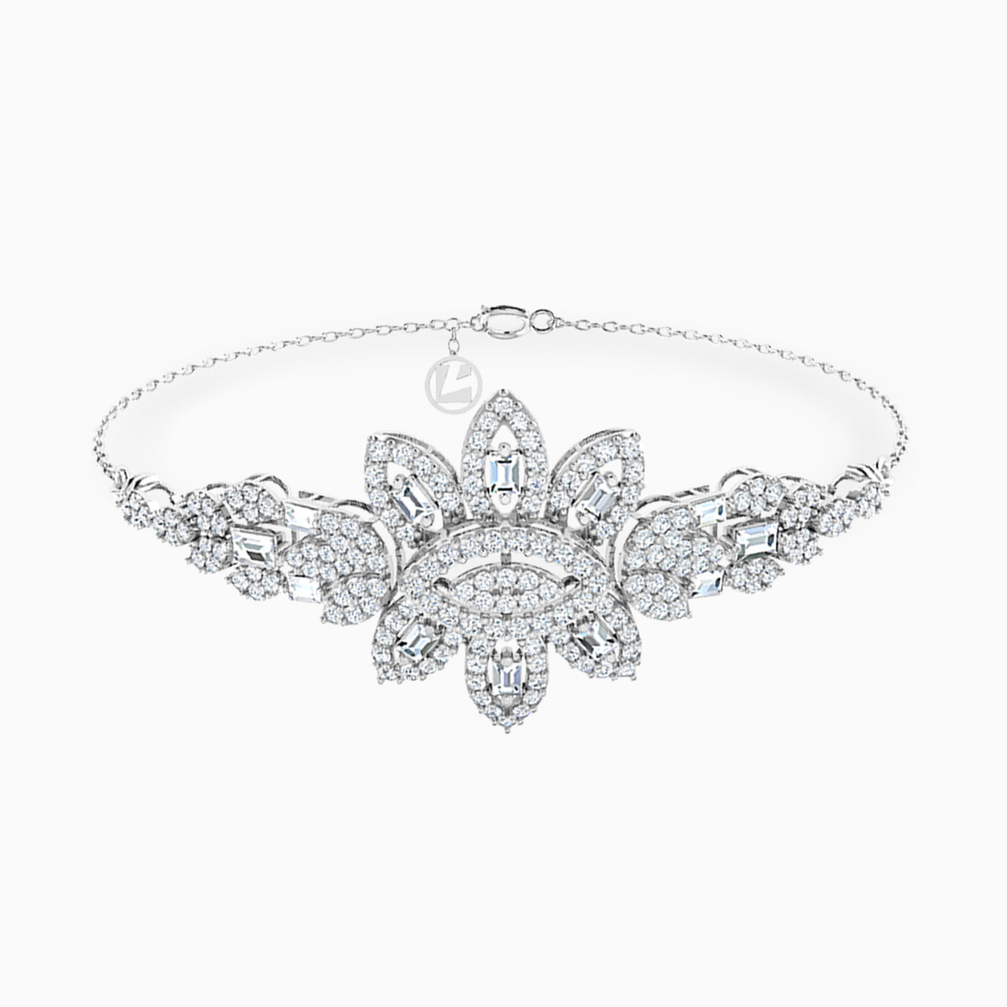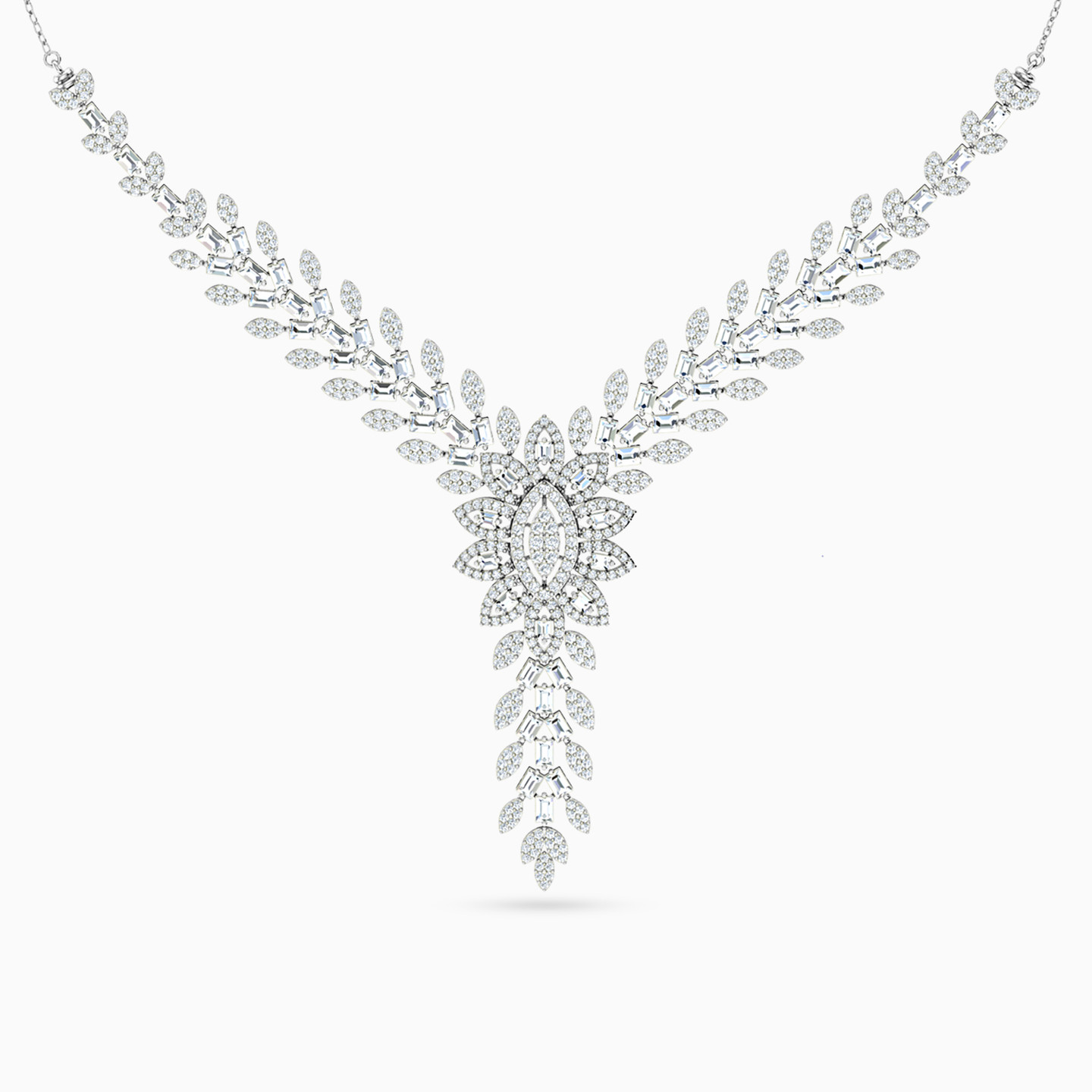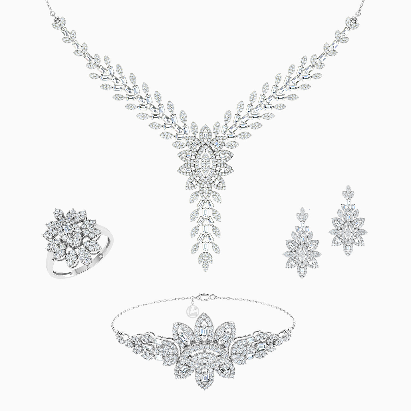 Inspired by royalty, this set will add an element of luxury to your occasion wear. The graceful leaf design in the necklace and the style in which it curves has our heart. Cast in 18-karat white gold with stone detail, this set also comprises of a bracelet, a pair of ear drops and a ring.