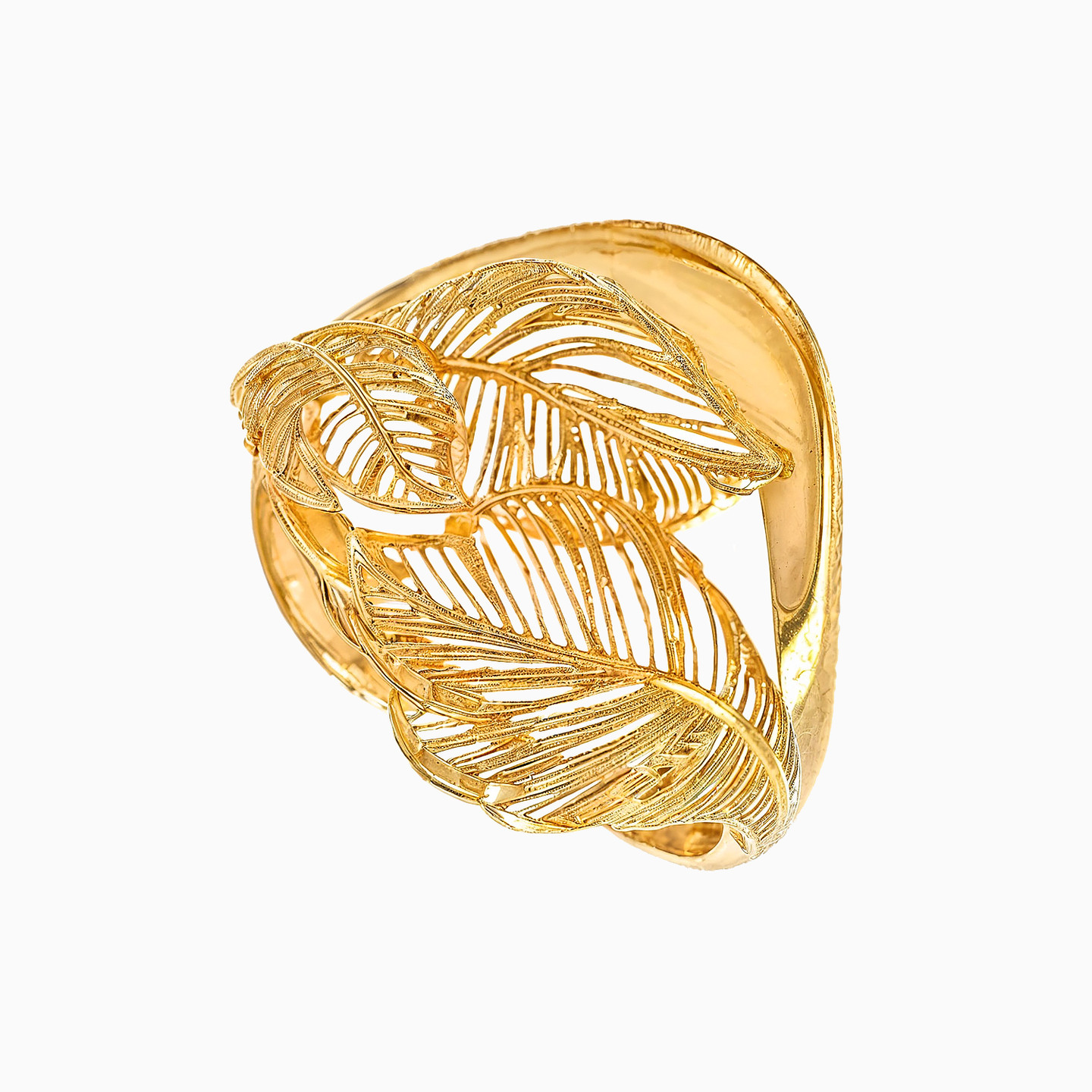 A ring so unique, it can make any day or evening outfit look fabulous in an instant. The cutwork leaf design on this 21-karat yellow gold ring lends a feminine elegance while making sure it stands out. We recommend teaming this up with a pair of statement earrings to complete the look.