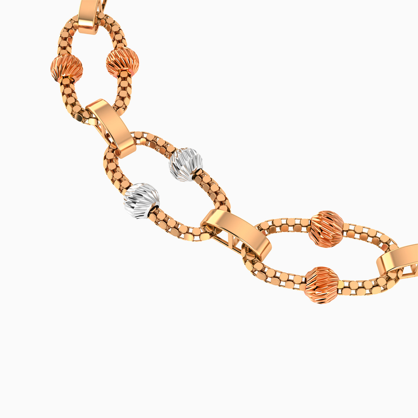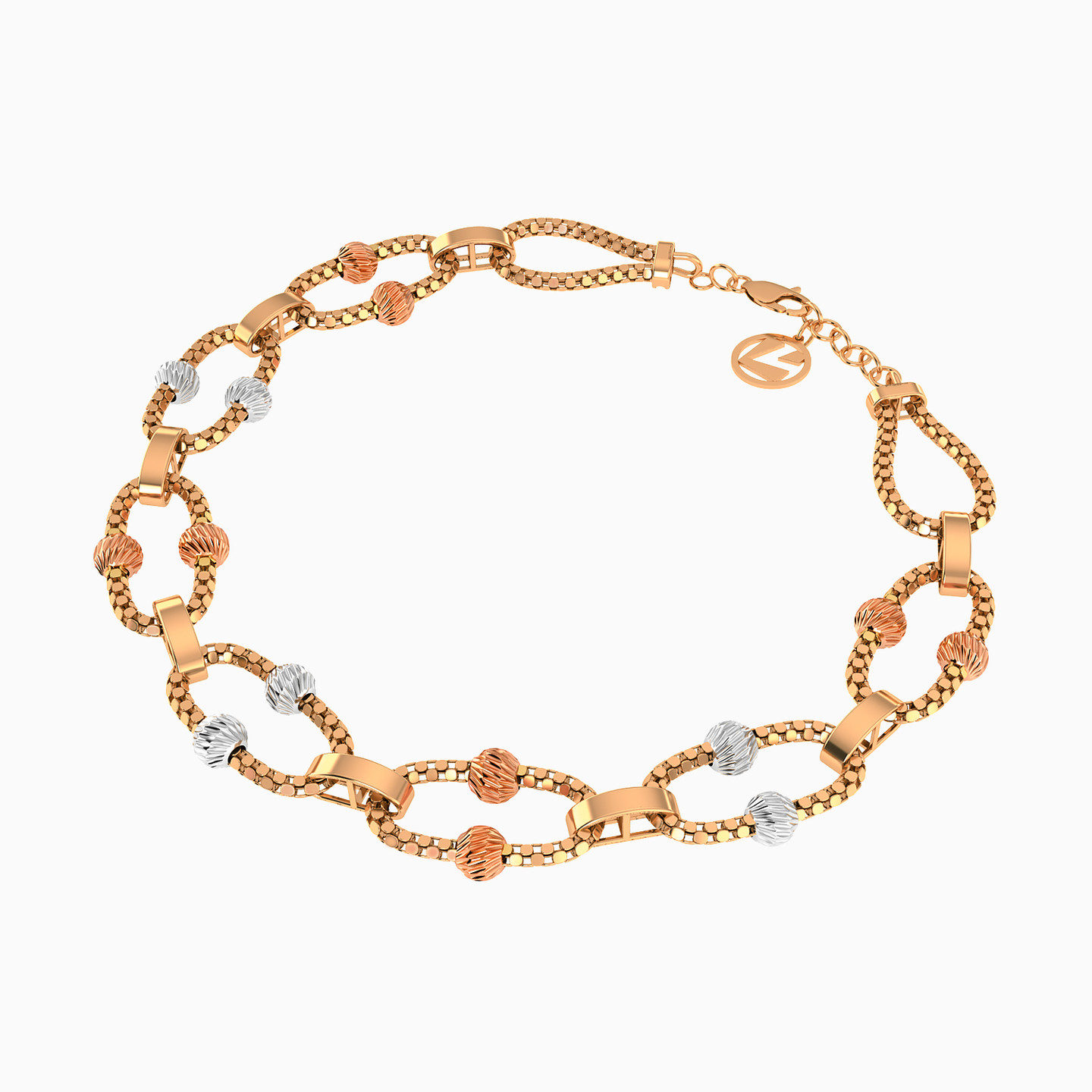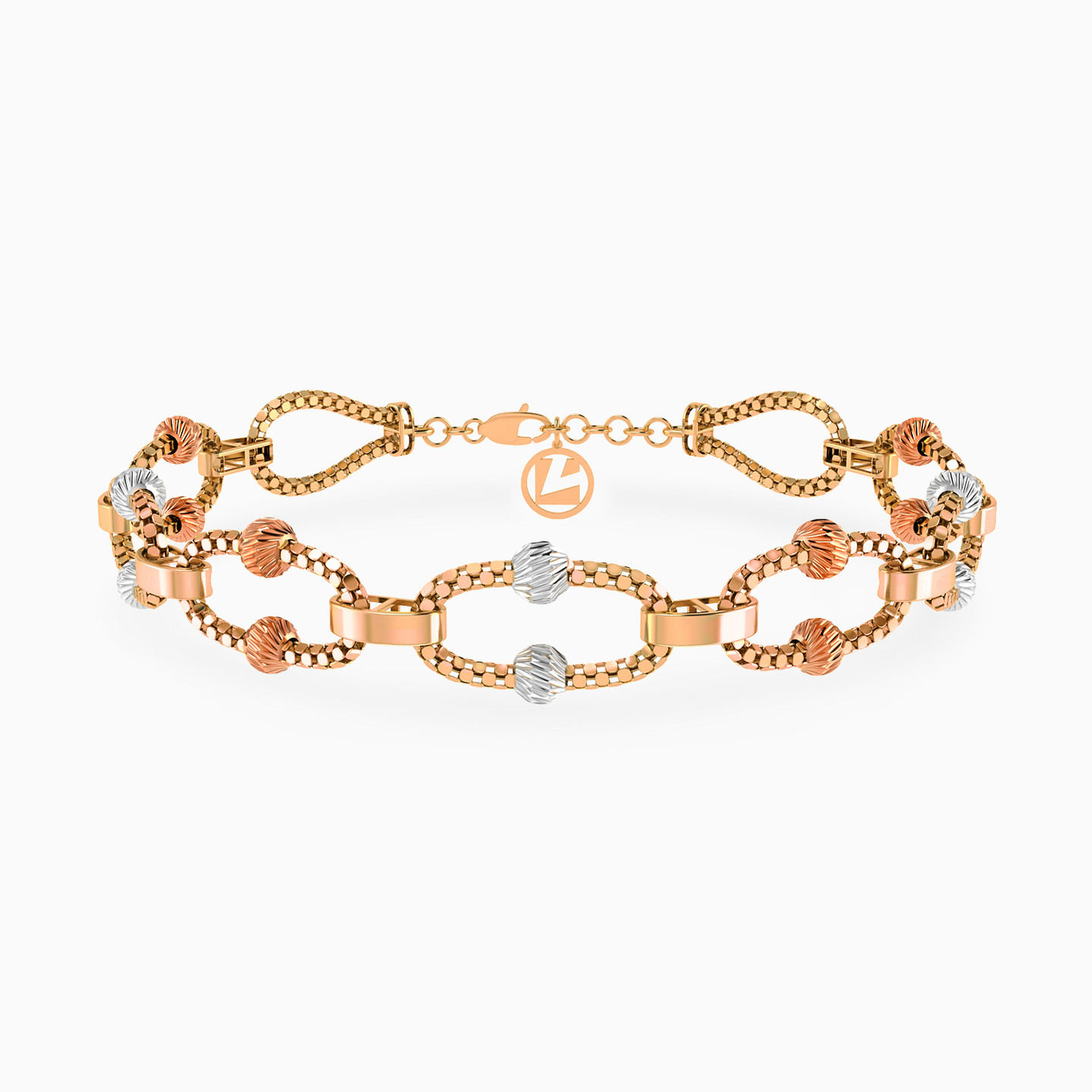 This chain bracelet from L'azurde Gold showcases a dazzling arrangement of texture and harmony! It features stunning links made of 21-karat rose gold rope chains, connected by oval-shaped split links for a playful touch. Adorned with alternating textured white and rose gold beads on top and bottom, this arrangement gracefully ends in beautiful yellow gold rope chain loops at each end, making it a bracelet that seamlessly blends sophistication with chic style. Perfect for adding a bold edge to any outfit.