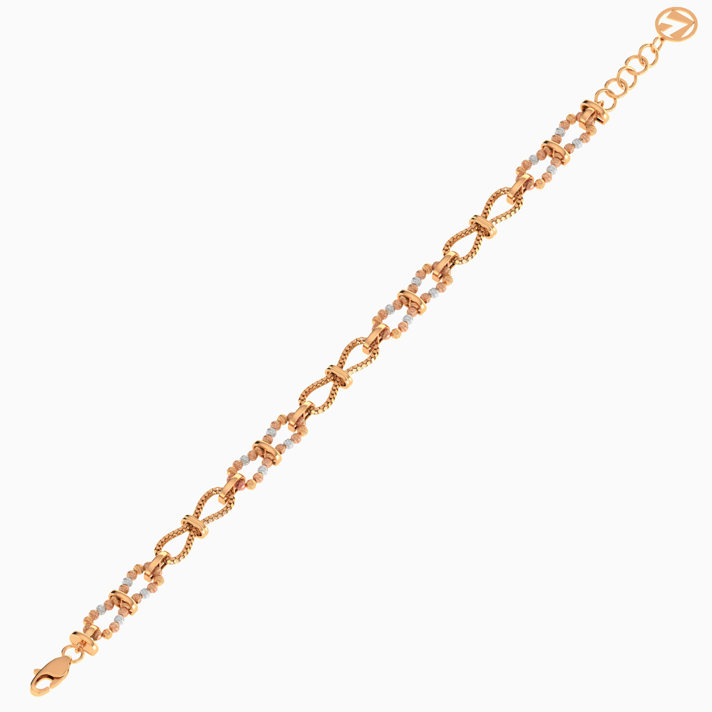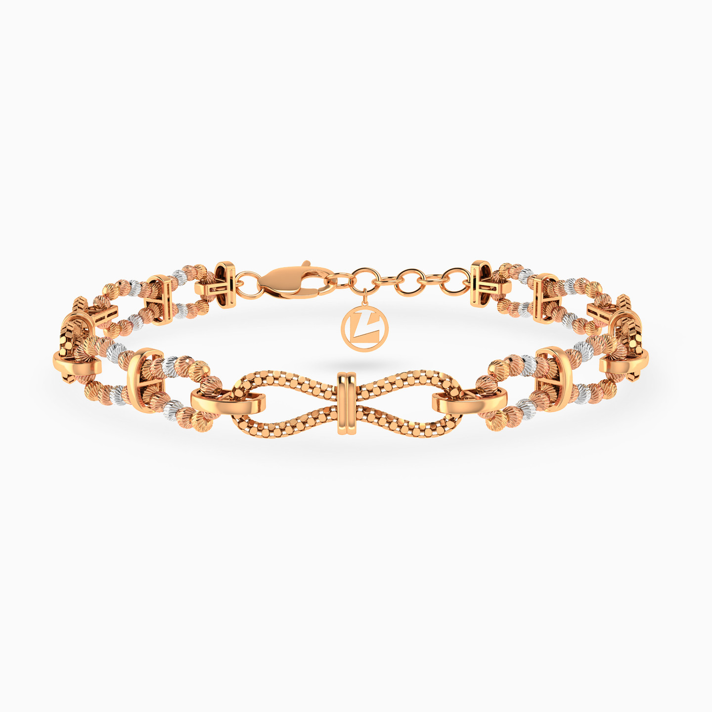 An eternal fusion chain bracelet by L'azurde Gold where style and symbolism unite in a dazzling dance of gold! It features 21-karat textured round yellow, white and rose gold beads, forming exquisite eternity symbols with paper clip split links at the center, adorn the length of this bracelet, signifying endless love and timeless elegance. At its heart, a rope chain eternity symbol takes center stage, seamlessly clipped by sleek bars, making this accessory perfect for celebrating eternal bonds and chic fashion.