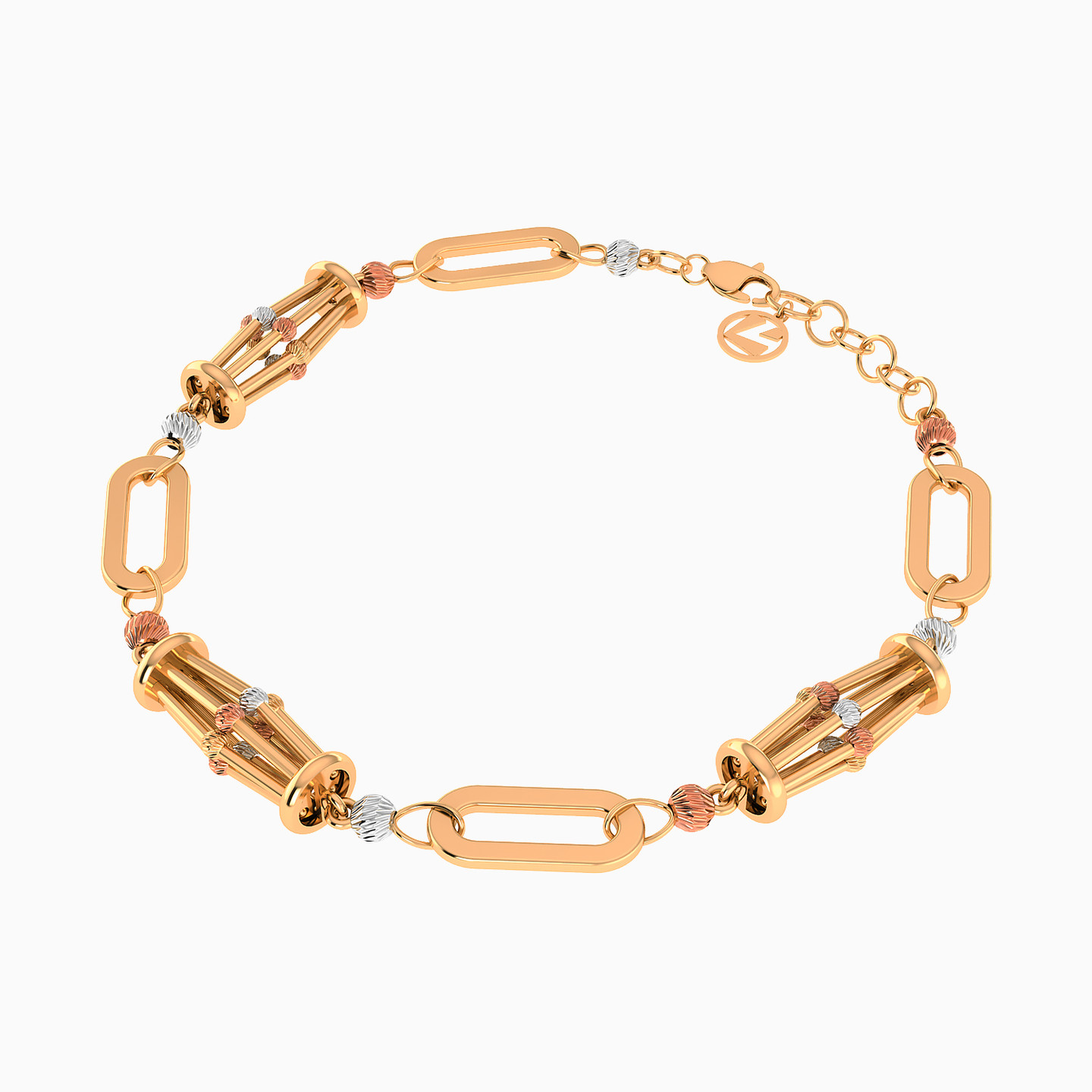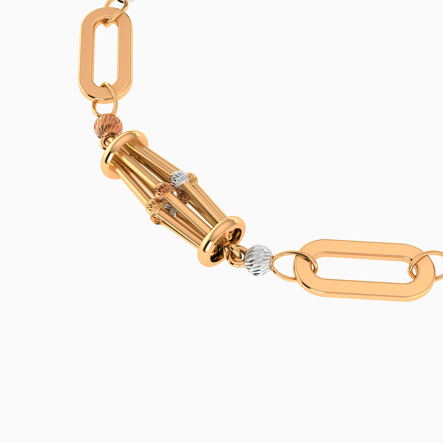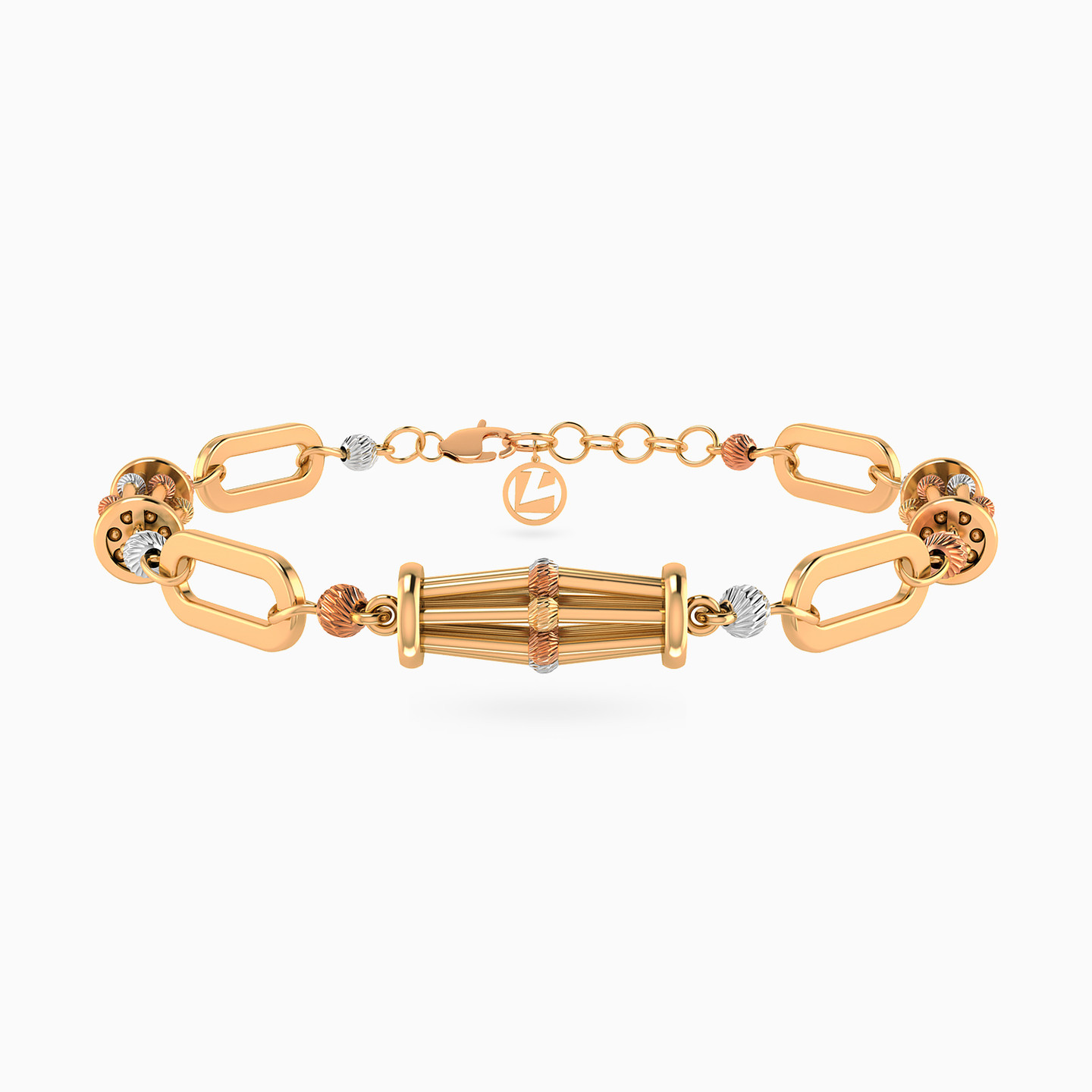 Introducing a chain bracelet by L'azurde Gold where sophistication meets playful charm in every link! The length of the bracelet features alternating elongated oval-shaped links and a captivating motif formed by sleek bars coming together to form a circular design and adorned with textured 21-karat rose, yellow, and white gold beads at the center. This bracelet is a celebration of elegance, textures, and shine, making it the perfect accessory to elevate your look for a special occasion.