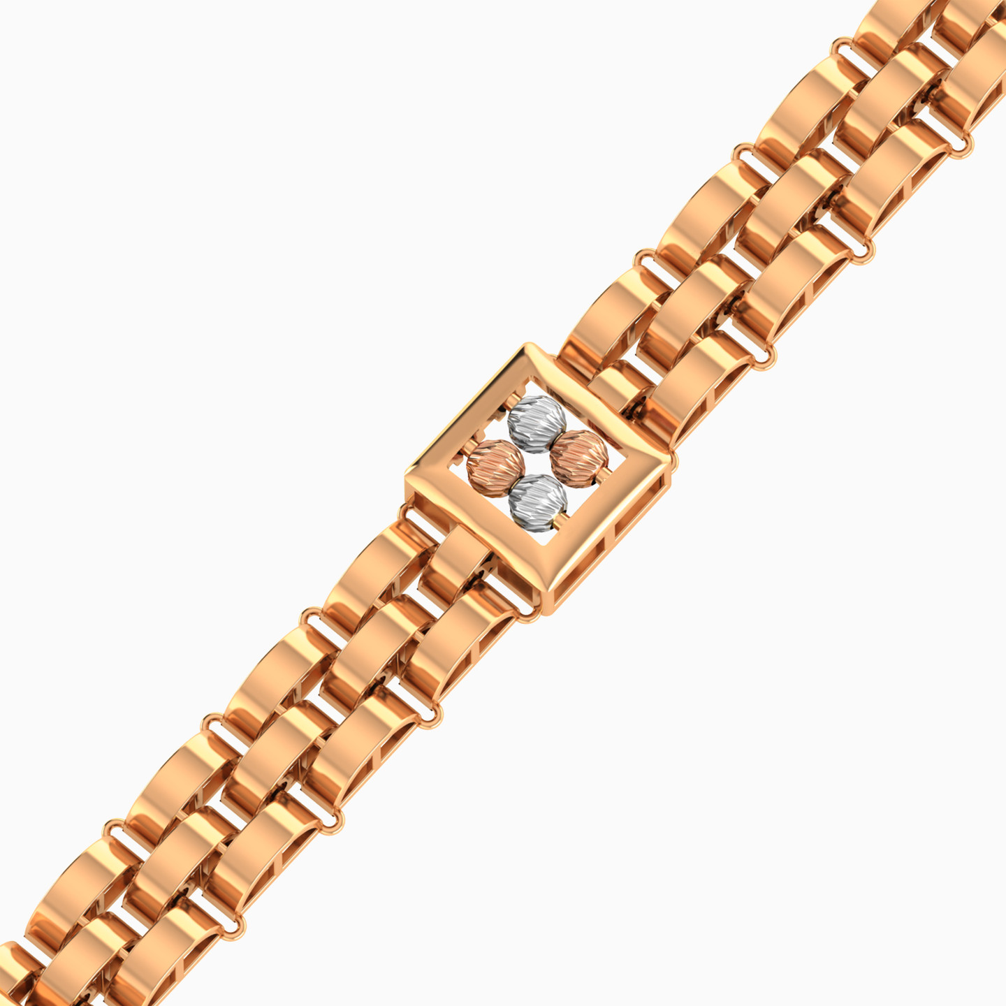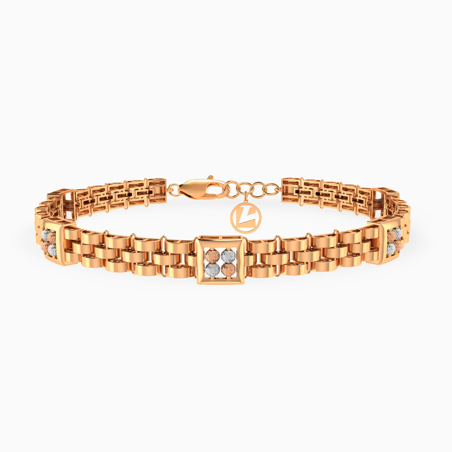 Elevate your wrist game with this 21-karat yellow gold chain bracelet from L'azurde Gold. It showcases three rows of tightly woven links, reminiscent of a stylish brick wall, adding an edgy twist to your look. Nestled between these links, square-shaped sleek frames with an open frame design are adorned with four alternating textured white and rose gold beads, creating a playful rhythm that's perfect for making a fashionable statement wherever you go!