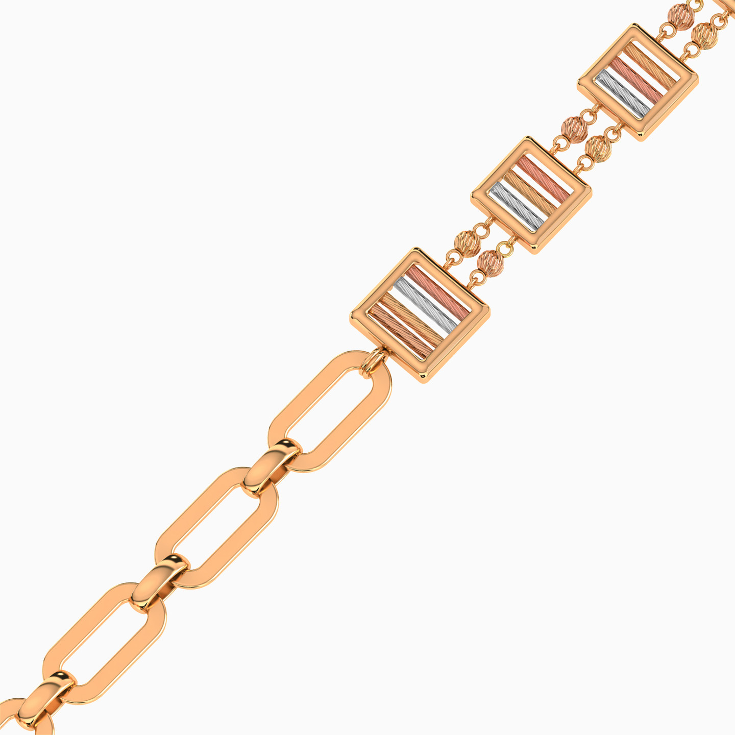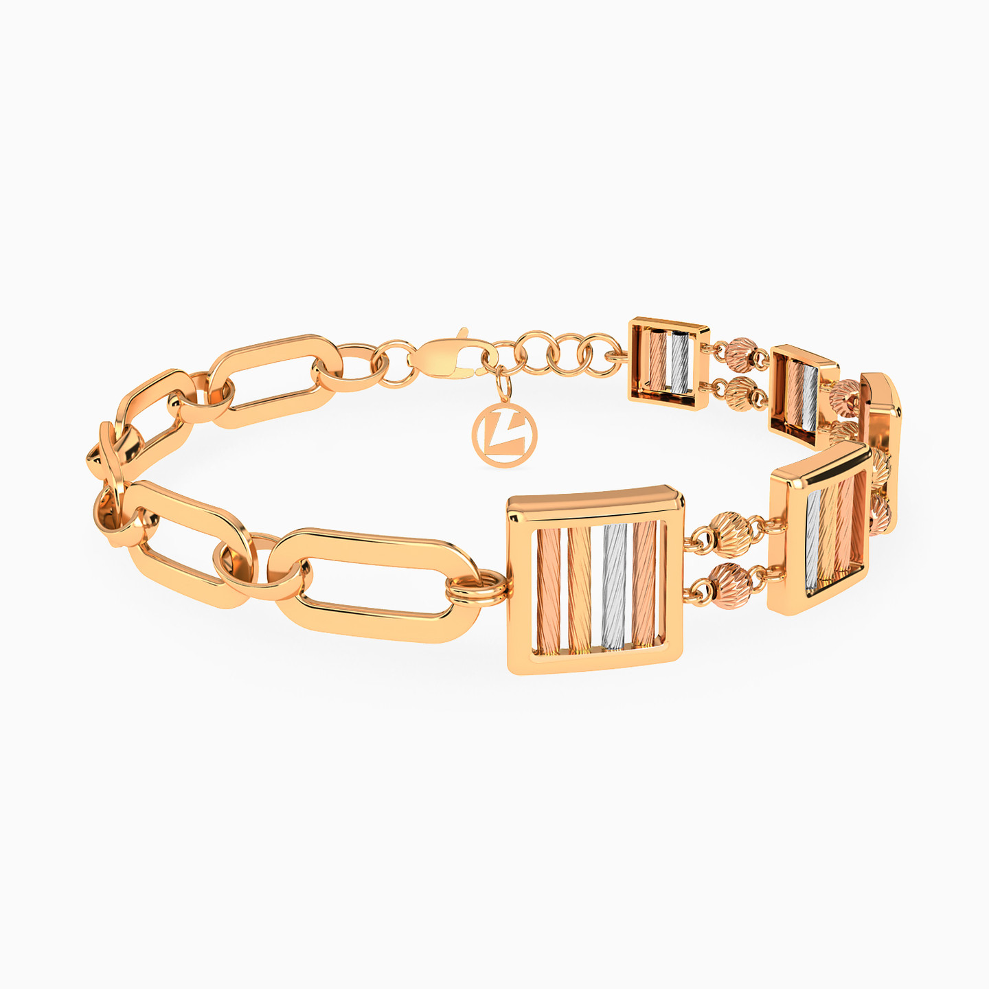 Unleash your inner fashionista with this 21-karat yellow gold chain bracelet from L'azurde Gold, a symphony of textures and shapes that's perfect for making a stylish statement! On one side, classic chunky links connected by small loops create a bold and timeless look, while on the other side, stunning square-shaped frames adorned with textured bars made of yellow, rose and white gold are connected to each other by two textured rose gold beads, adding a touch of elegance and flair to this fashion-forward accessory. It's a bracelet that perfectly balances classic charm with modern fun.