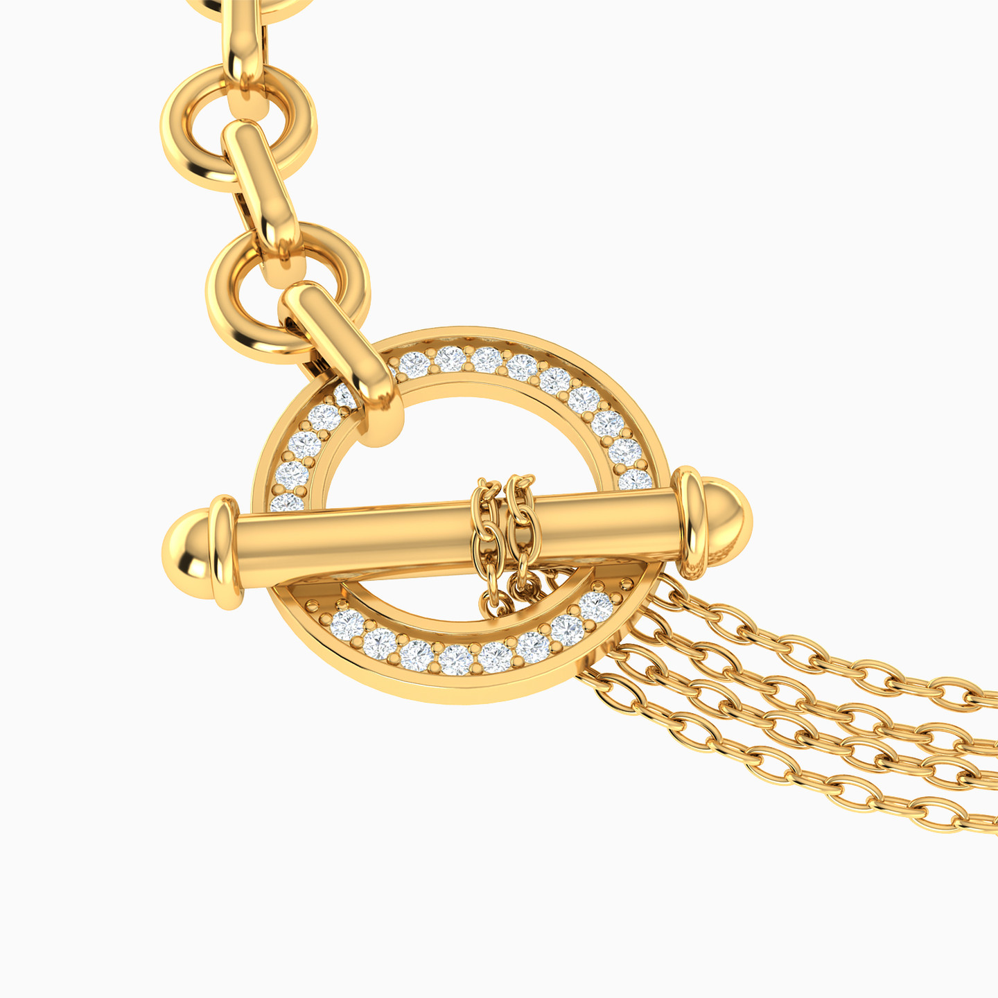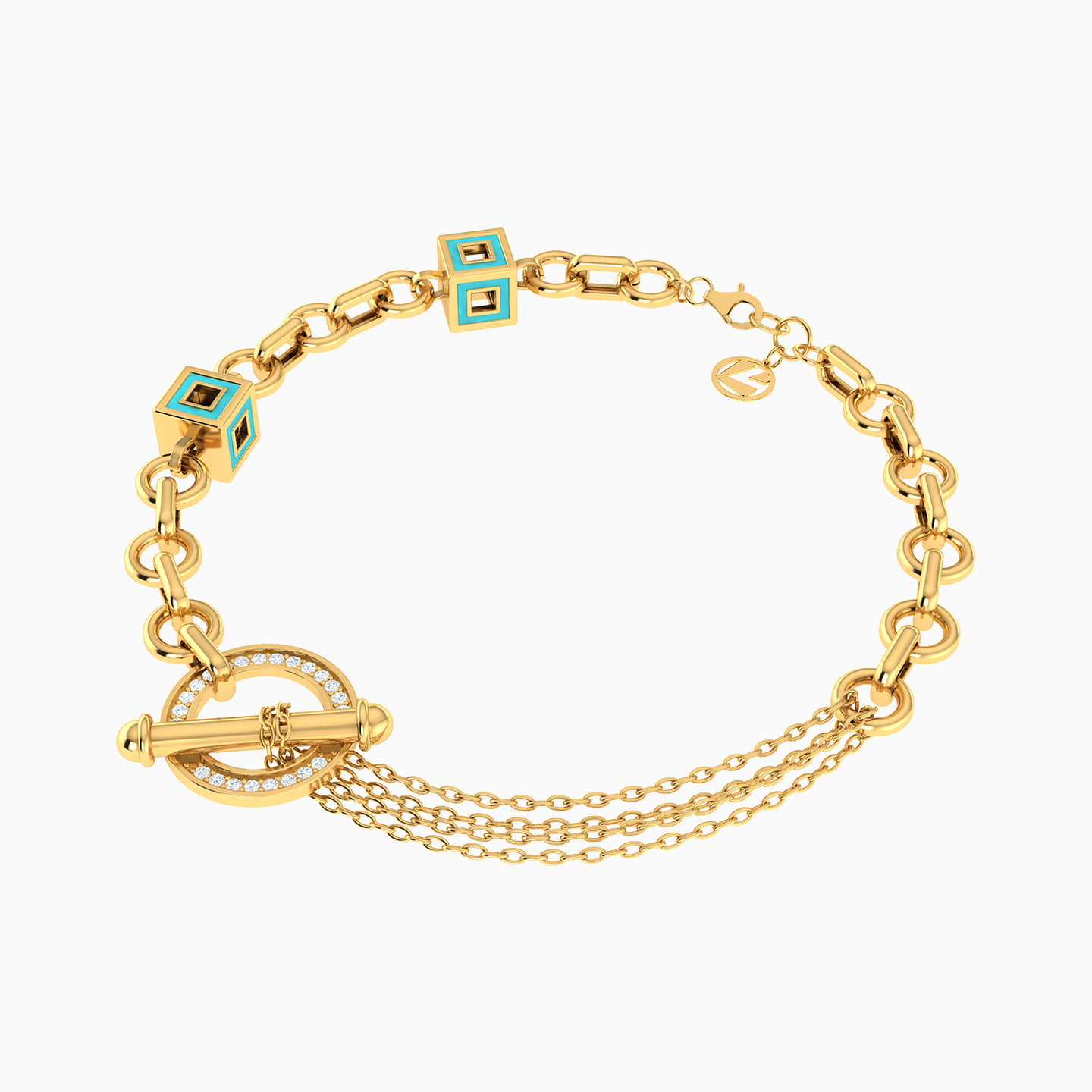 Prepare to turn heads by wearing this gorgeous 18-karat yellow gold bracelet from L'azurde Gold on your wrist. This exquisite bracelet is a stunning combination of round gold links, dainty layered chains, cubic zirconia accents and enamel-coated turquoise colored blocks that add eye-catching beauty to the one-of-a-kind design. With this eye-catching toggle chain bracelet in your jewelry repertoire, you'll be unstoppable.
