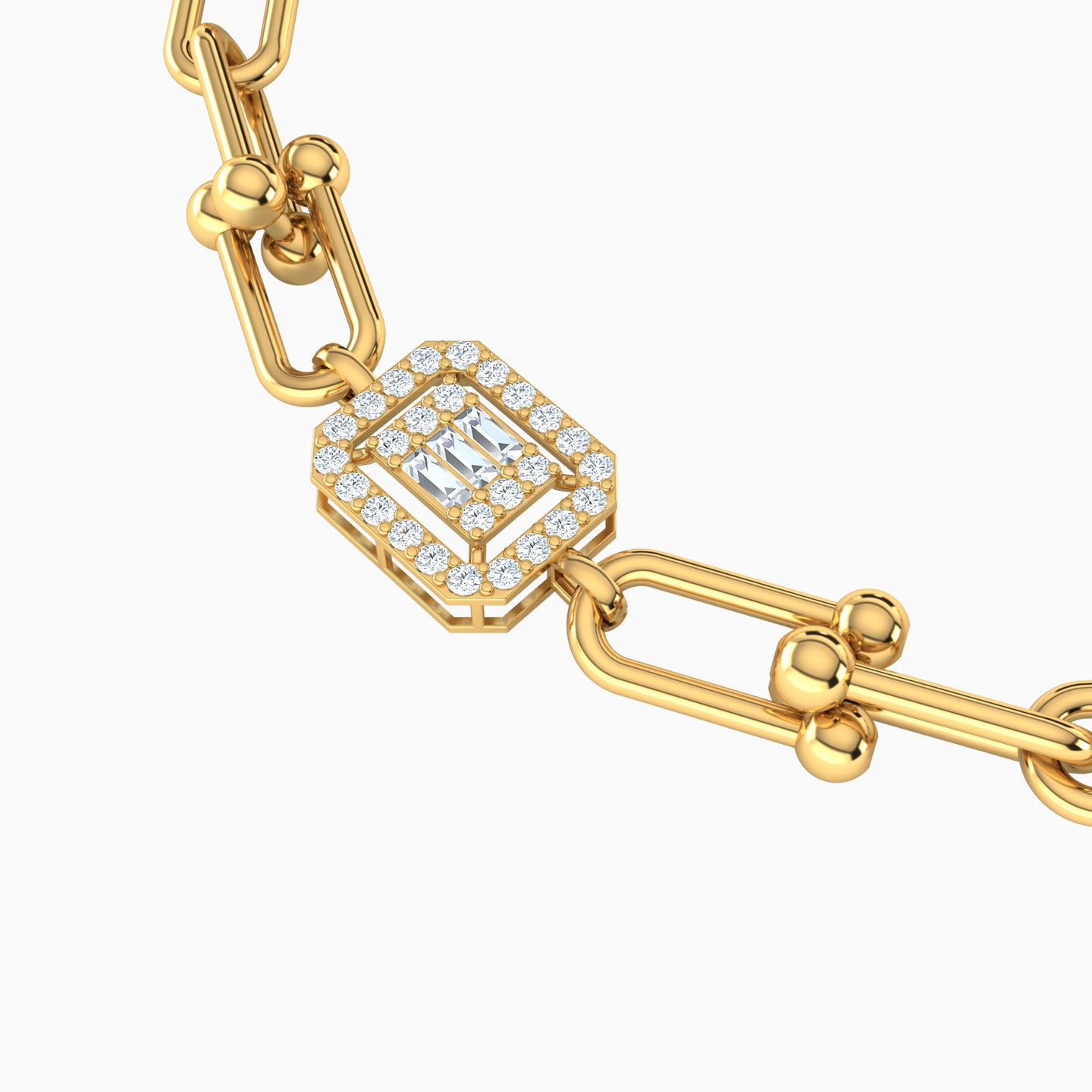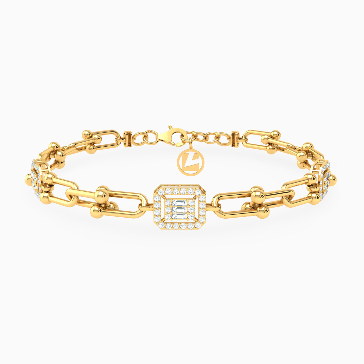 A 18-karat yellow gold chain bracelet from L'azurde Gold, celebrating the art of shape and shine. It features U-shaped paper clip links, connected in opposite directions, creating a playful design. Adorned with three hexagon-shaped frames, beautifully studded with round and baguette-shaped cubic zirconia, this bracelet adds a touch of geometric glamour to your look, ensuring you shine from every angle. It's a chic and elegant accessory that is perfect for elevating any outfit and making a stylish statement!