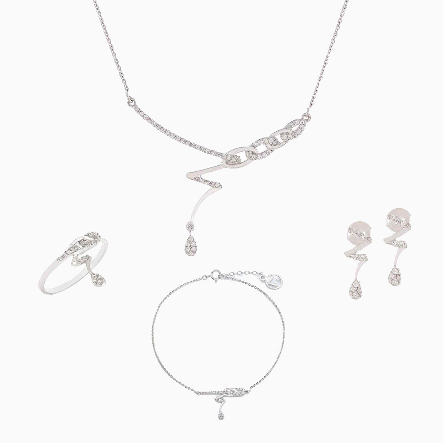 Here's a playful take on everyday accessorizing. Fit for minimal styling from AM to PM, this 18-karat white gold set from L'azurde Gold comes with a necklace, bracelet, drop earrings and a ring. Dotted with cubic zirconia stones, it also features a zigzag motif that drops into a pear-shaped accent. Wear this as an entire set or mix and match two pieces to go with your outfit.